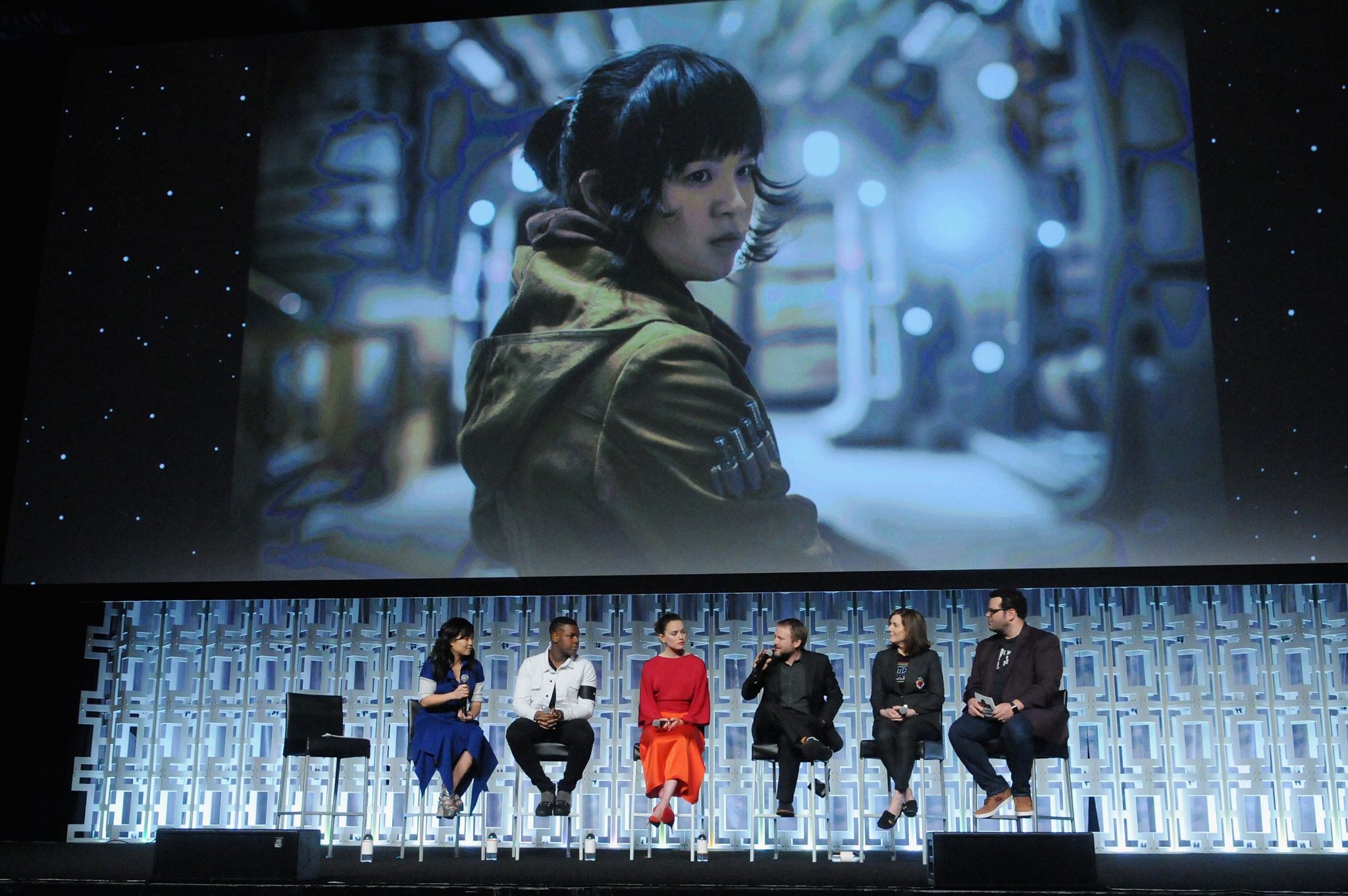 ORLANDO, FL – APRIL 14: Kelly Marie Tran, John Boyega, Daisy Ridley, Rian Johnson, Kathleen Kennedy and Josh Gad attend the STAR WARS: THE LAST JEDI PANEL during the 2017 STAR WARS CELEBRATION at Orange County Convention Center on April 14, 2017 in Orlando, Florida. (Photo by Gerardo Mora/Getty Images for Disney) *** Local Caption *** Kelly Marie Tran;John Boyega;Daisy Ridley;Rian Johnson;Kathleen Kennedy;Josh Gad