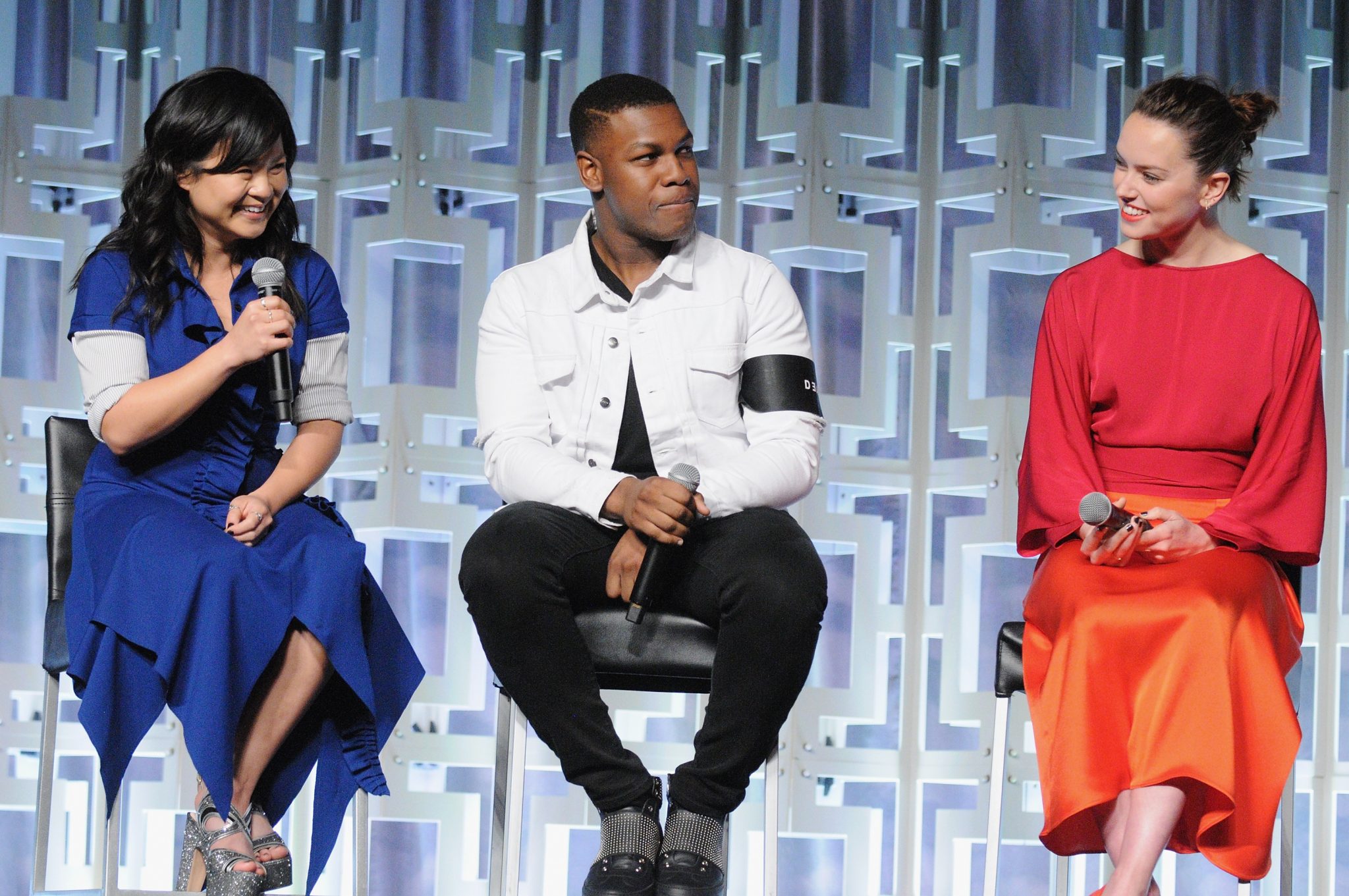 ORLANDO, FL – APRIL 14: Kelly Marie Tran, John Boyega and Daisy Ridley attend the STAR WARS: THE LAST JEDI PANEL during the 2017 STAR WARS CELEBRATION at Orange County Convention Center on April 14, 2017 in Orlando, Florida. (Photo by Gerardo Mora/Getty Images for Disney) *** Local Caption *** Kelly Marie Tran;John Boyega;Daisy Ridley
