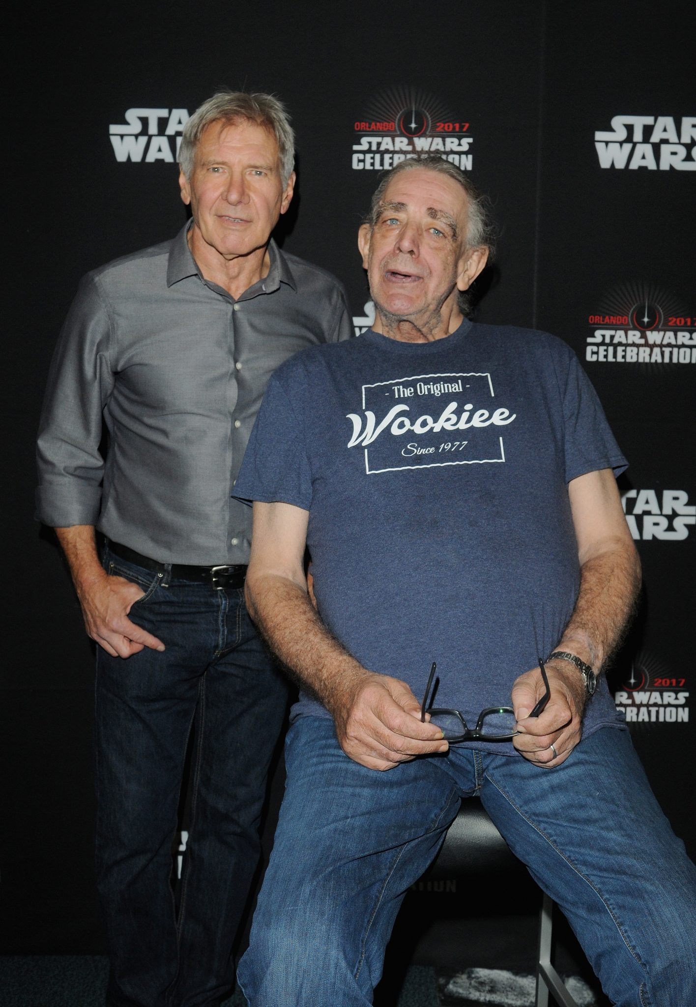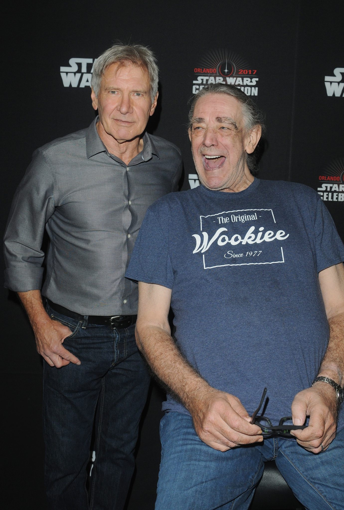 ORLANDO, FL – APRIL 13: Harrison Ford and Peter Mayhew attend the 40 YEARS OF STAR WARS PANEL during the 2017 STAR WARS CELEBRATION at Orange County Convention Center on April 13, 2017 in Orlando, Florida. (Photo by Gerardo Mora/Getty Images for Disney) *** Local Caption *** Harrison Ford;Peter Mayhew