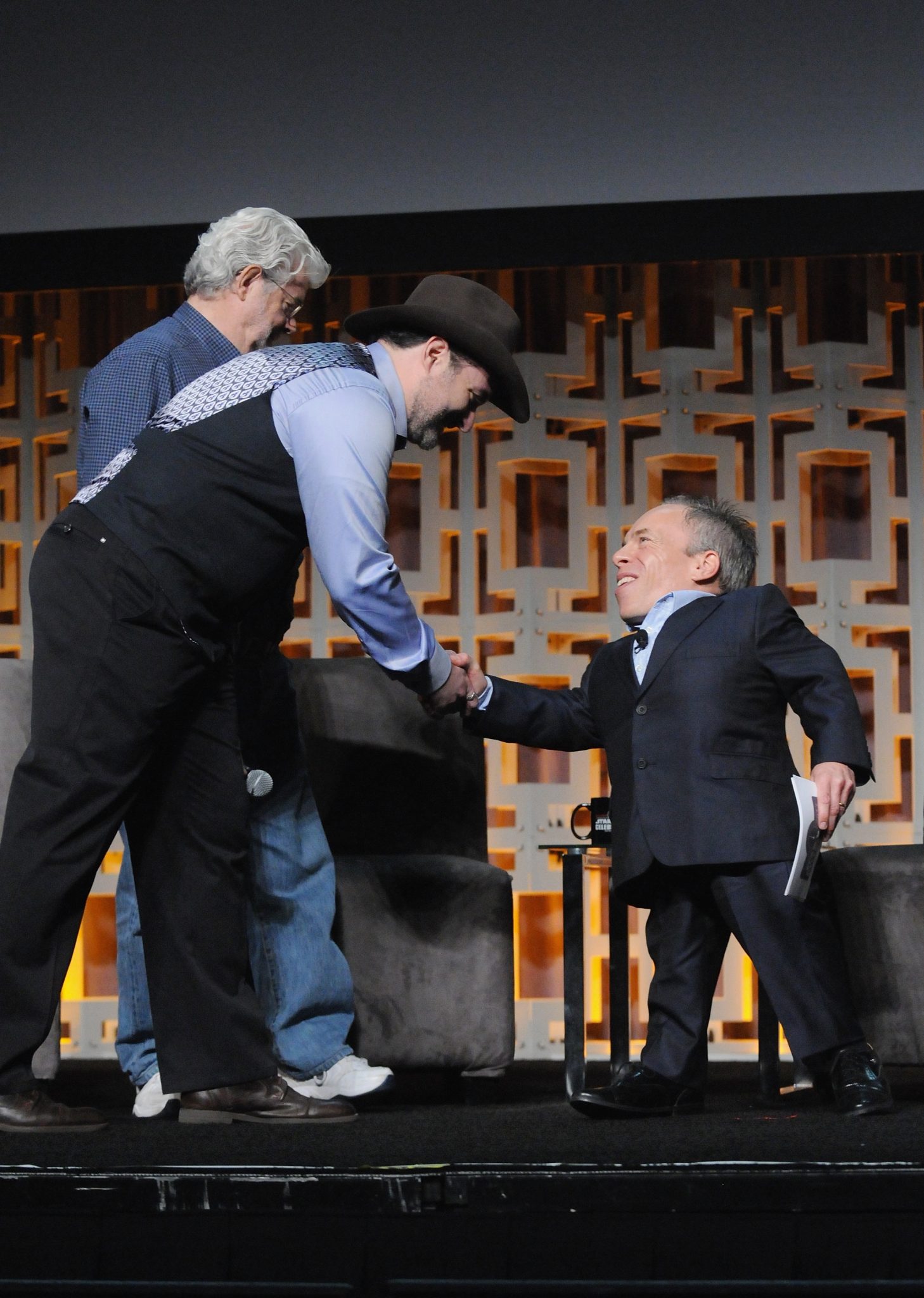 ORLANDO, FL – APRIL 13: George Lucas and Warwick Davis attend the 40 YEARS OF STAR WARS PANEL during the 2017 STAR WARS CELEBRATION at Orange County Convention Center on April 13, 2017 in Orlando, Florida. (Photo by Gerardo Mora/Getty Images for Disney) *** Local Caption *** George Lucas, Warwick Davis