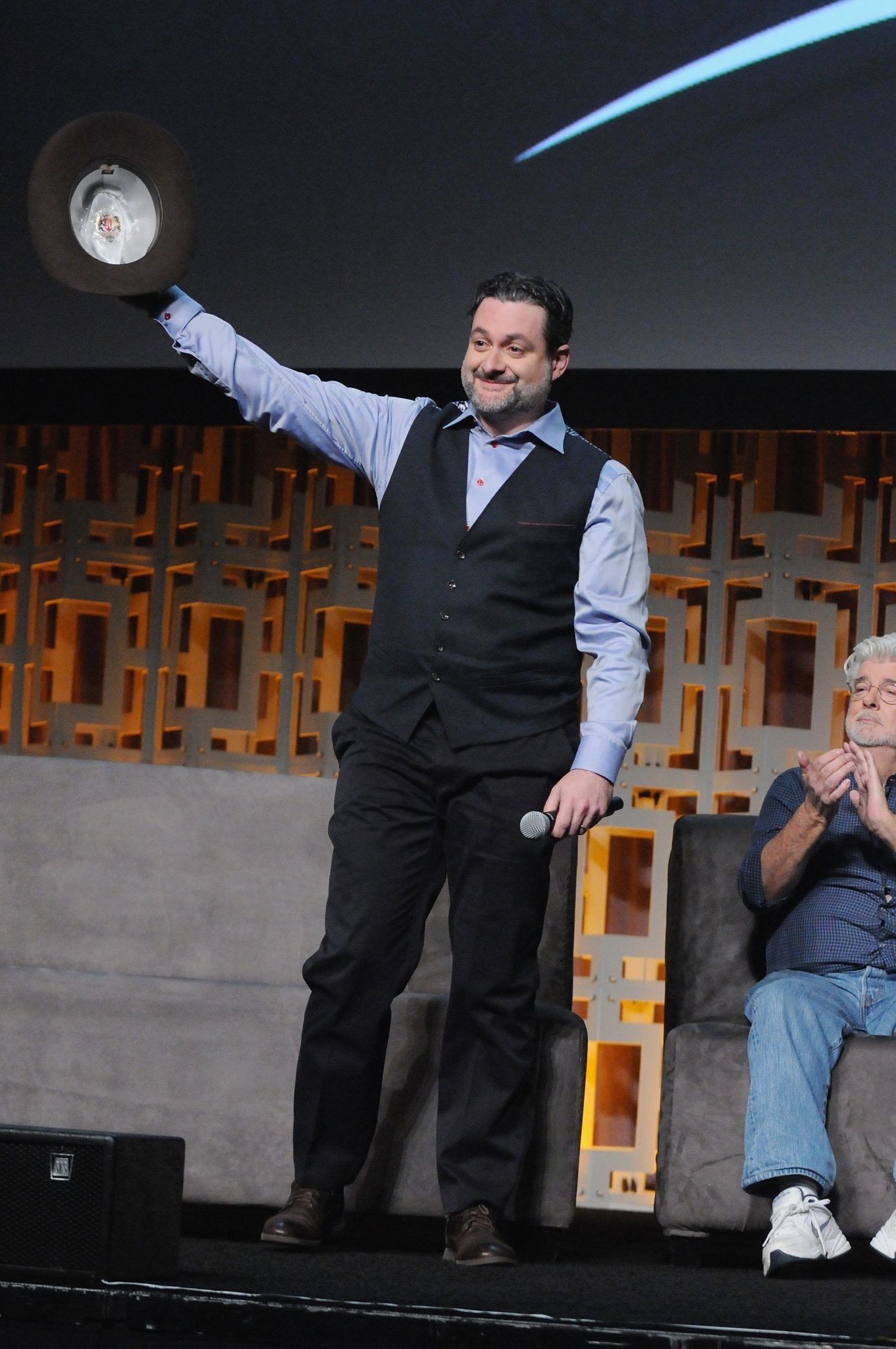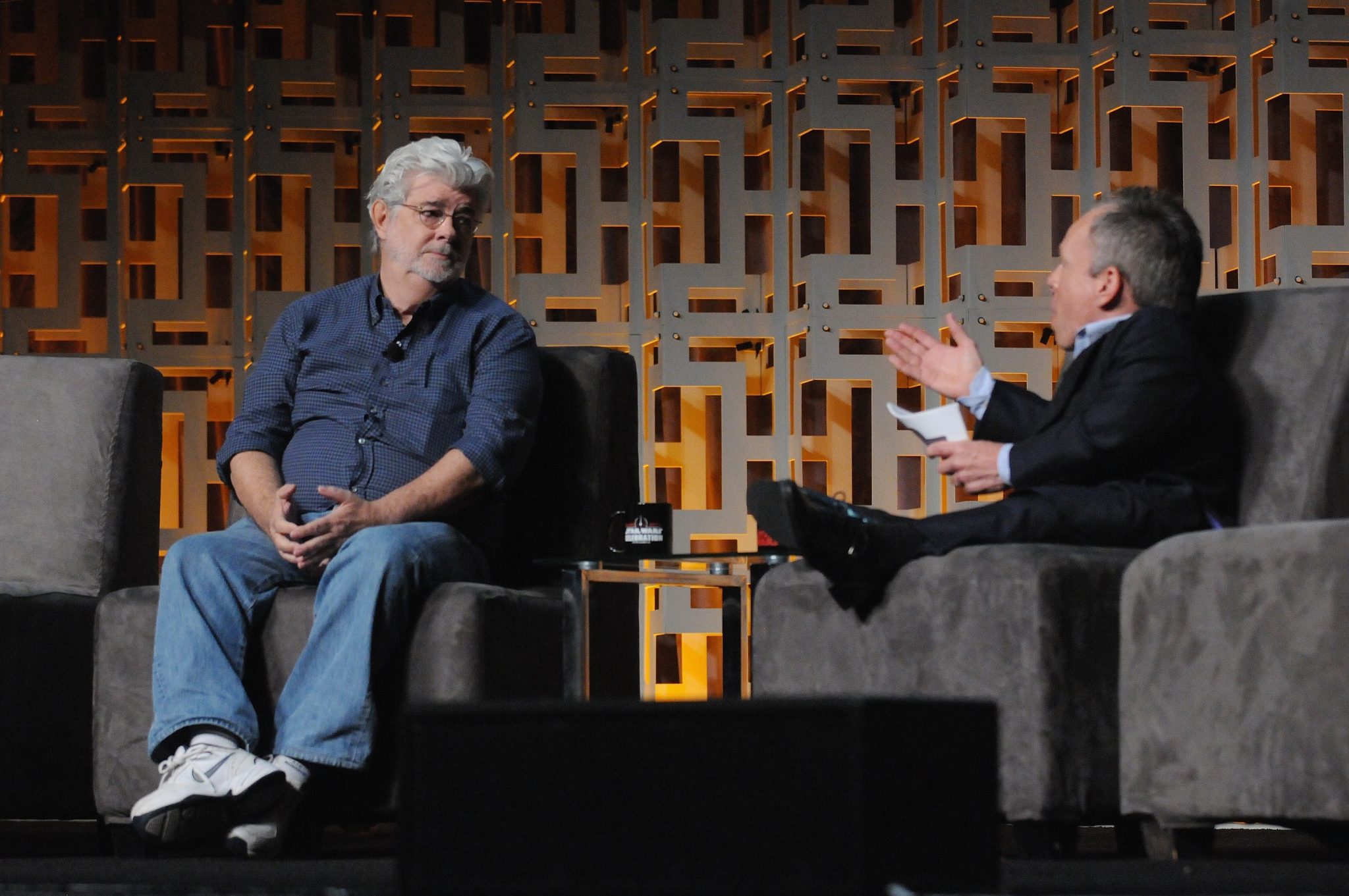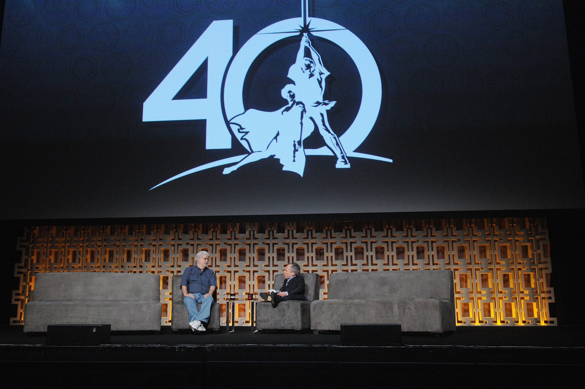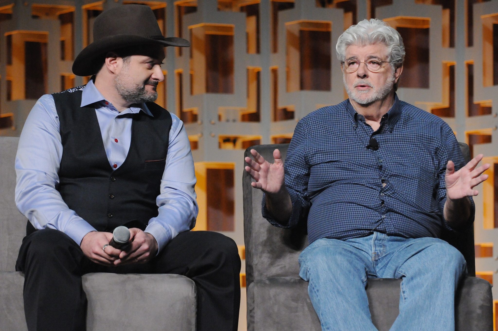 ORLANDO, FL – APRIL 13: Dave Filoni and George Lucas attend the 40 YEARS OF STAR WARS PANEL during the 2017 STAR WARS CELEBRATION at Orange County Convention Center on April 13, 2017 in Orlando, Florida. (Photo by Gerardo Mora/Getty Images for Disney) *** Local Caption *** Dave Filoni, George Lucas