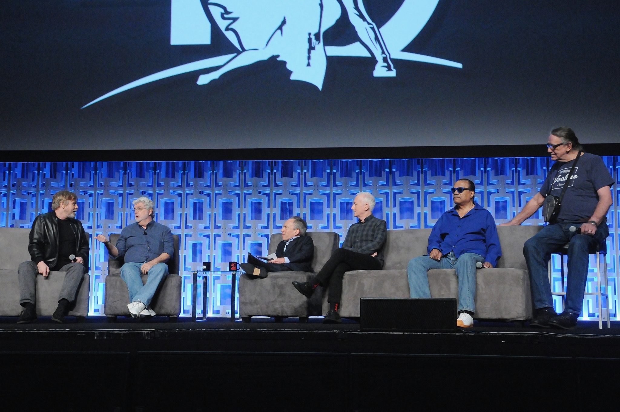 ORLANDO, FL – APRIL 13: Mark Hamill, George Lucas, Warwick Davis, Anthony Daniels, Billy Dee Williams and Peter Mayhew attend the 40 YEARS OF STAR WARS PANEL during the 2017 STAR WARS CELEBRATION at Orange County Convention Center on April 13, 2017 in Orlando, Florida. (Photo by Gerardo Mora/Getty Images for Disney) *** Local Caption *** Mark Hamill;George Lucas;Warwick Davis;Anthony Daniels;Billy Dee Williams;Peter Mayhew