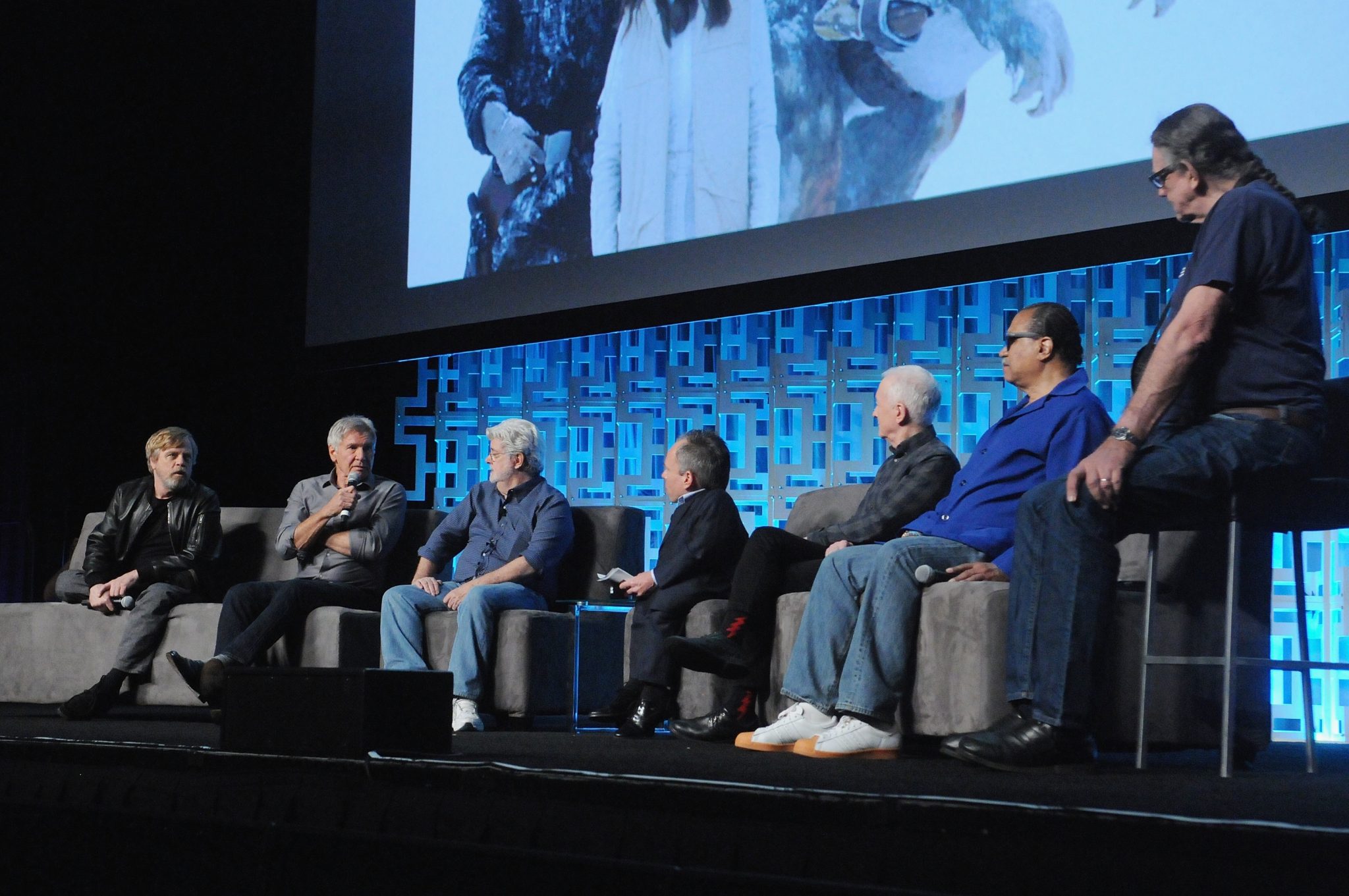 ORLANDO, FL – APRIL 13: Mark Hamill, Harrison Ford, George Lucas, Warwick Davis, Anthony Daniels, Billy Dee Williams and Peter Mayhew attend the 40 YEARS OF STAR WARS PANEL during the 2017 STAR WARS CELEBRATION at Orange County Convention Center on April 13, 2017 in Orlando, Florida. (Photo by Gerardo Mora/Getty Images for Disney) *** Local Caption *** Mark Hamill, Harrison Ford, George Lucas, Warwick Davis, Anthony Daniels, Billy Dee Williams, Peter Mayhew