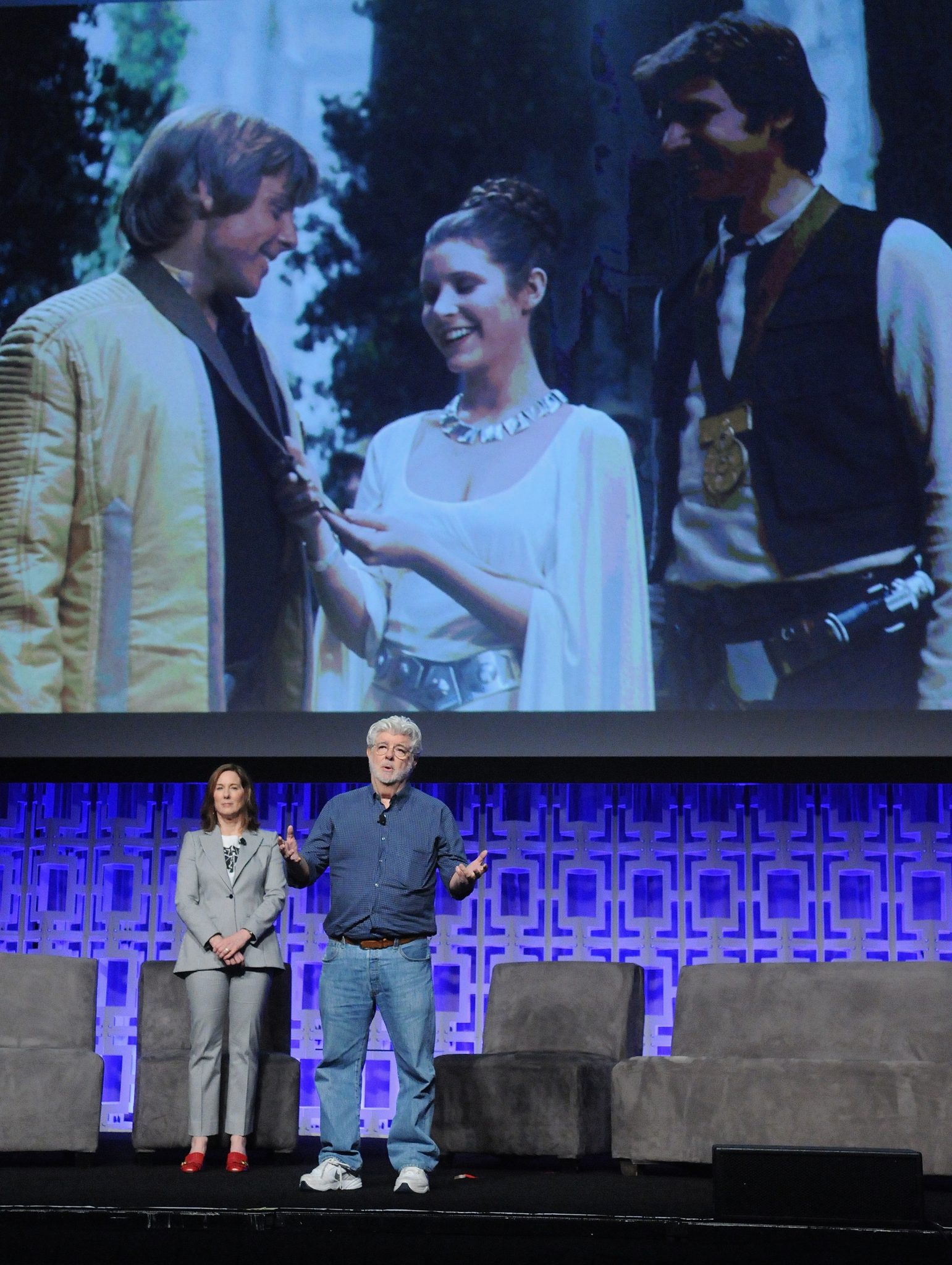 ORLANDO, FL – APRIL 13: Kathleen Kennedy and George Lucas attend the 40 YEARS OF STAR WARS PANEL during the 2017 STAR WARS CELEBRATION at Orange County Convention Center on April 13, 2017 in Orlando, Florida. (Photo by Gerardo Mora/Getty Images for Disney) *** Local Caption *** Kathleen Kennedy, George Lucas