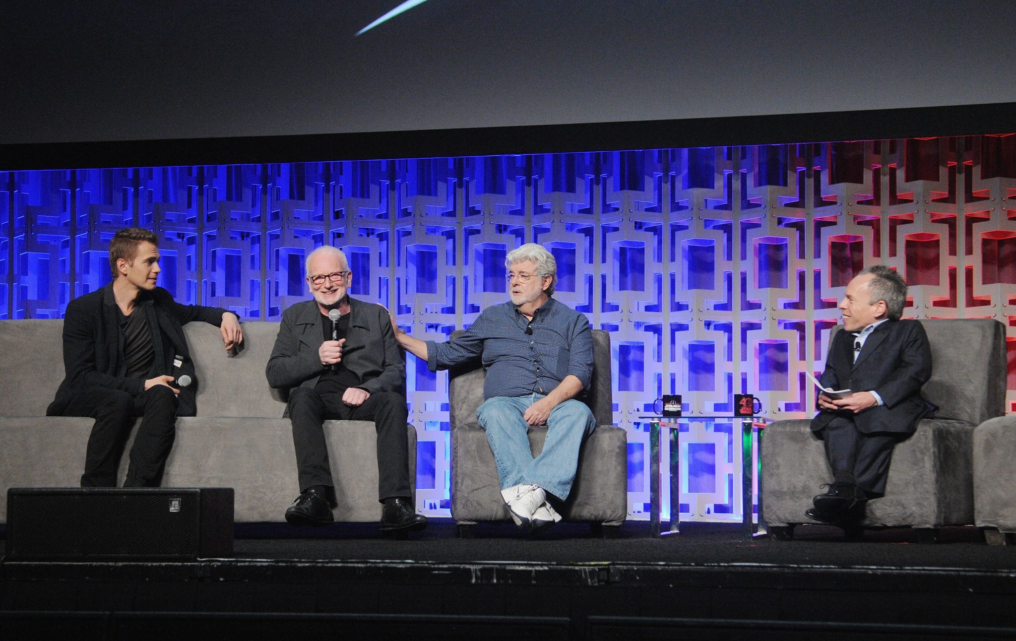 ORLANDO, FL – APRIL 13: Hayden Christensen, Ian McDiarmid, George Lucas, and Warwick Davis attend the 40 YEARS OF STAR WARS PANEL during the 2017 STAR WARS CELEBRATION at Orange County Convention Center on April 13, 2017 in Orlando, Florida. (Photo by Gerardo Mora/Getty Images for Disney) *** Local Caption *** Hayden Christensen, Ian McDiarmid, George Lucas;Warwick Davis