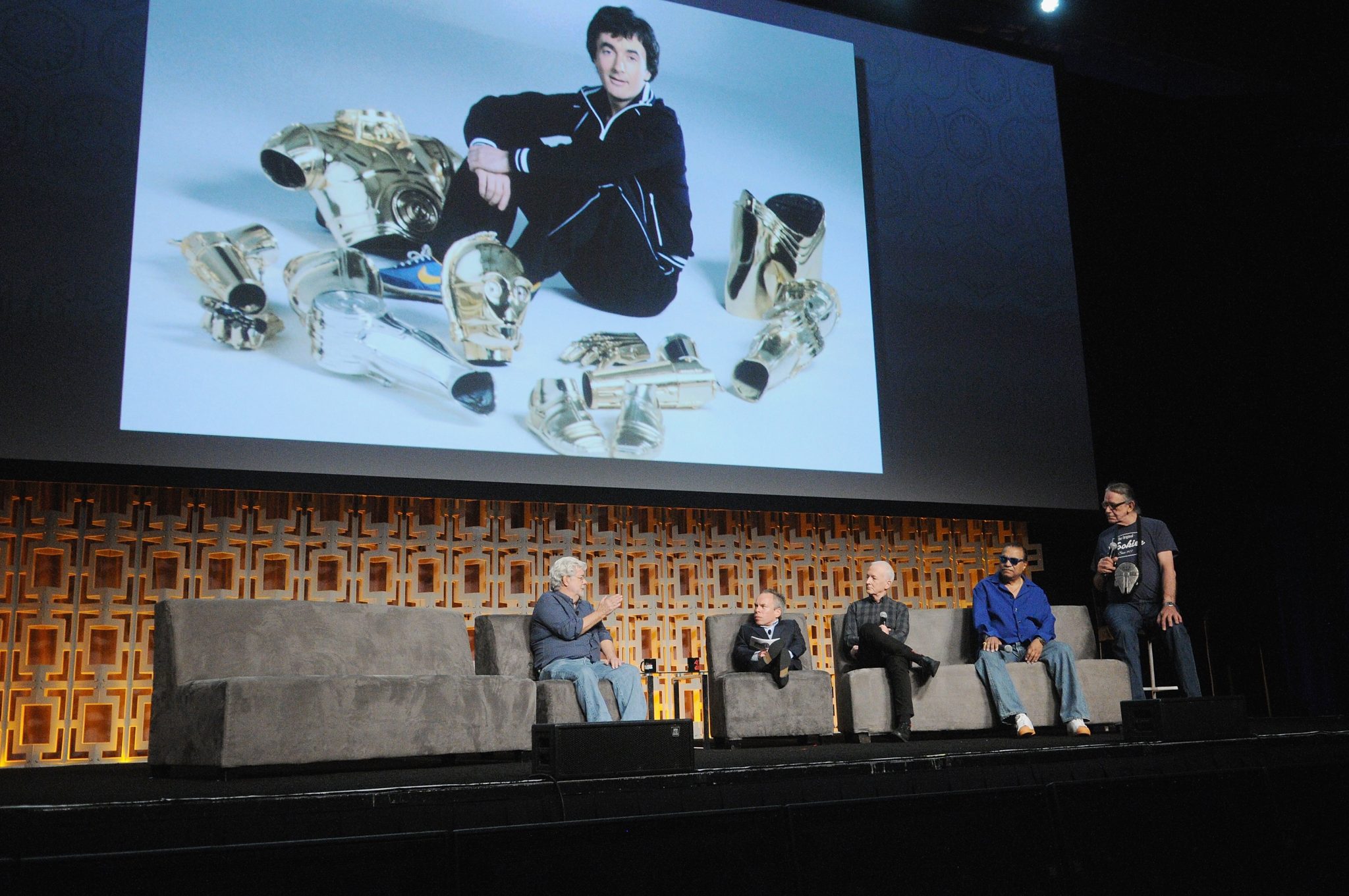 Mark Hamill then joined the stage where Peter Mayhew (Chewbacca), Anthony Daniels (C-3PO) and Billy Dee Williams (Lando) already were. The crowd was very enthusiastic at this point. Lucas then shared about casting Luke, Leia, and Han. It was quite the process and took a year to find Luke Skywalker. There were several actors in contention and basically it all came down to chemistry. There would test these various actors with each other and finally Hamill was the one that clicked. Lucas also made a joke that Hamill was also shorter than him so that helped too. During this segment George Lucas also shared about Chewbacca, C-3P0, and R2-D2. Chewbacca was inspired by Lucas’ dog Indiana who would ride shotgun in his car. Lucas commented on the fact that Indiana was bigger than him in the car and he loved that Pilot/Co-Pilot image. Daniels received his role because of his miming abilities which meant he could act with movement over facial expressions. Daniels shared that one of his favorite Star Wars filming moments came while filming Return of the Jedi. George Lucas was pretending to be R2-D2 in the middle of Death Valley in front of Jabba’s Palace. Yes, George Lucas was apparently even doing the sound effects.
