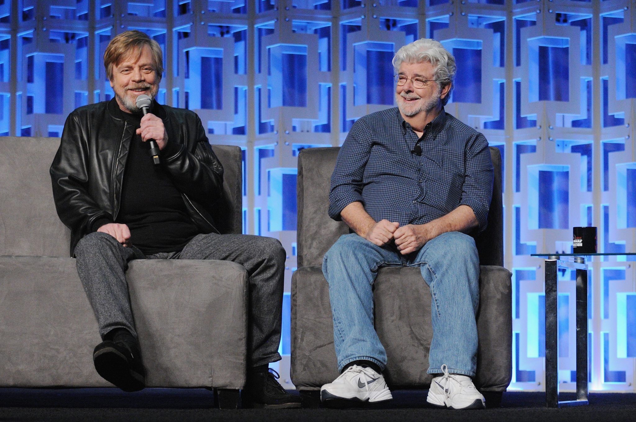 ORLANDO, FL – APRIL 13: Mark Hamill and George Lucas attend the 40 YEARS OF STAR WARS PANEL during the 2017 STAR WARS CELEBRATION at Orange County Convention Center on April 13, 2017 in Orlando, Florida. (Photo by Gerardo Mora/Getty Images for Disney) *** Local Caption *** Mark Hamill, George Lucas