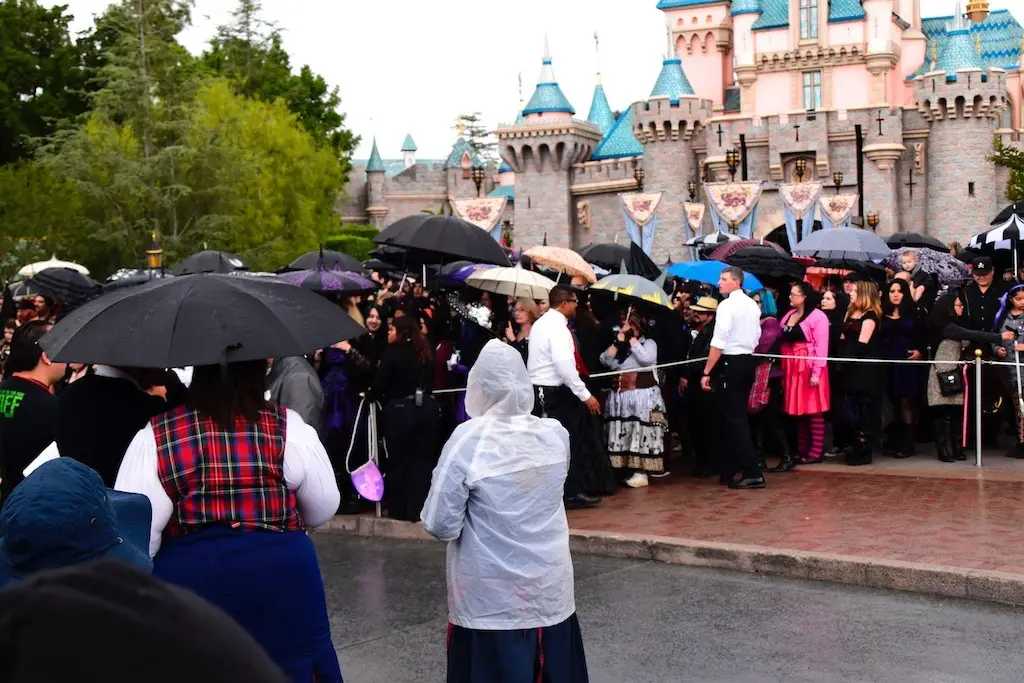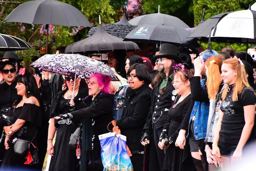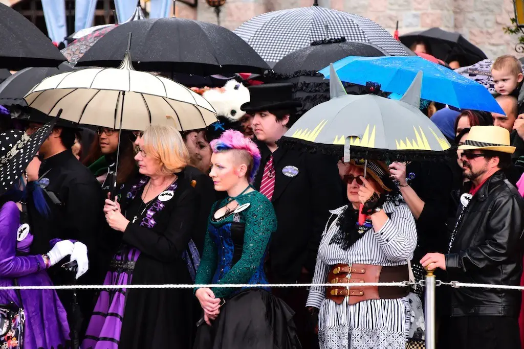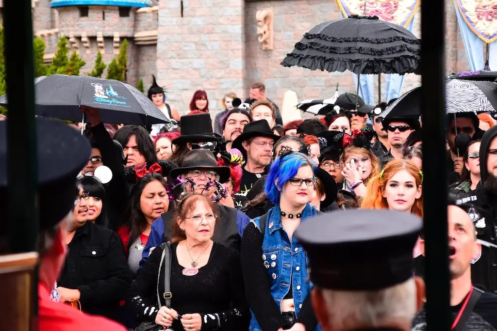 A big crowd gathered to have a group picture taken in front of Sleeping Beauty Castle on Main Street for Bats Day. Many were in macabre outfits as they posed. Haunted Mansion, Nightmare Before Christmas, and villain motifs were abound in this group. The sprinkling of rain did not keep them down from enjoying the time.