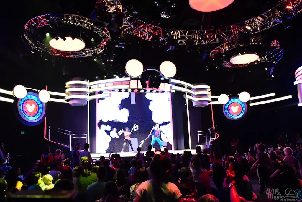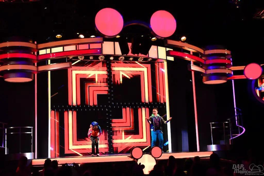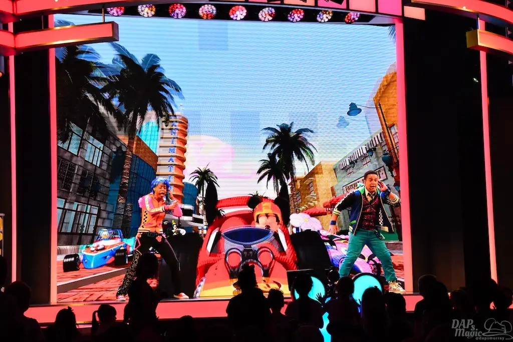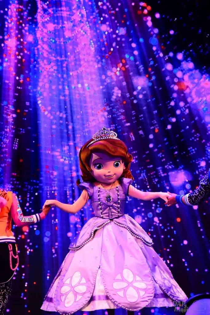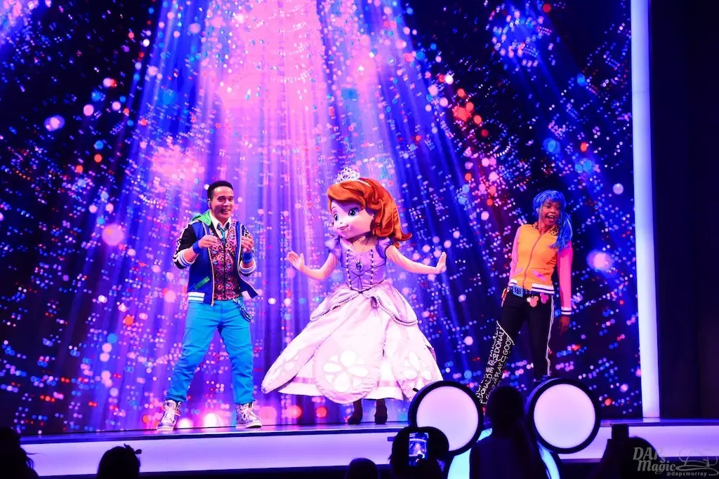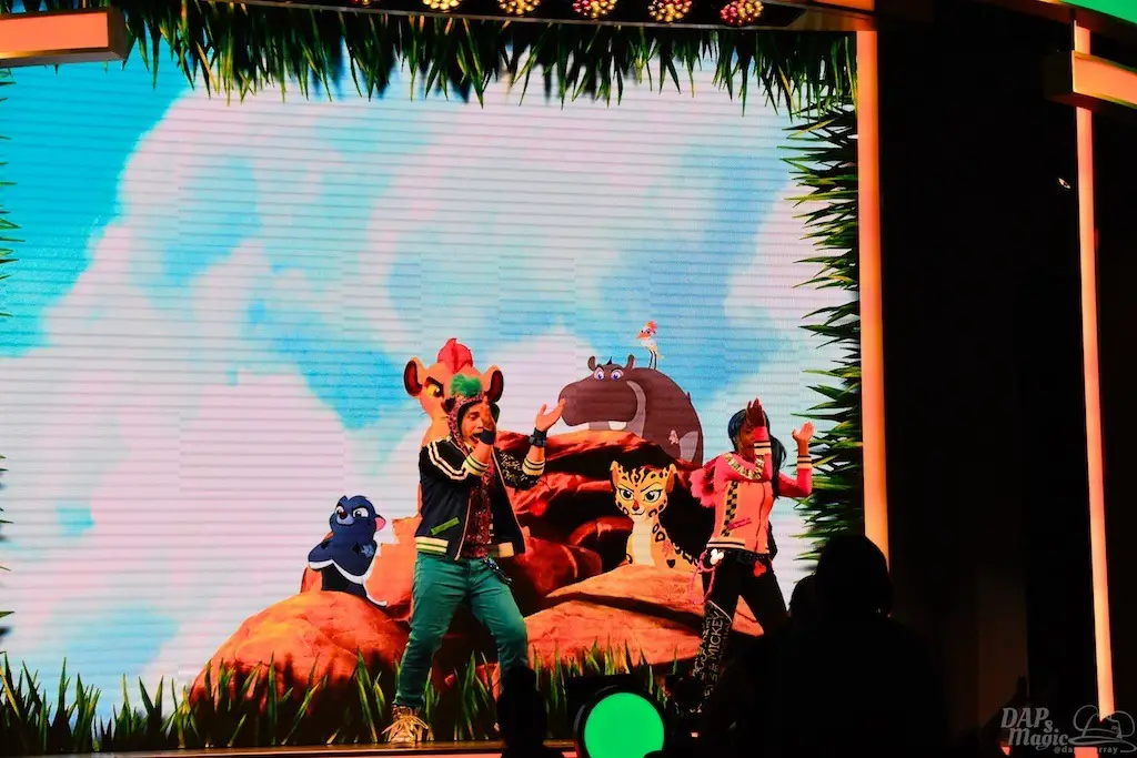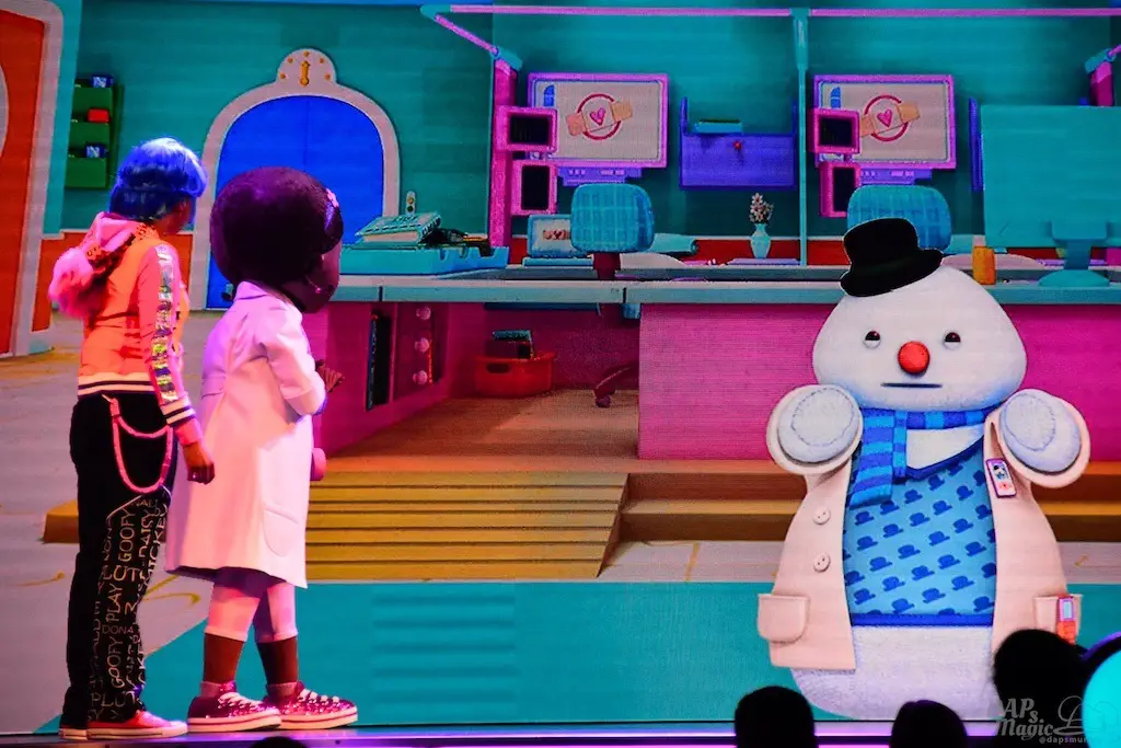 In the meantime, the DJ’s visit several shows including Sophia the First, Doc McStuffins: Toy Hospital, and the Lion Guard. Each time it’s visited, a character is spun from the screen to the stage. Dance moves are demonstrated for the kids to join in on. In theater effects are used at various times too, like snow fall and bubbles.