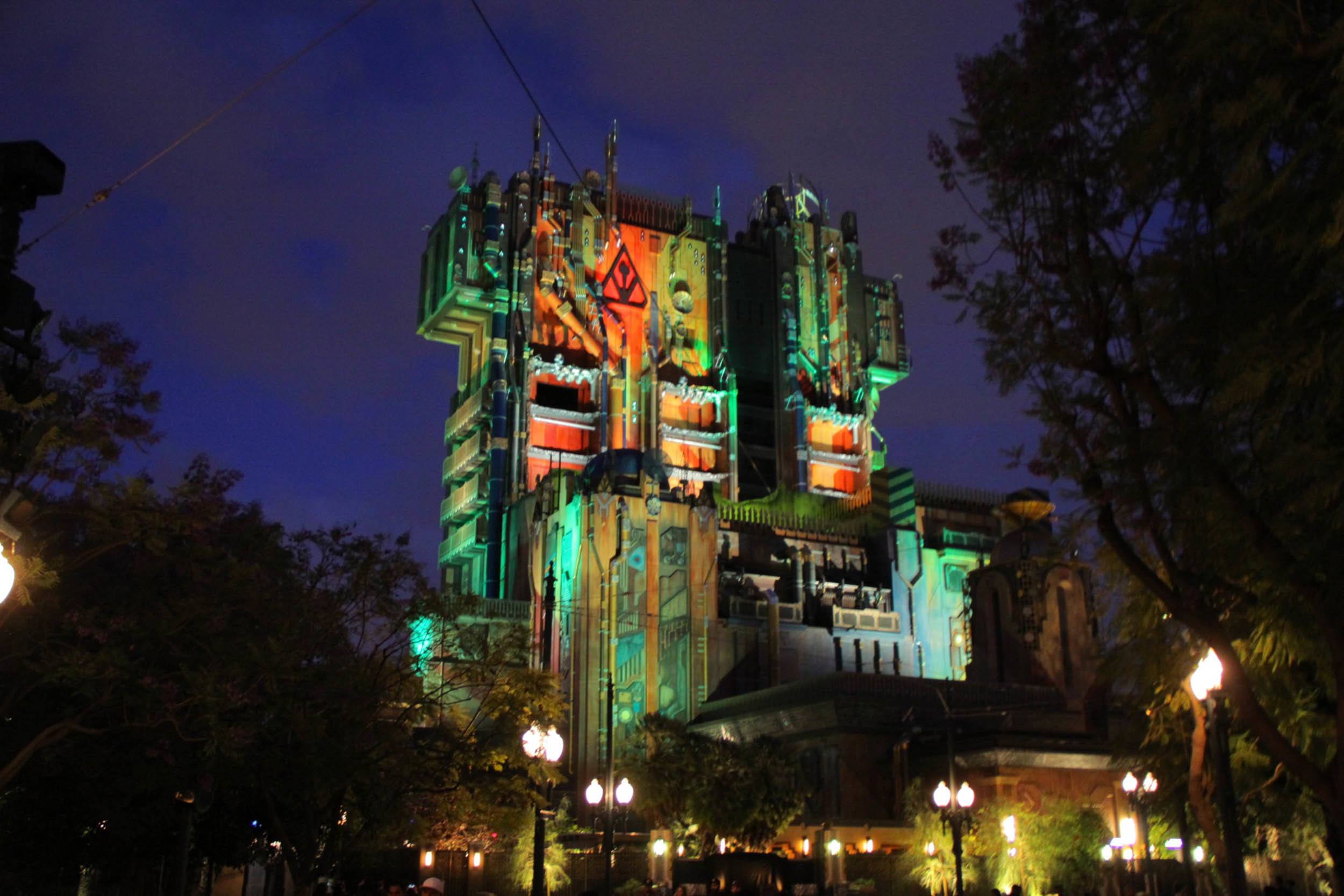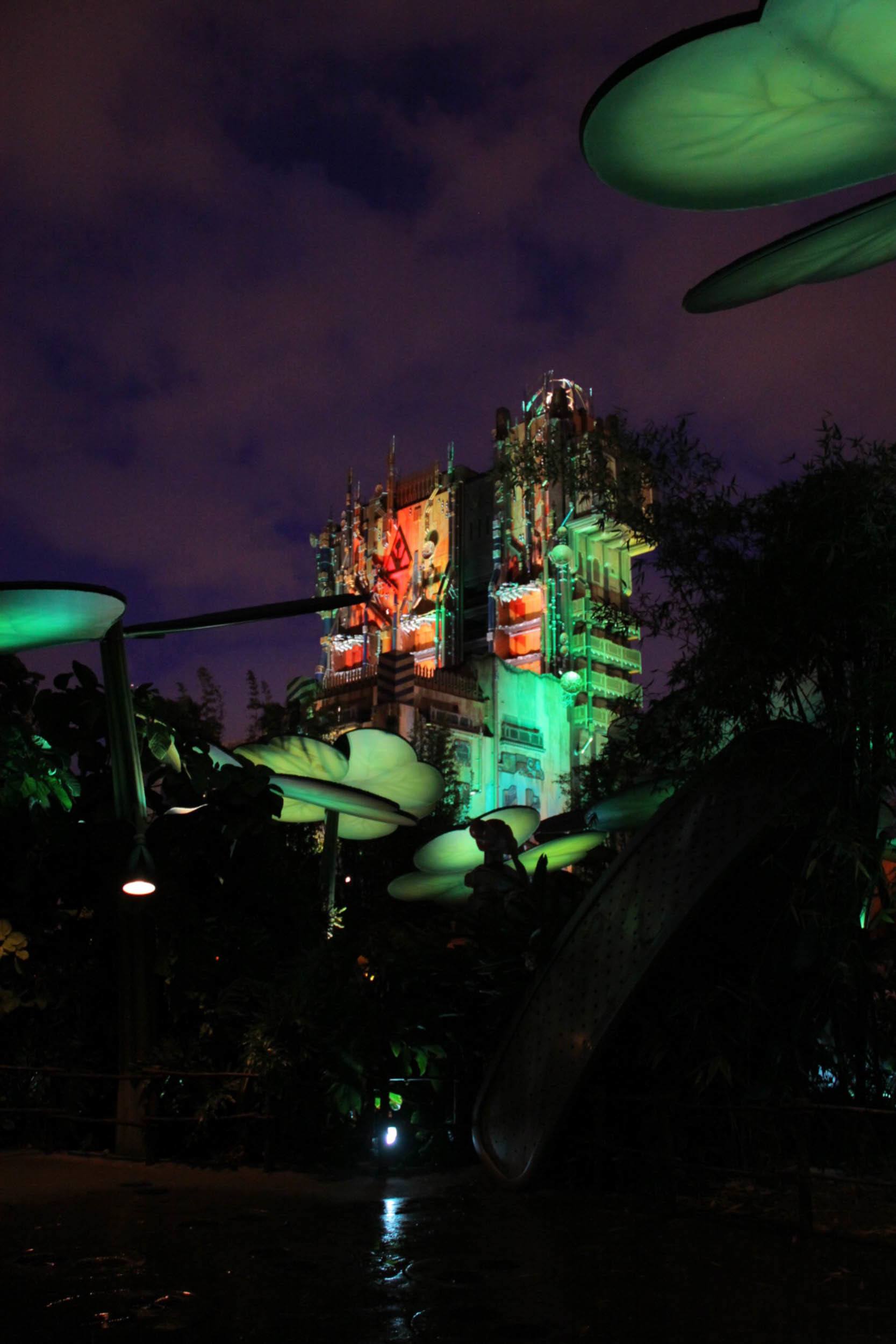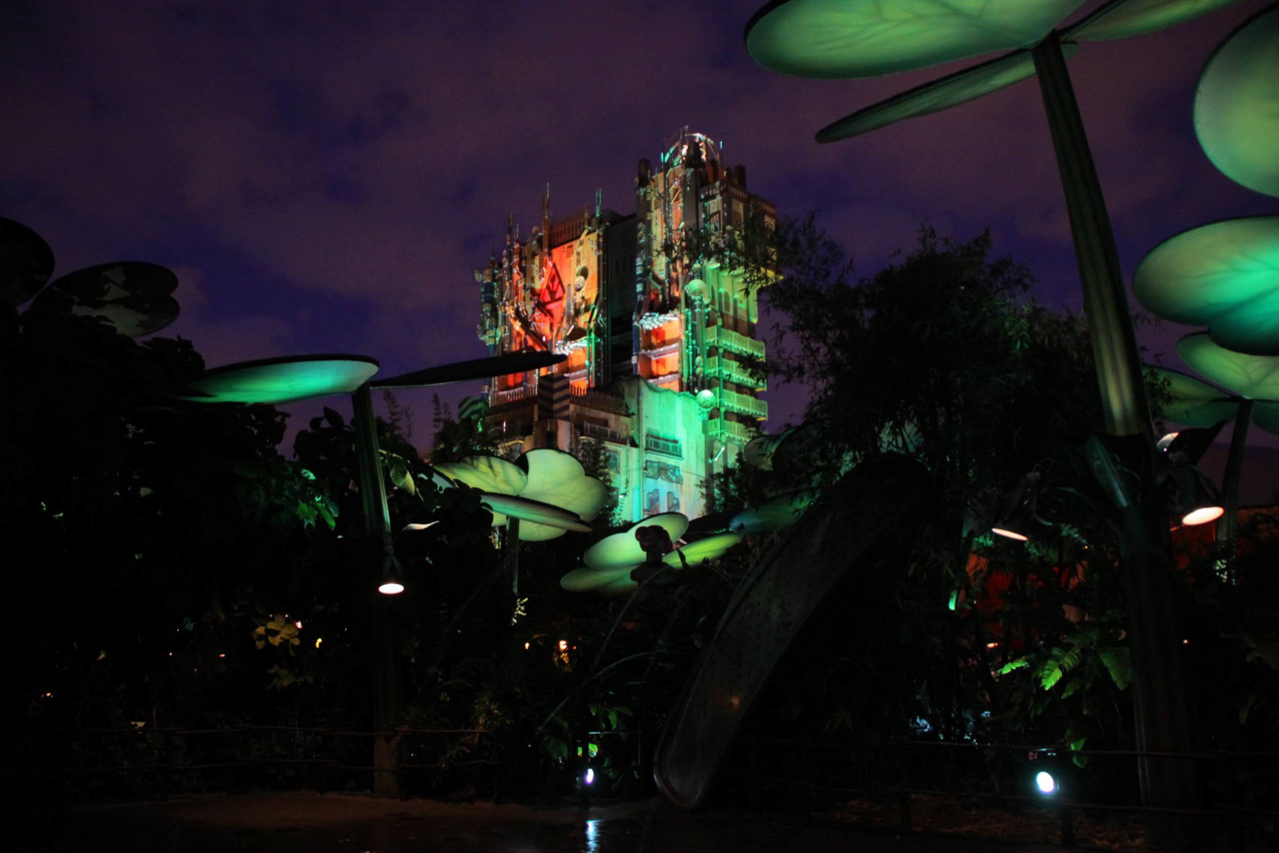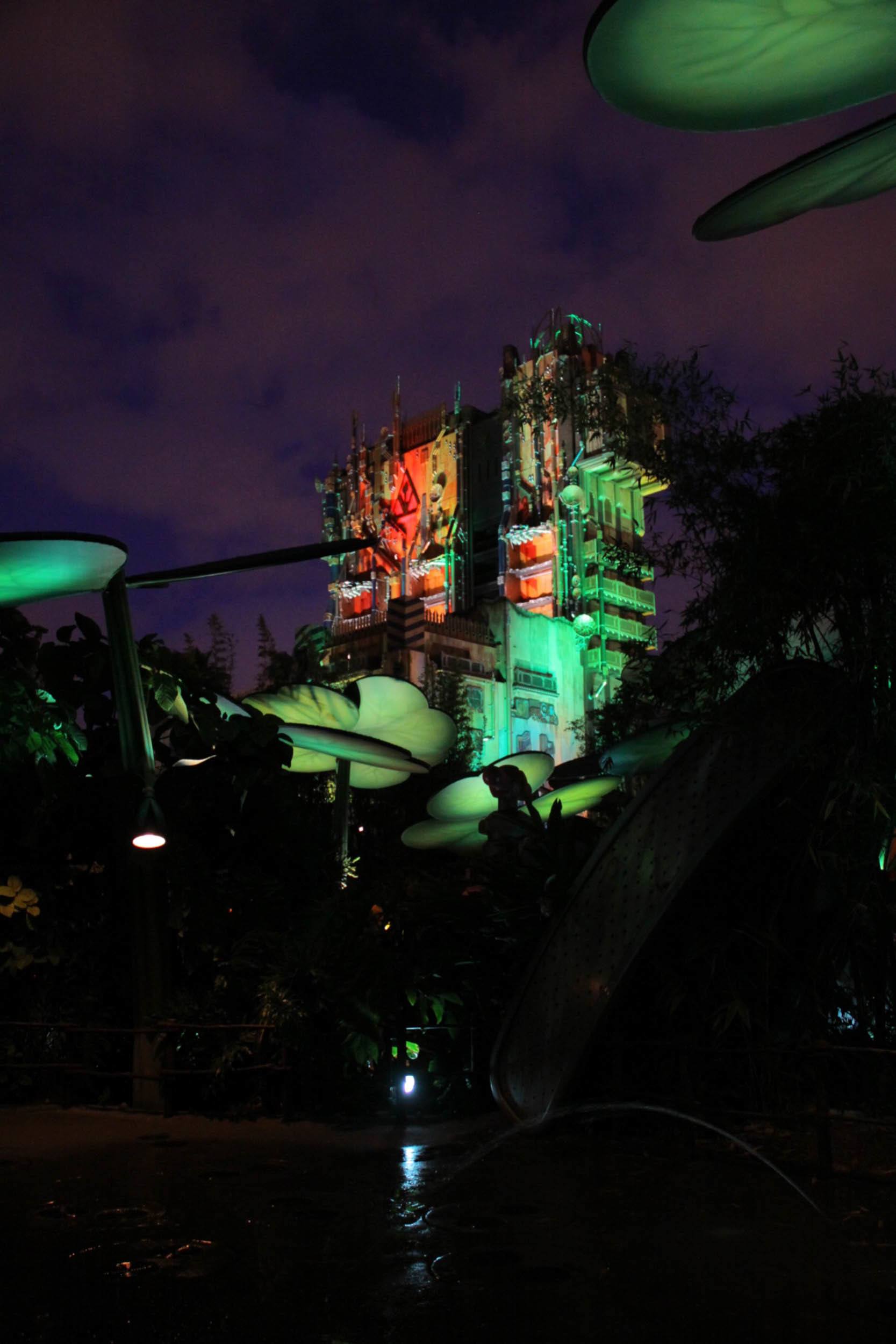 Guardians of the Galaxy – Mission: BREAKOUT! is definitely a new site at the Disneyland Resort. Guests walking by can’t help but notice the new look for the building during the day. Walk by at night and this new look becomes even more apparent! What already stands out during the day becomes even more colorful and alive at night. A light on top of the building flashes on and off, presumably a part of the story that will be told once the attraction opens. Various hues of green, gold, red, and orange light up the night on the side of the building. Listen very closely and music can be heard drifting out of the building.