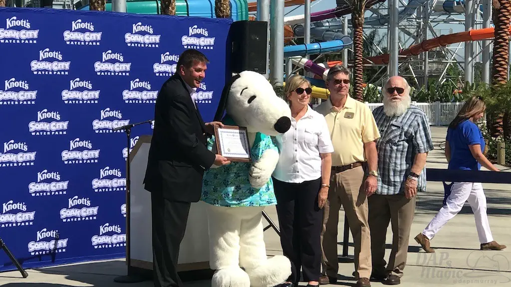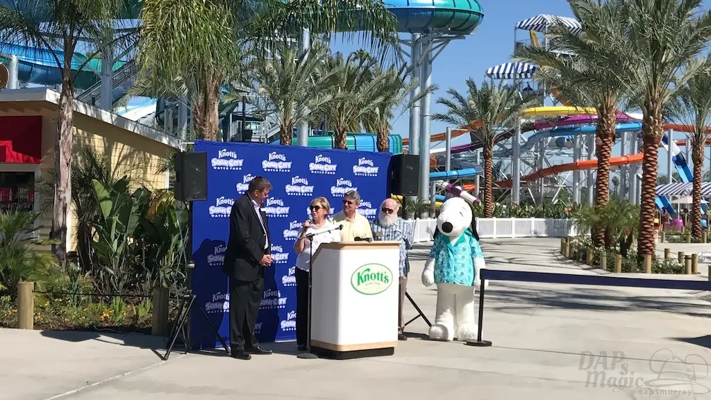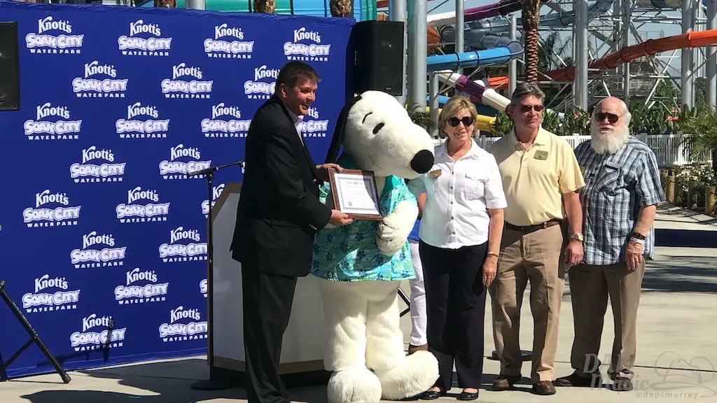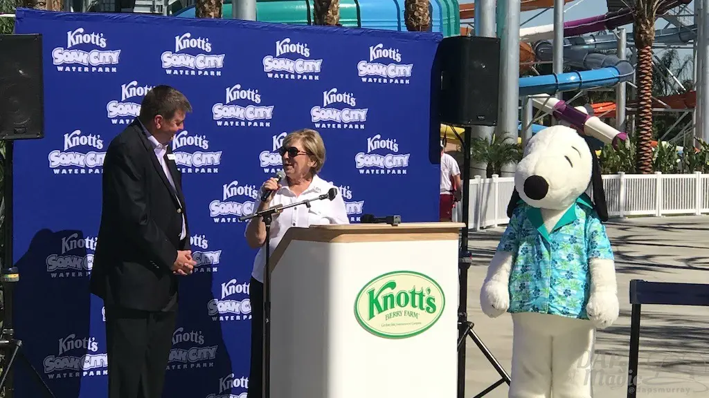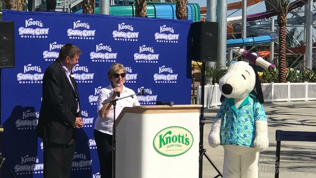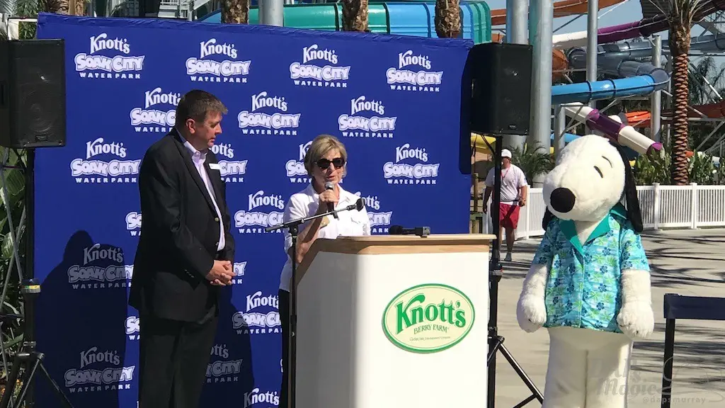 Knott’s Soak City has reopened for the summer city, and with 7 new slides! May 20 was the grand opening, and season opening, for The Wedge and Shore Break. Jon Storbeck, Buena Park Mayor Beth Swift, and Snoopy cut the ribbon to inaugurate the new slides.