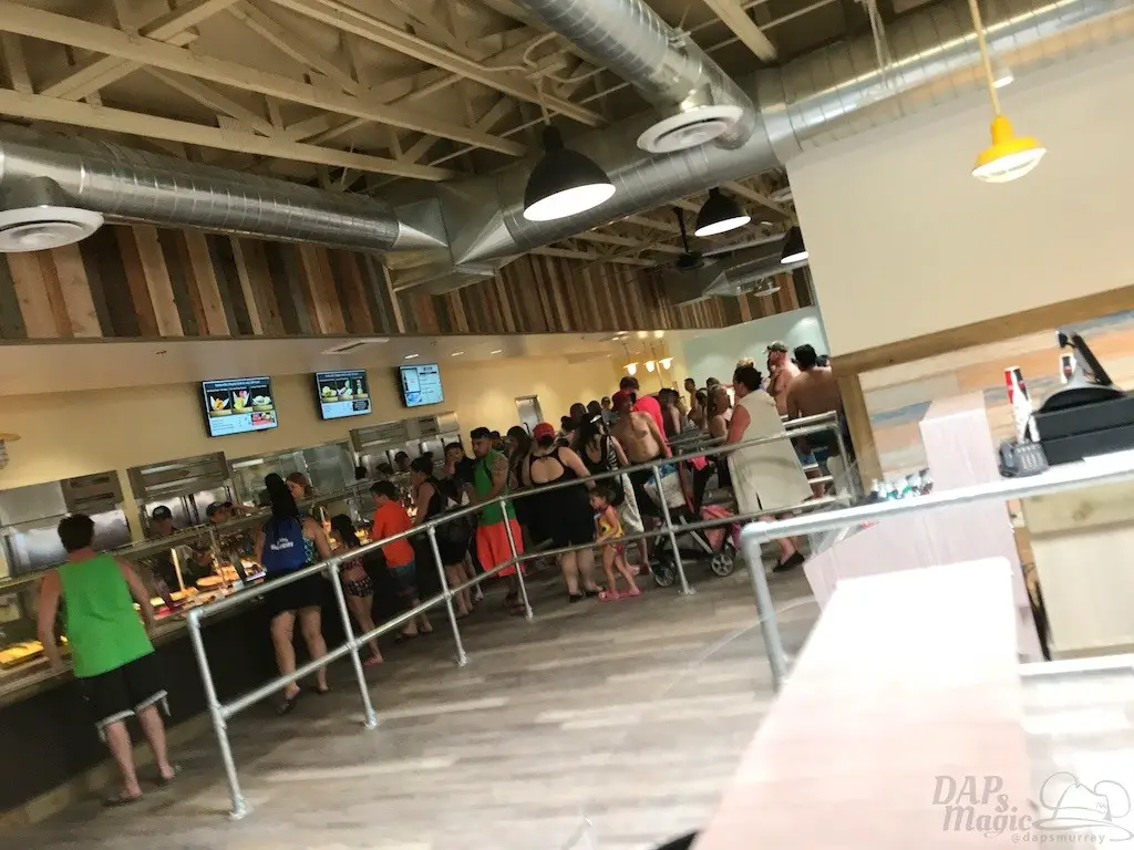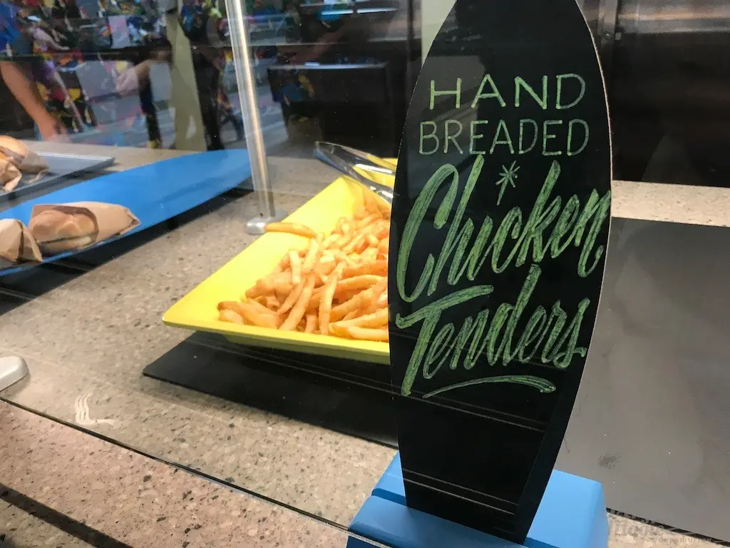 Besides these slide expansions is a remodeled Longboard’s Grill restaurant. Inside is a counter service eatery with chicken tenders, cheeseburgers, chicken sandwiches, fish and chips, salads, and other goodies to eat for lunch or dinner. There are two lines and guests step up to grab their fare of choice. Expanded seating outside gives some shade from the sun too.