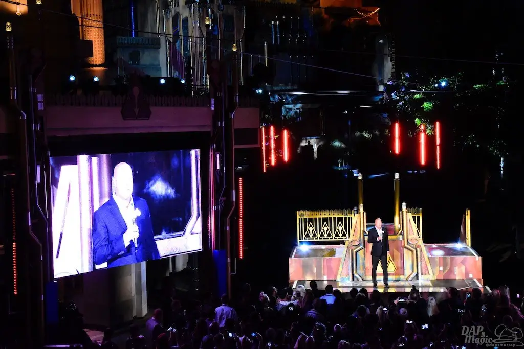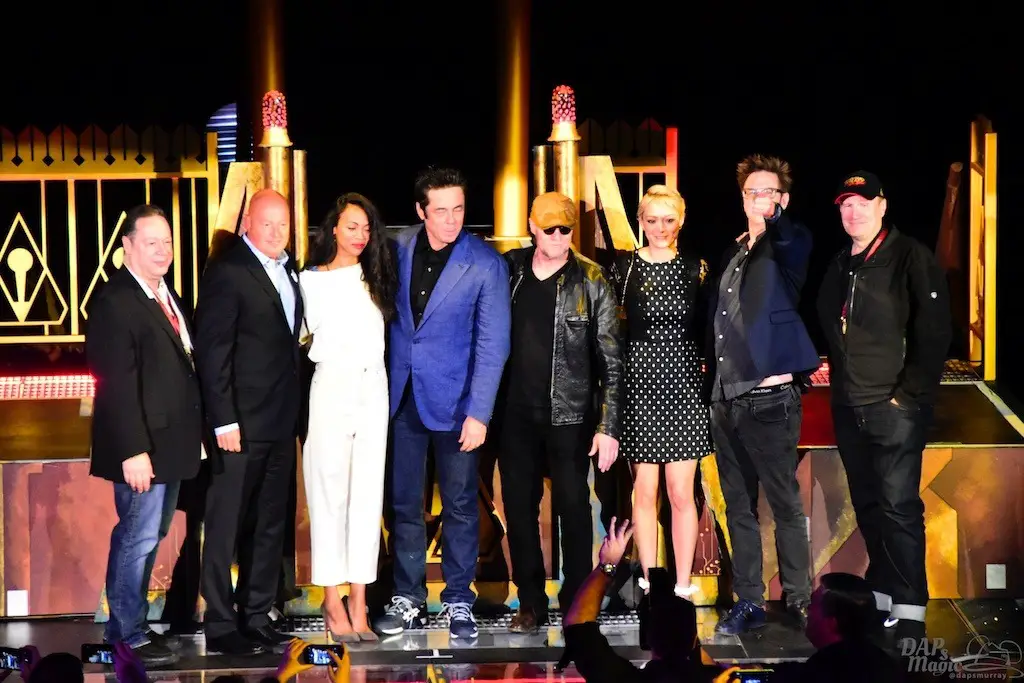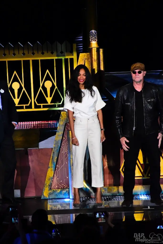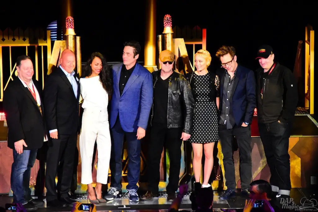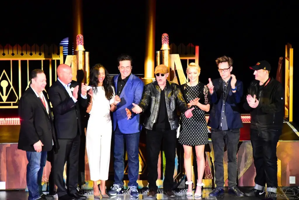 Gunn introduced a few cast members of the films including Zoe Saldana, Pom Klementieff, Michael Rooker, and Benicio Del Toro. Del Toro initiated the actual opening of the attraction. Fireworks and lightning projections concluded the ceremony and opened the attraction.