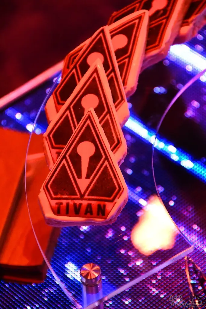 In the main media center were several snacks to partake of. The main snack in full supply was Tivan cookies. These could be grabbed along with logo embroidered Tivan napkins. On top of tables were Tivan light sculptures.