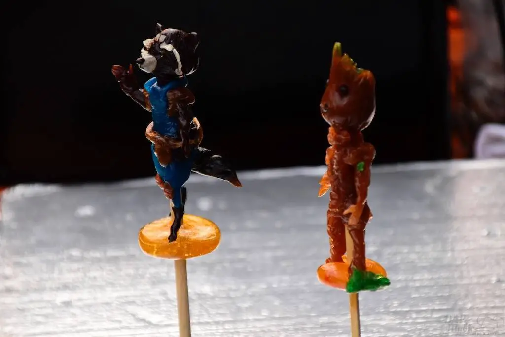 The walkway led to tables that sat amidst several food options. All of the cuisine was themed to Guardians of the Galaxy. One of the more interesting features was an anti-gravity wall with ceviche.