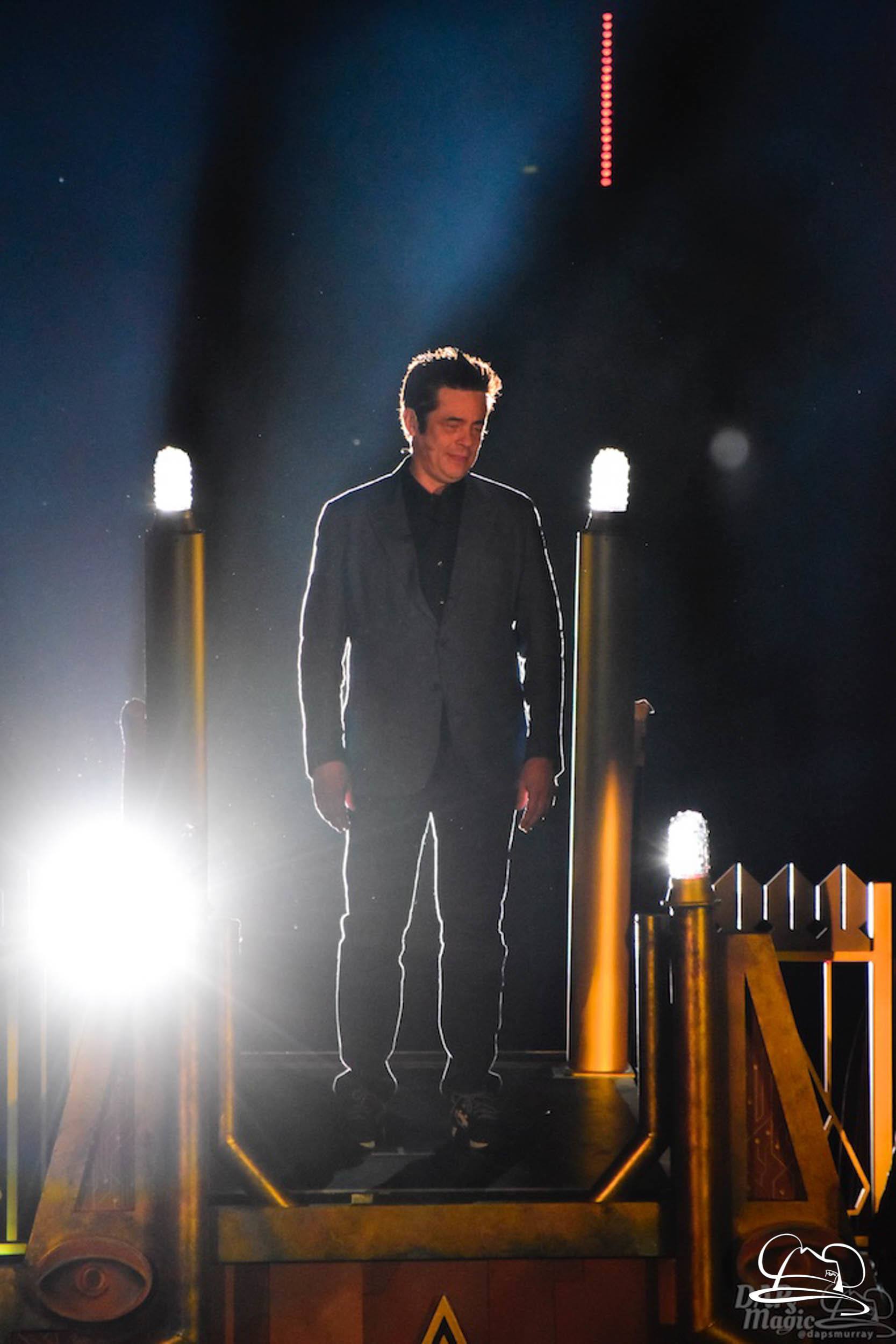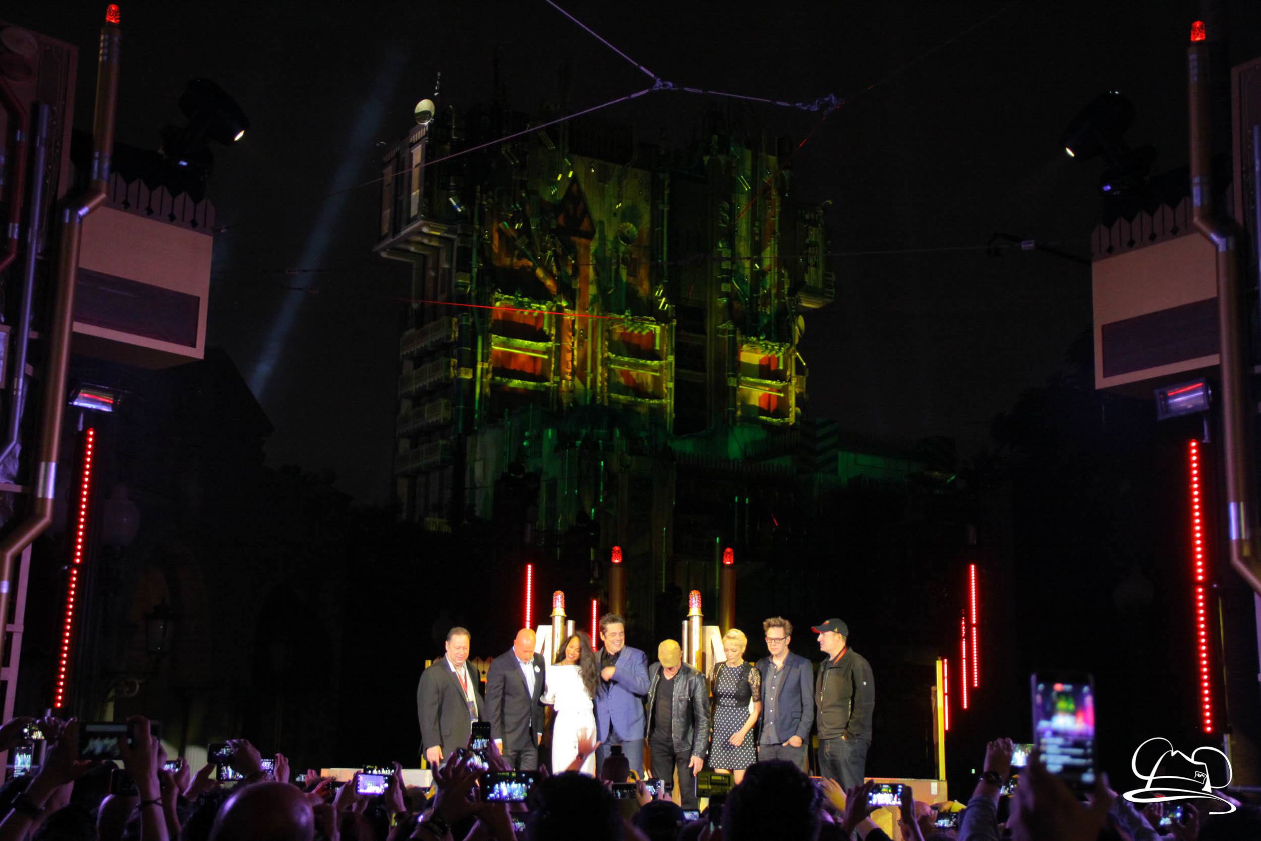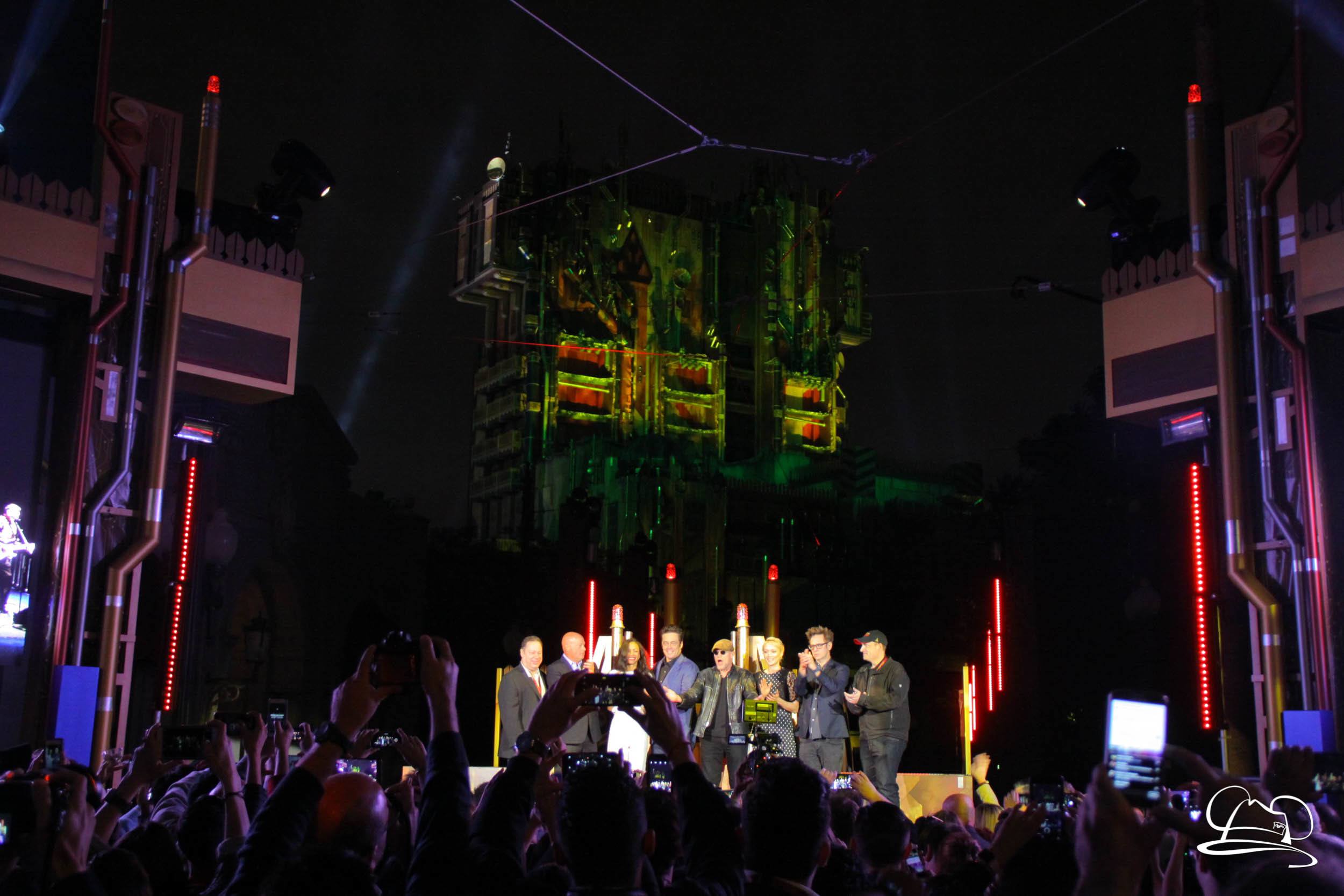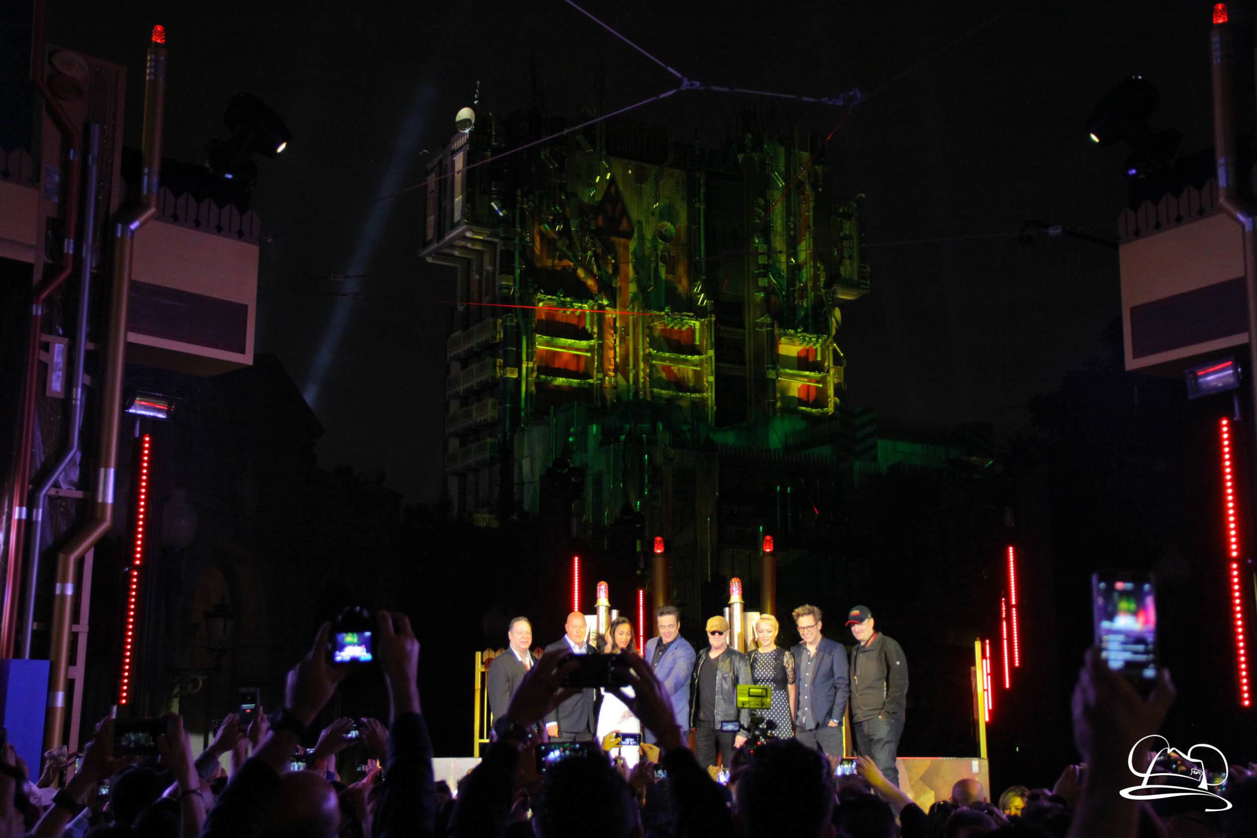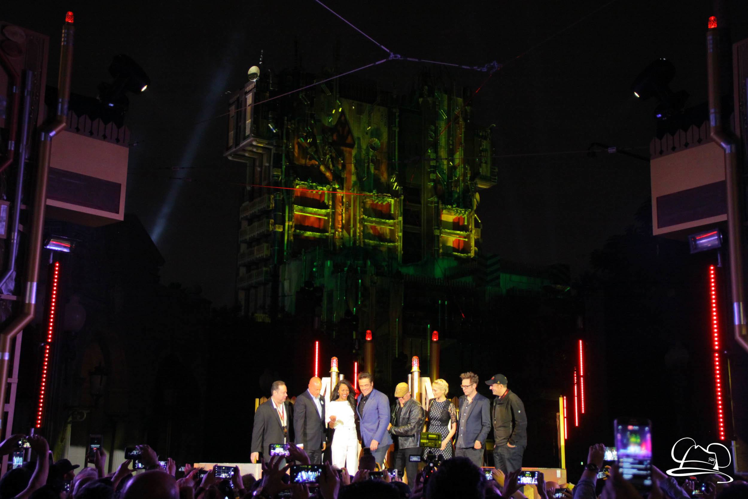 The Disneyland Resort kicked off the Summer of Heroes with a star studded event in Disney California Adventure. After a special party in Hollywood Backlots, a ceremony took place for the opening of the Tivan Collection by The Collector. Hosted by The Collector’s assistant(s), this event included Chairman of Disney Parks and Resorts Bob Chapek and Guardians of the Galaxy Vol. 1 and Vol. 2 director James Gunn. They were joined by Pom Klementieff who portrayed Mantis, Michael Rooker who portrayed Yondu, and Zoe Saldana who plays Gamora. Finally Benicio del Toro joined to take the place of The Collector. When The Collector’s assistant was worried about him taking The Collector’s place he quipped that he was sure The Collector would mind. Moments later the area erupted with lights, lasers, and pyrotechnics as Guardians of the Galaxy – Mission: BREAKOUT! was officially opened to the media and honored guests.