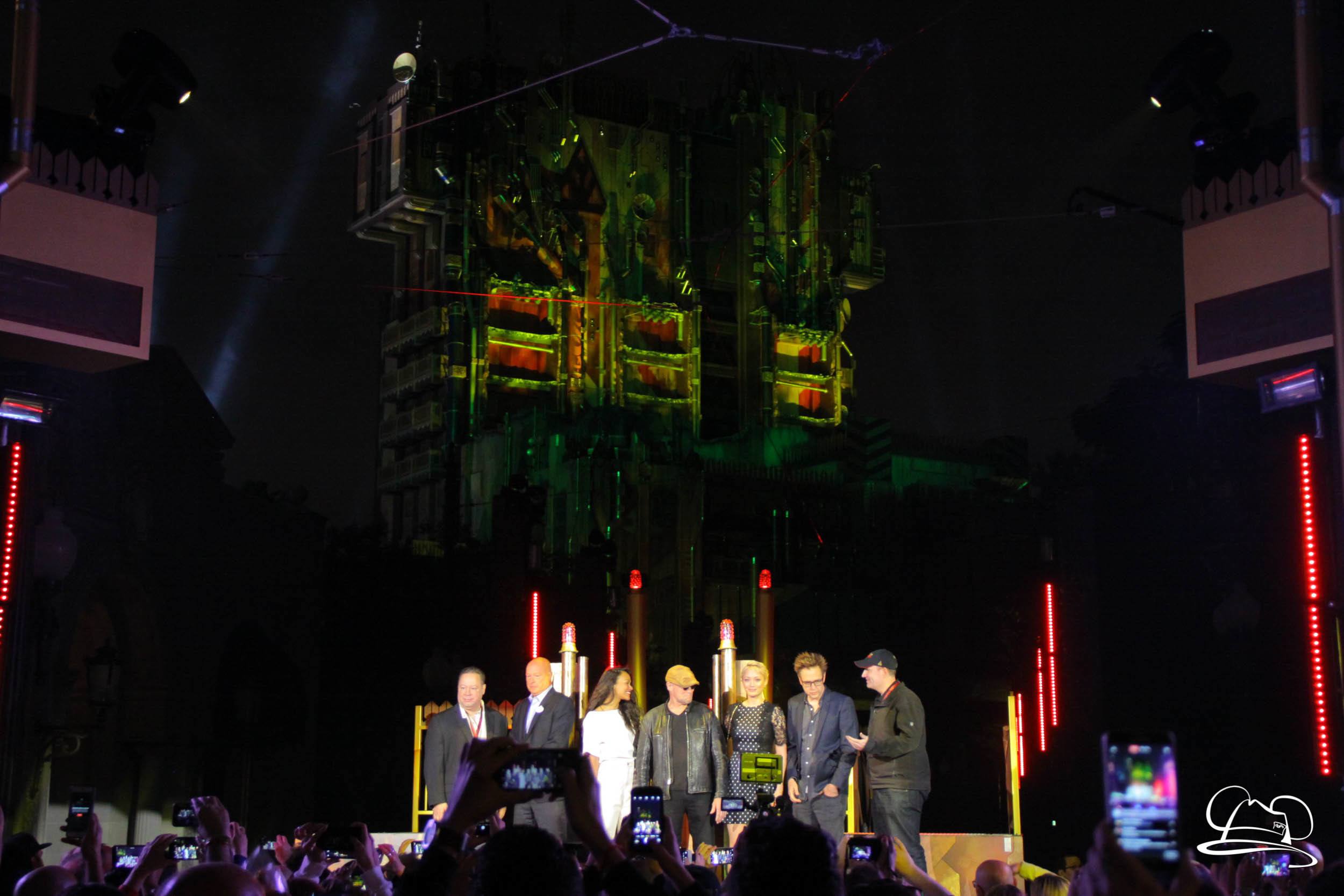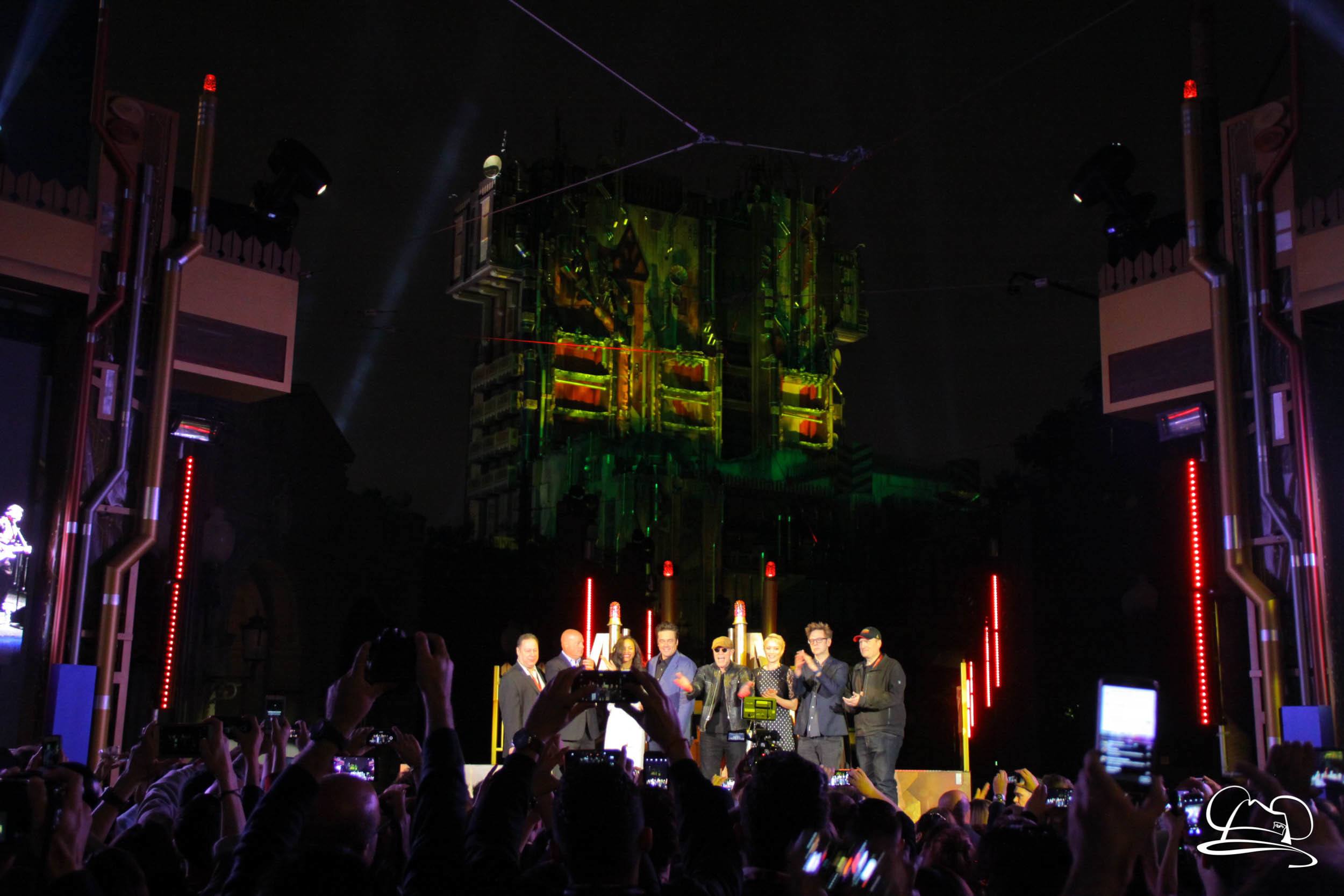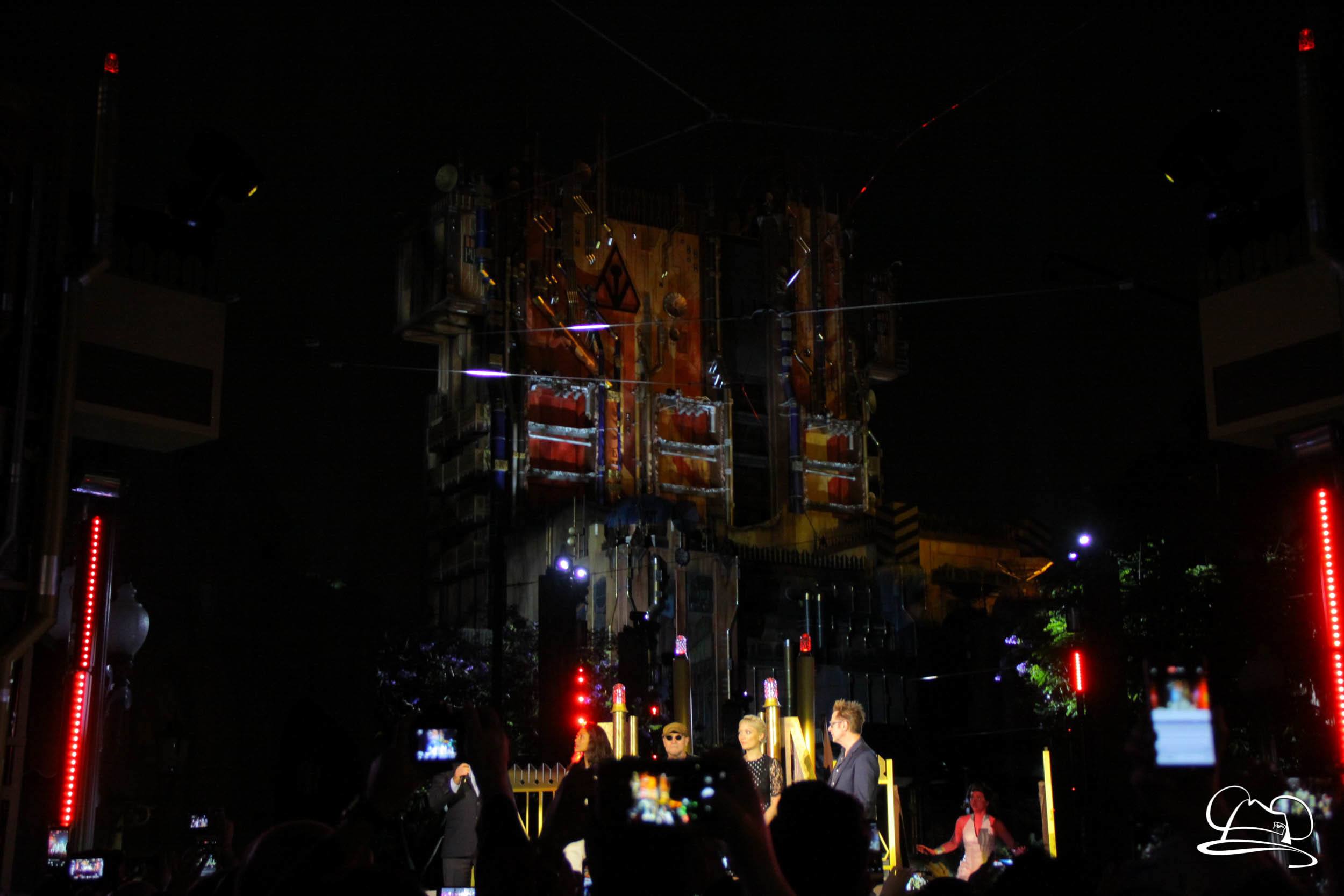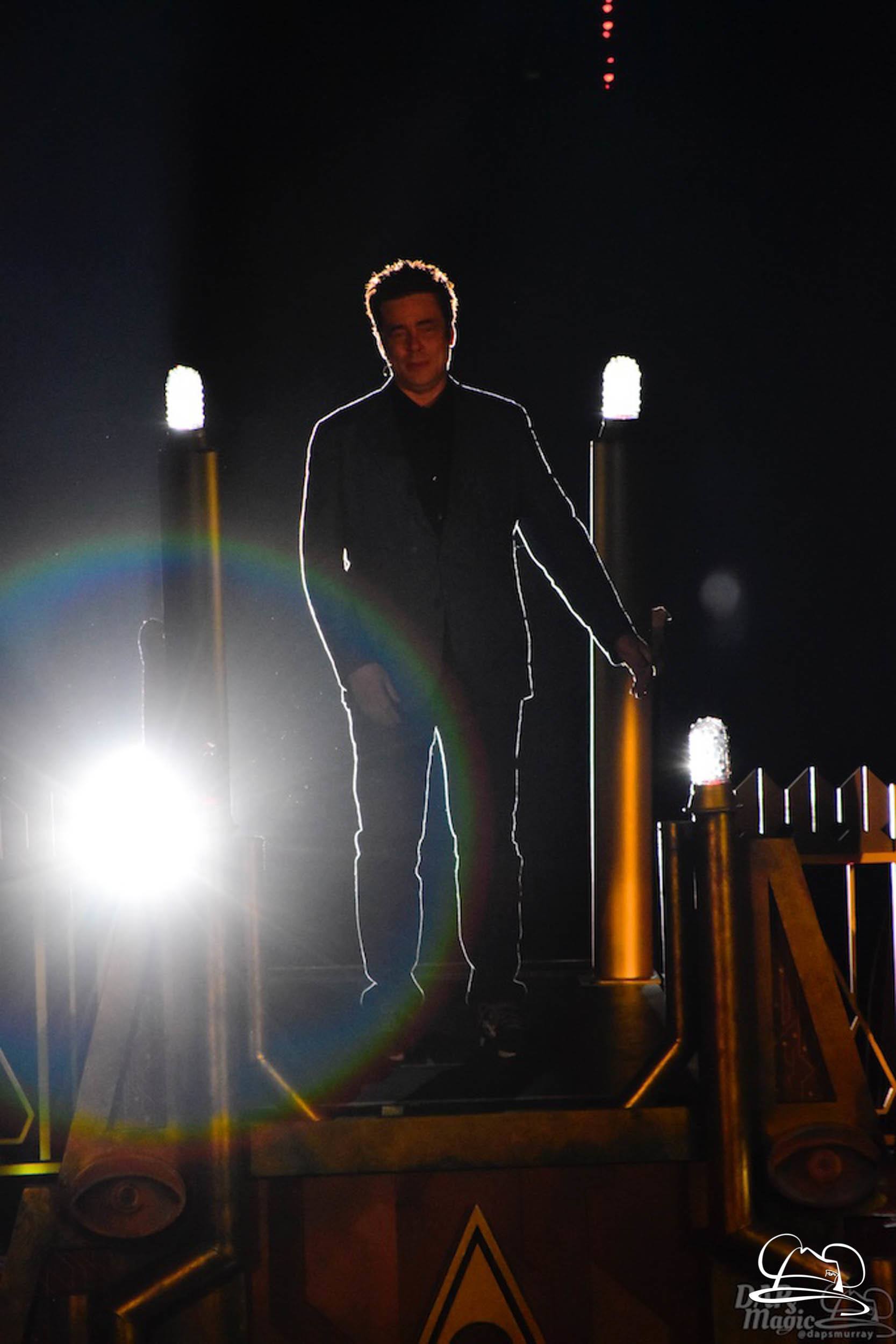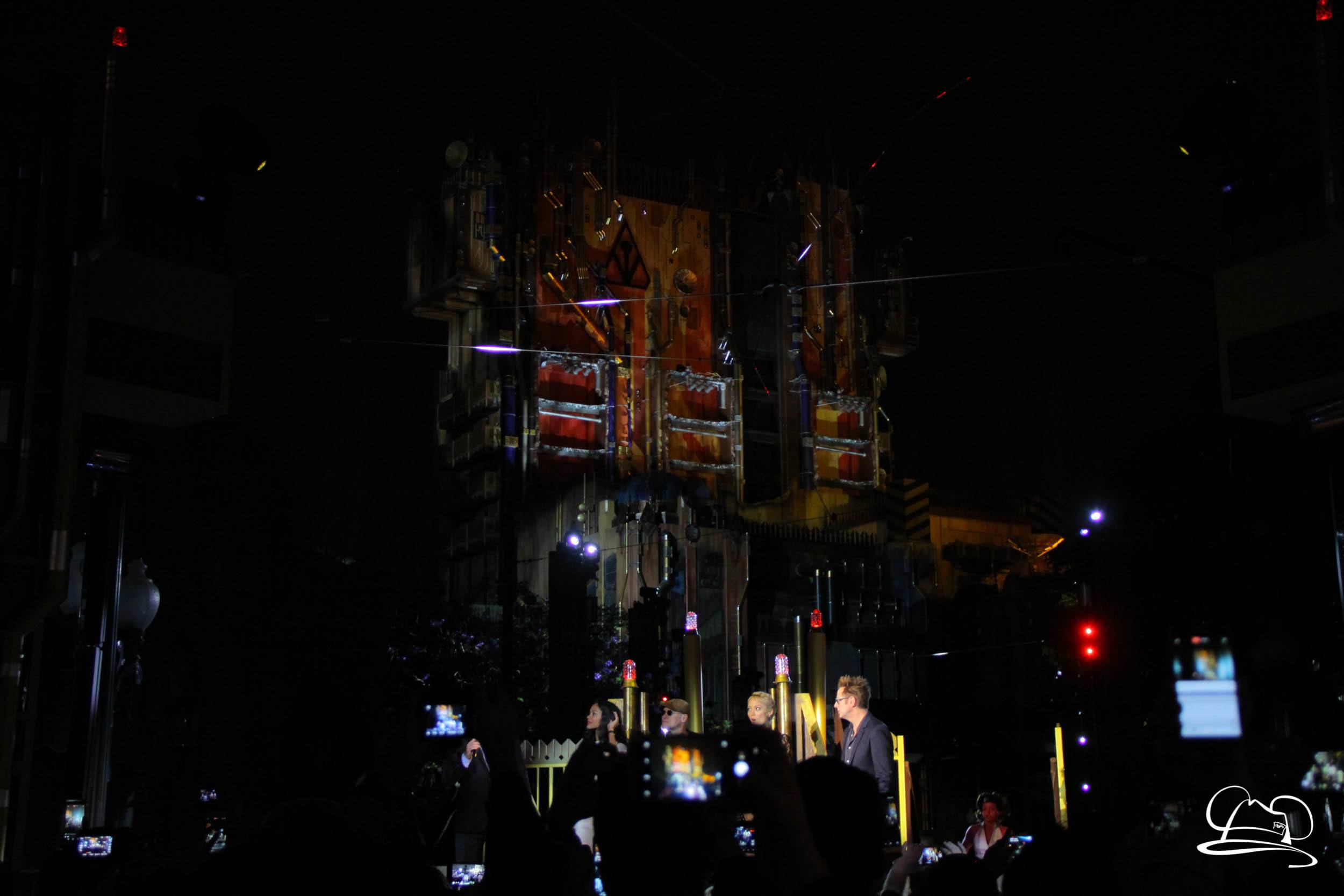 The Disneyland Resort kicked off the Summer of Heroes with a star studded event in Disney California Adventure. After a special party in Hollywood Backlots, a ceremony took place for the opening of the Tivan Collection by The Collector. Hosted by The Collector’s assistant(s), this event included Chairman of Disney Parks and Resorts Bob Chapek and Guardians of the Galaxy Vol. 1 and Vol. 2 director James Gunn. They were joined by Pom Klementieff who portrayed Mantis, Michael Rooker who portrayed Yondu, and Zoe Saldana who plays Gamora. Finally Benicio del Toro joined to take the place of The Collector. When The Collector’s assistant was worried about him taking The Collector’s place he quipped that he was sure The Collector would mind. Moments later the area erupted with lights, lasers, and pyrotechnics as Guardians of the Galaxy – Mission: BREAKOUT! was officially opened to the media and honored guests.