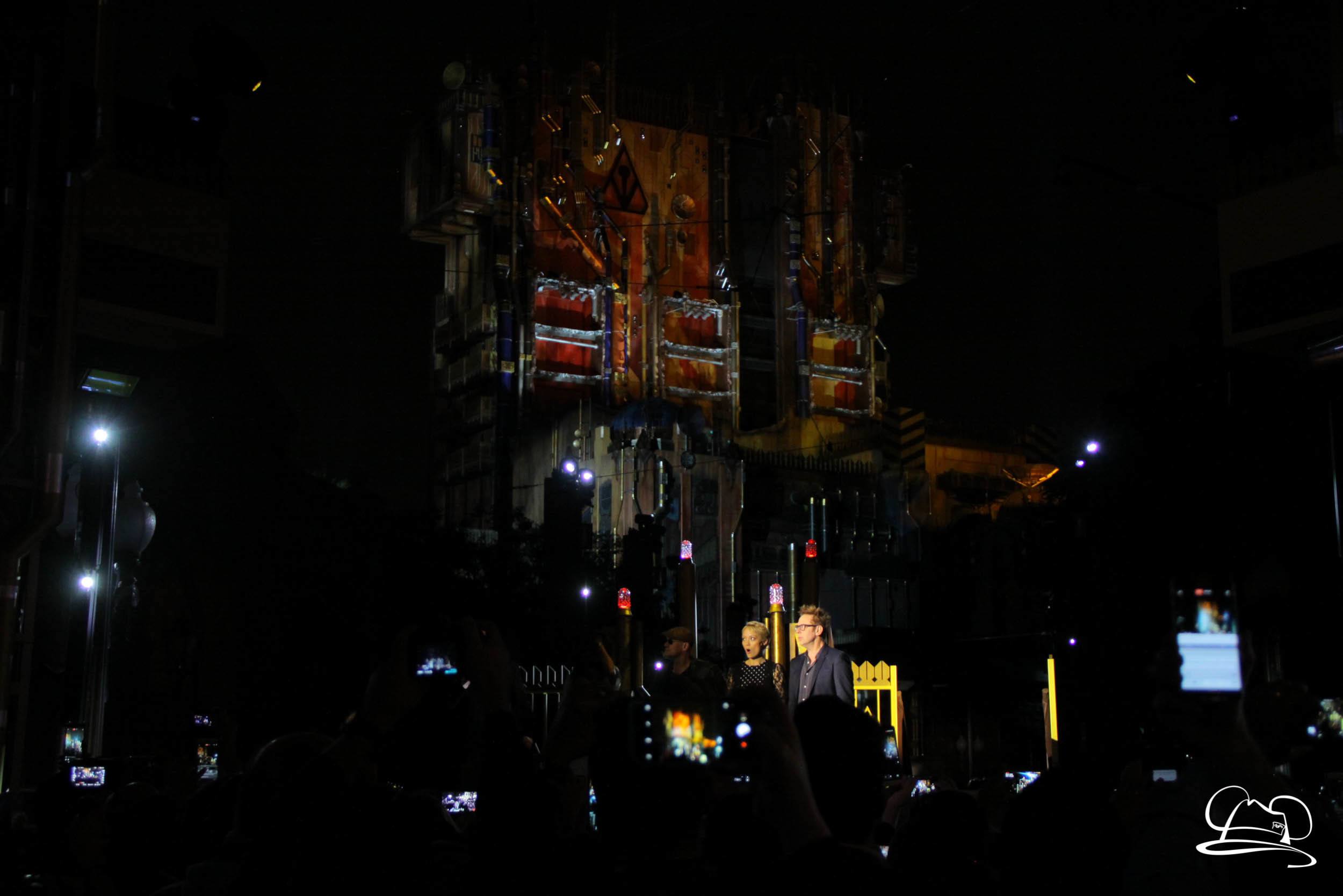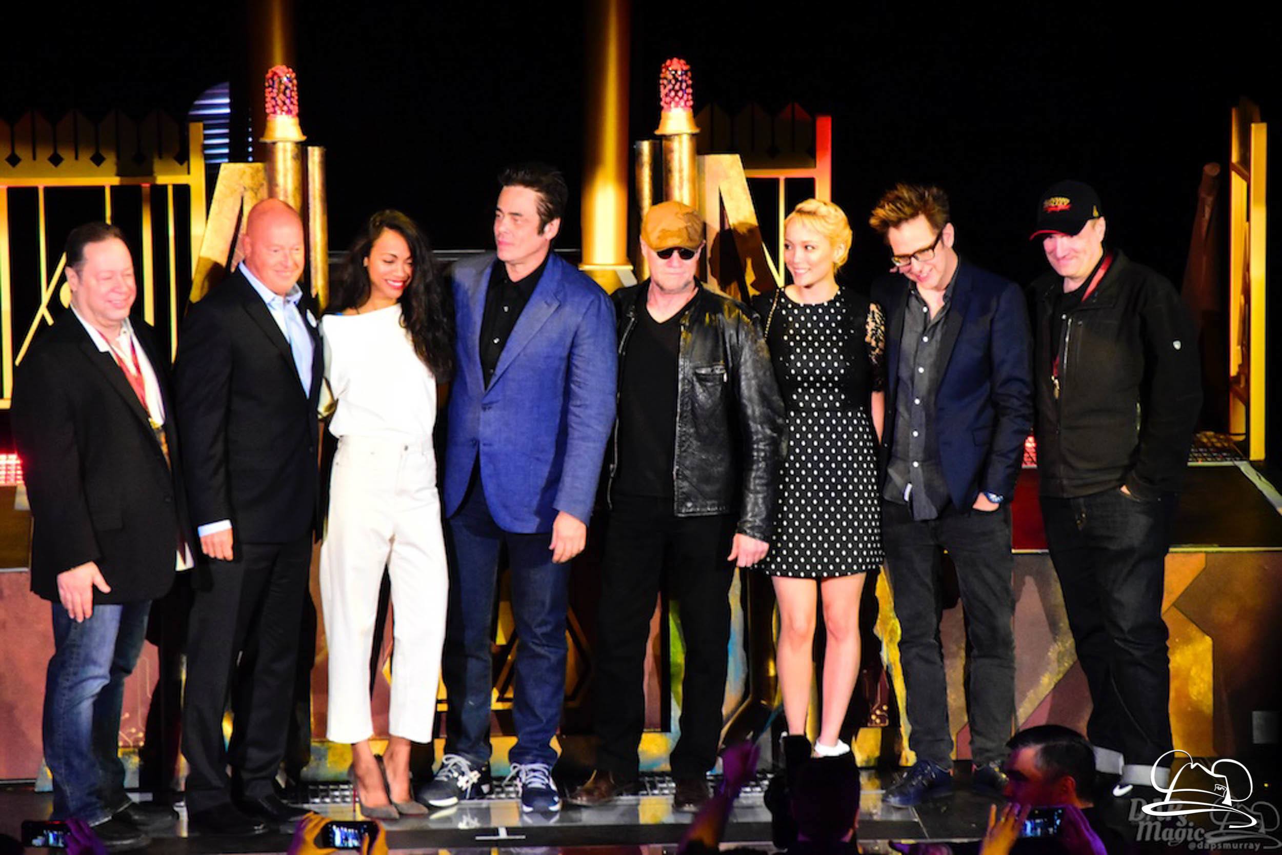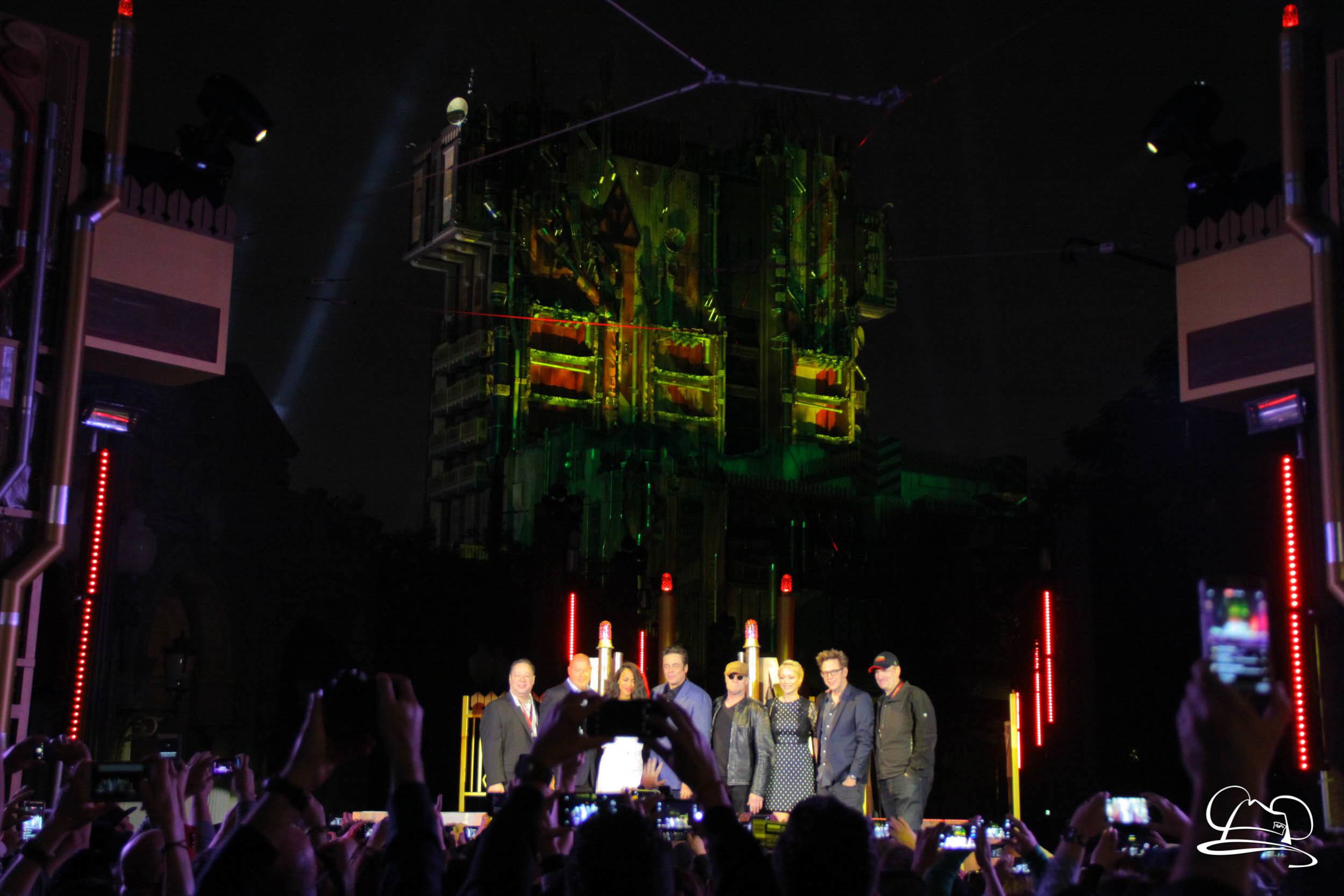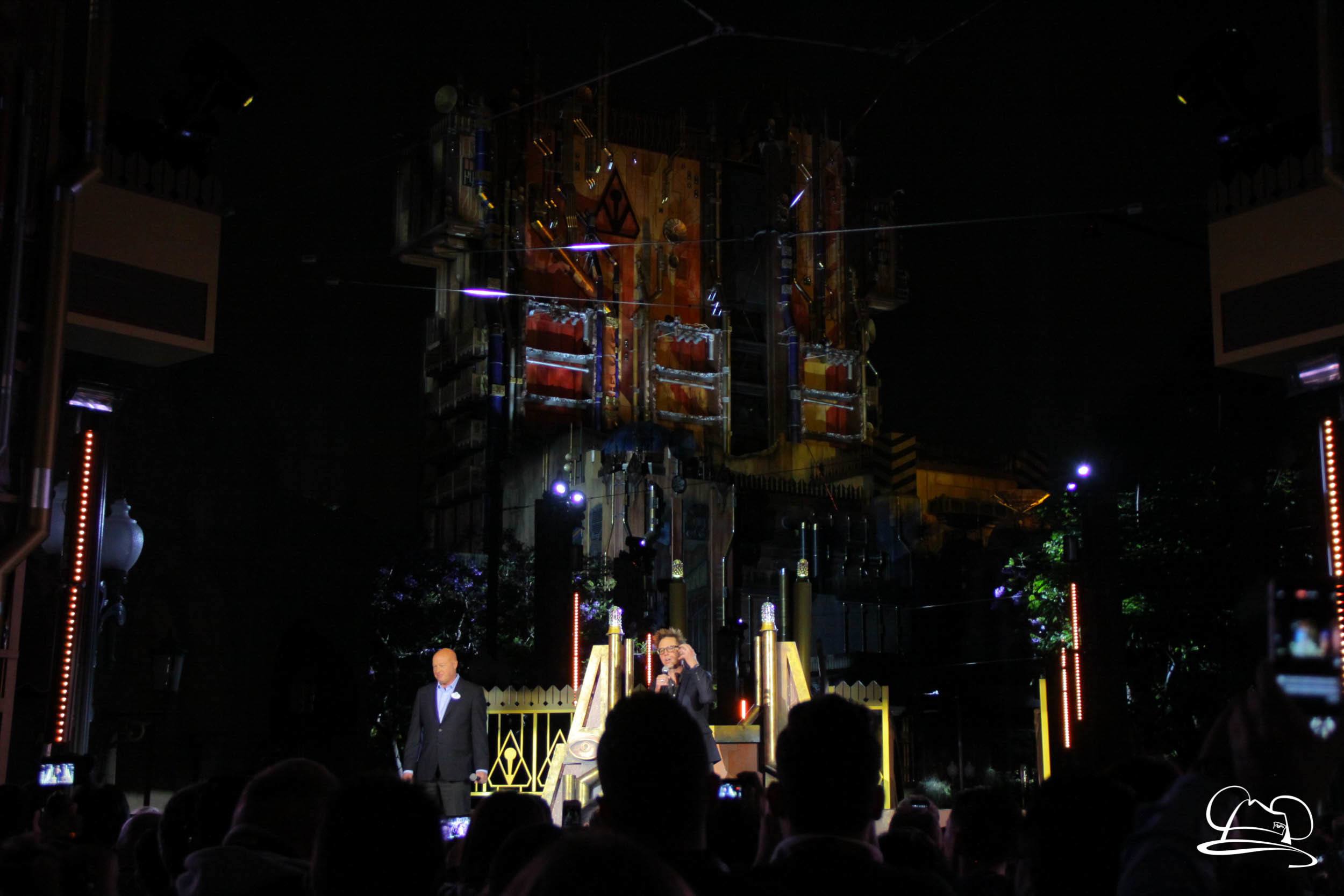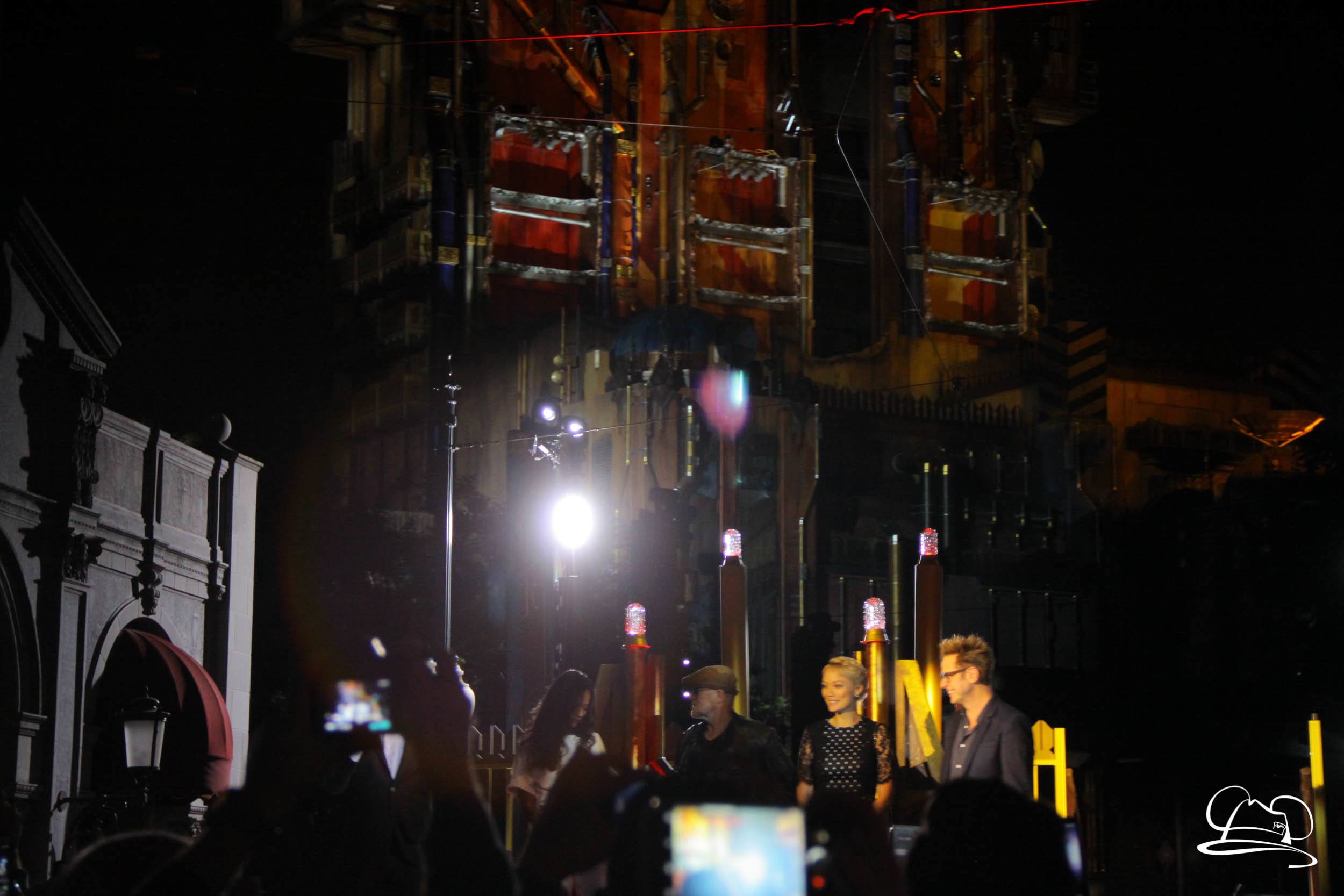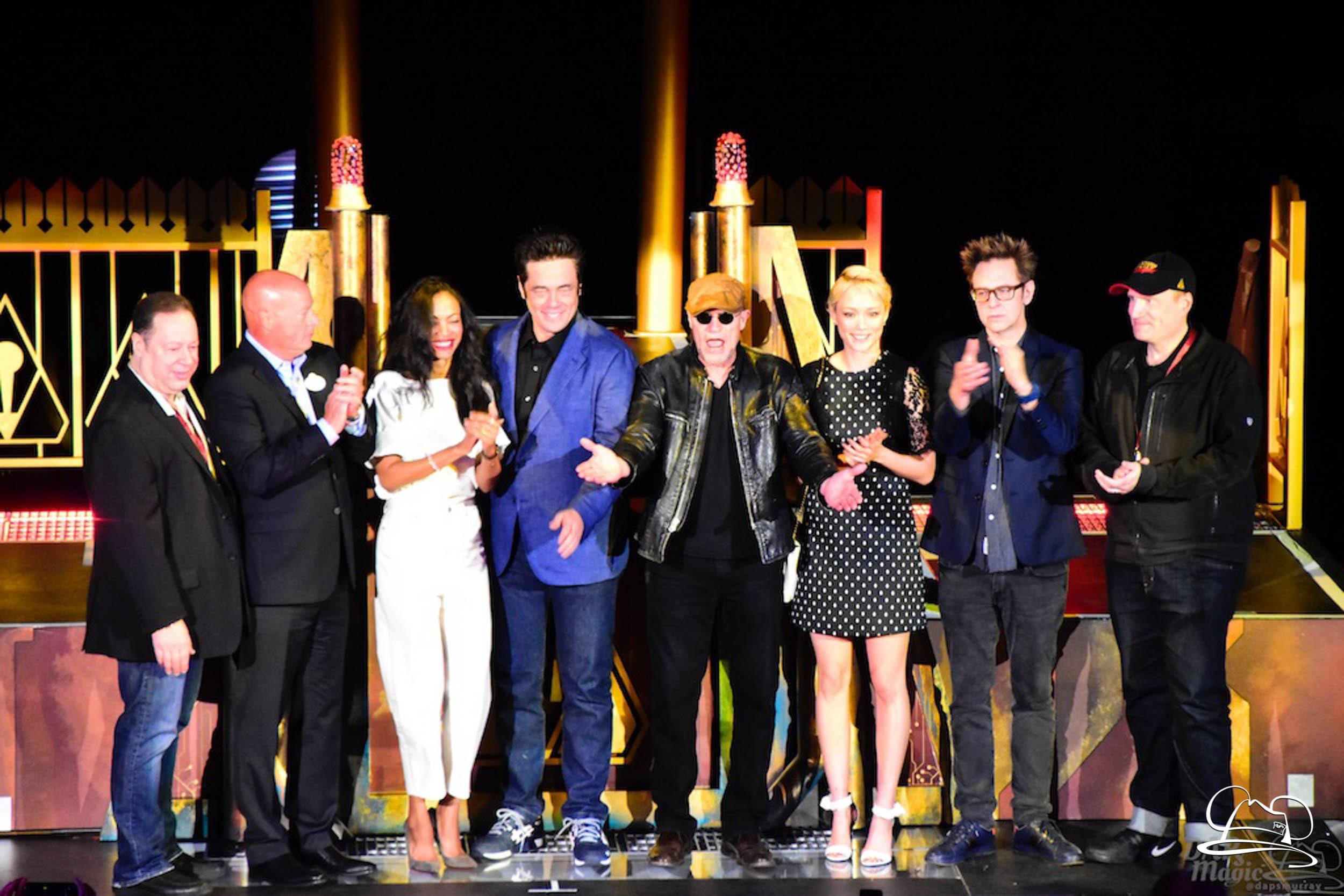 The Disneyland Resort kicked off the Summer of Heroes with a star studded event in Disney California Adventure. After a special party in Hollywood Backlots, a ceremony took place for the opening of the Tivan Collection by The Collector. Hosted by The Collector’s assistant(s), this event included Chairman of Disney Parks and Resorts Bob Chapek and Guardians of the Galaxy Vol. 1 and Vol. 2 director James Gunn. They were joined by Pom Klementieff who portrayed Mantis, Michael Rooker who portrayed Yondu, and Zoe Saldana who plays Gamora. Finally Benicio del Toro joined to take the place of The Collector. When The Collector’s assistant was worried about him taking The Collector’s place he quipped that he was sure The Collector would mind. Moments later the area erupted with lights, lasers, and pyrotechnics as Guardians of the Galaxy – Mission: BREAKOUT! was officially opened to the media and honored guests.