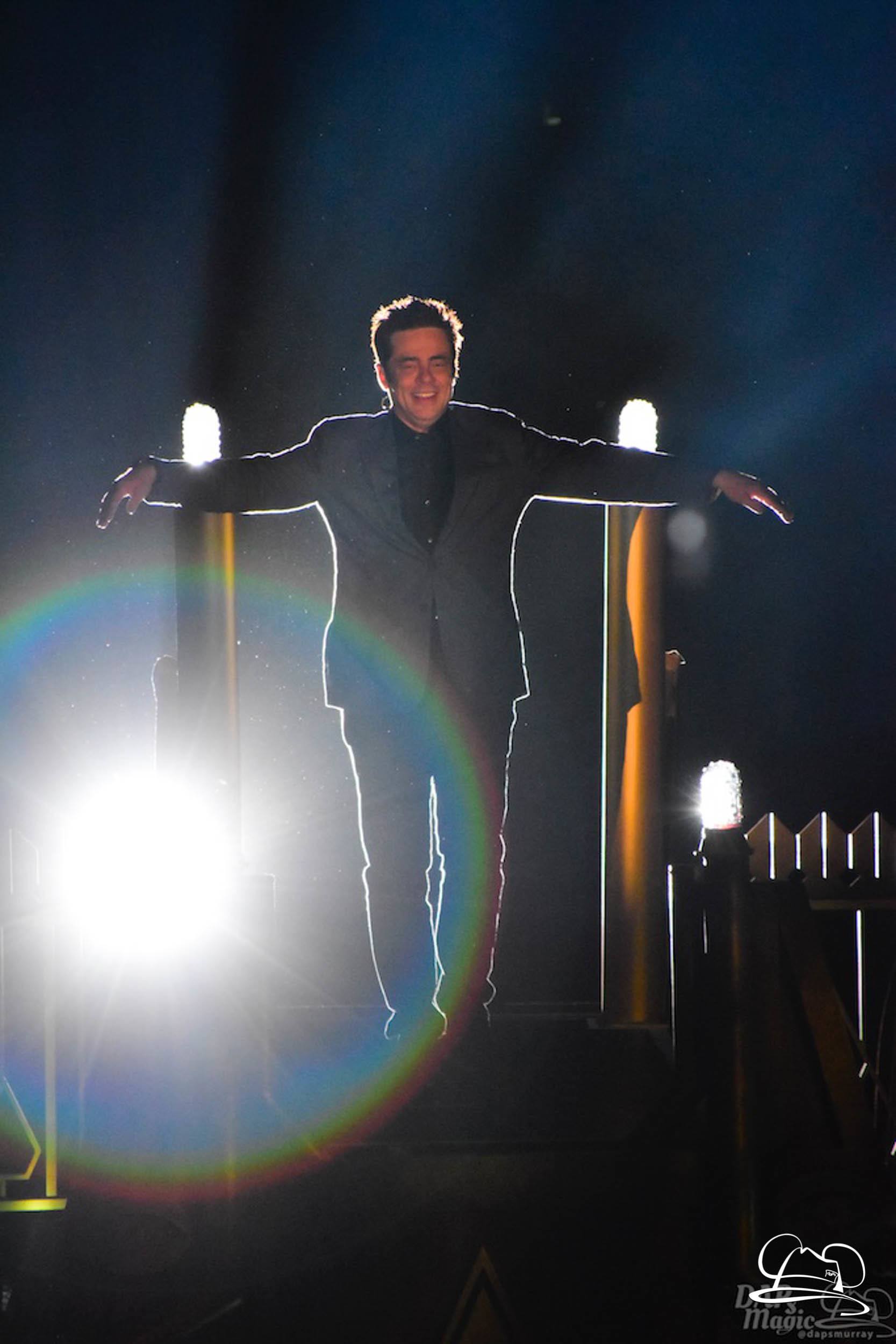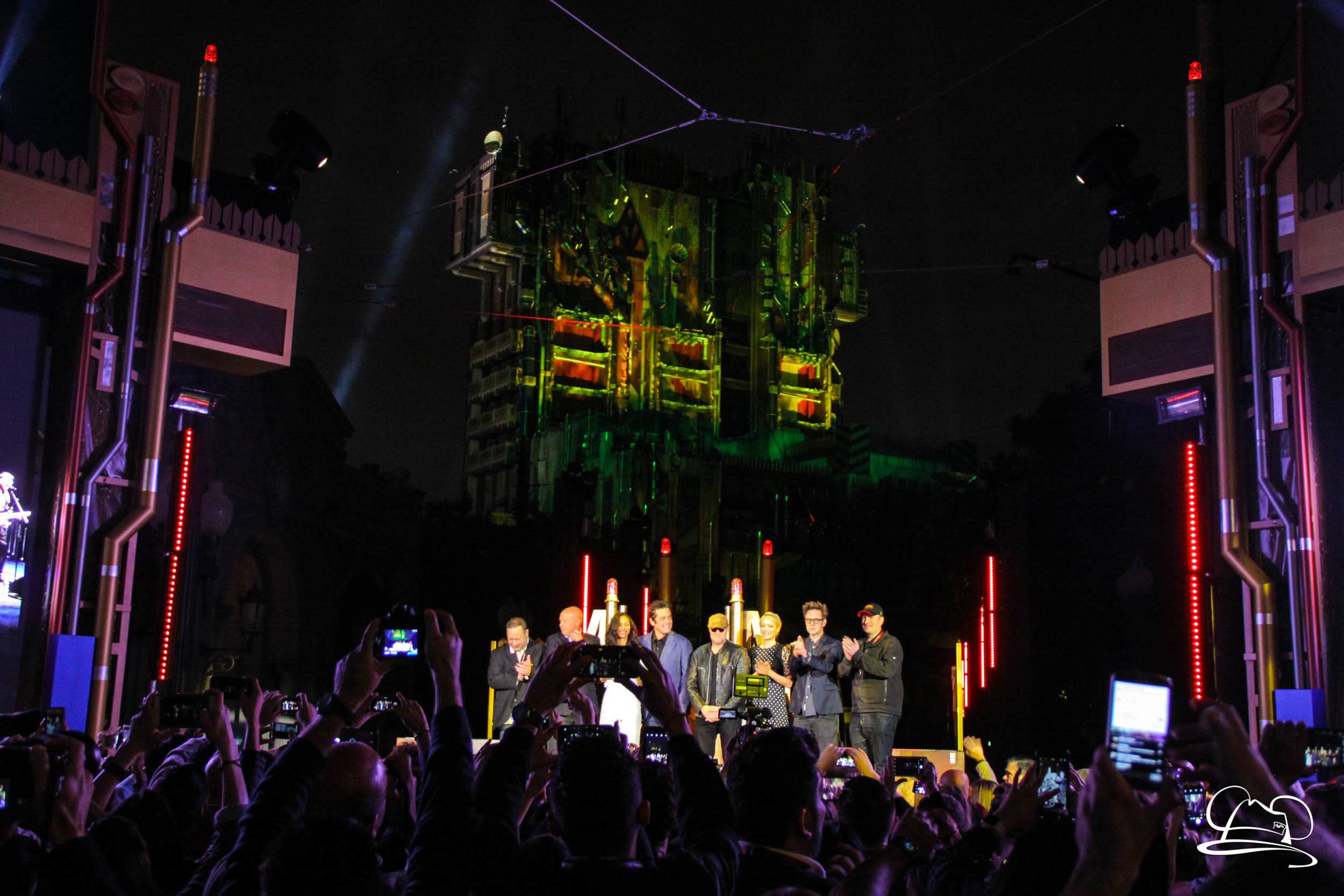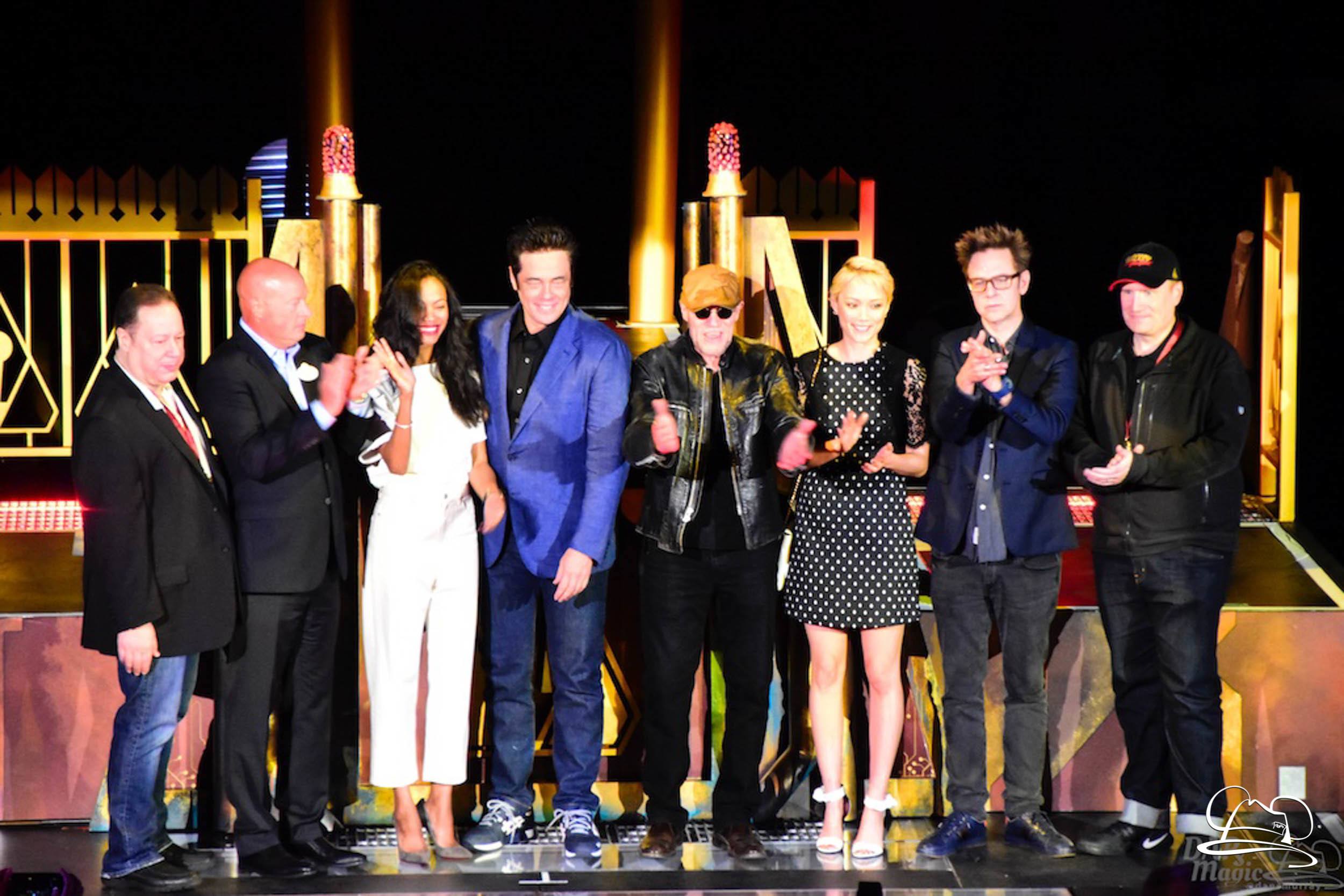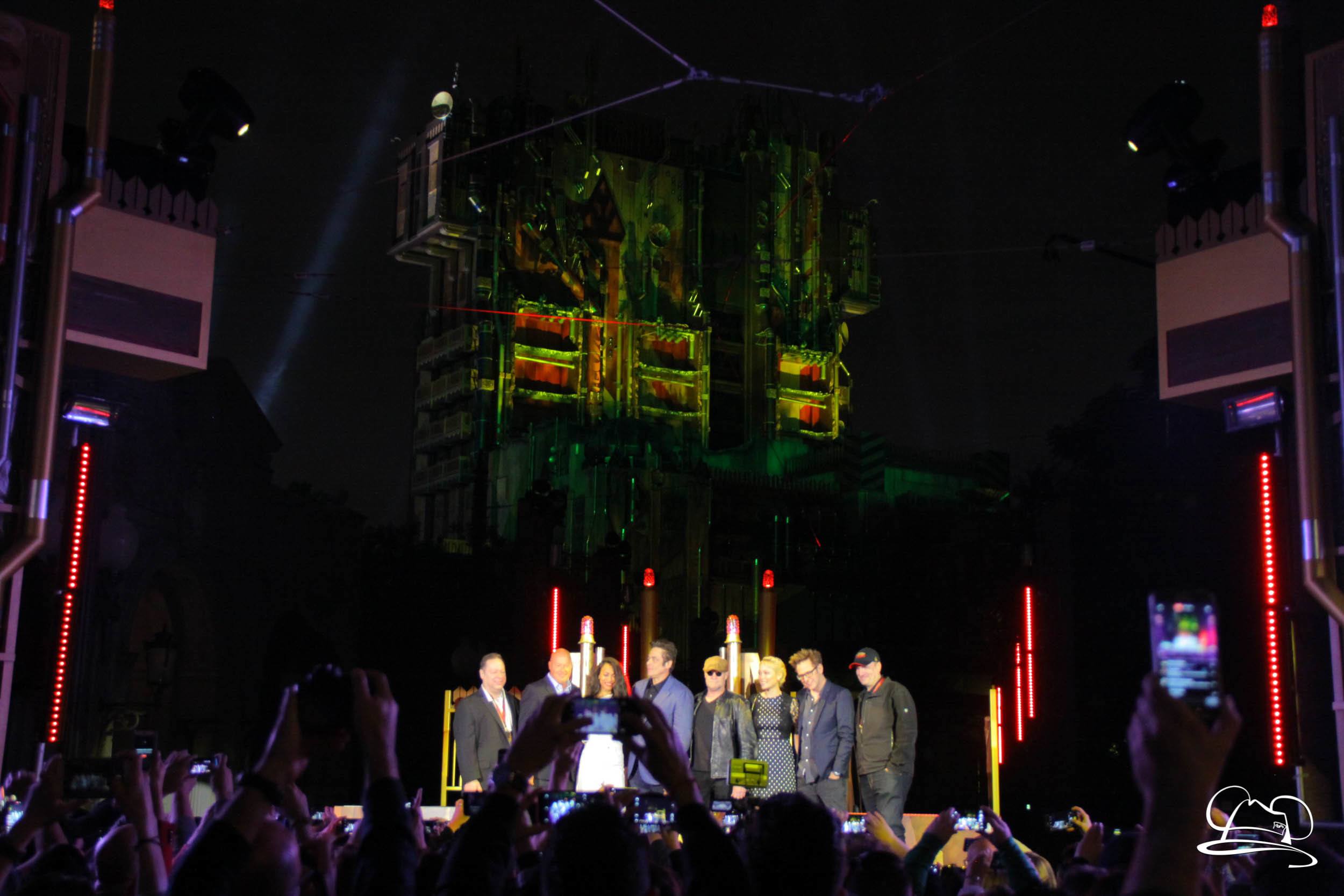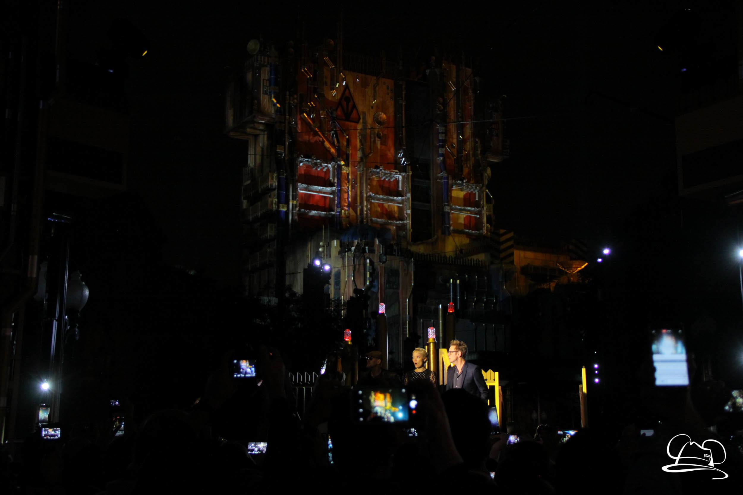 The Disneyland Resort kicked off the Summer of Heroes with a star studded event in Disney California Adventure. After a special party in Hollywood Backlots, a ceremony took place for the opening of the Tivan Collection by The Collector. Hosted by The Collector’s assistant(s), this event included Chairman of Disney Parks and Resorts Bob Chapek and Guardians of the Galaxy Vol. 1 and Vol. 2 director James Gunn. They were joined by Pom Klementieff who portrayed Mantis, Michael Rooker who portrayed Yondu, and Zoe Saldana who plays Gamora. Finally Benicio del Toro joined to take the place of The Collector. When The Collector’s assistant was worried about him taking The Collector’s place he quipped that he was sure The Collector would mind. Moments later the area erupted with lights, lasers, and pyrotechnics as Guardians of the Galaxy – Mission: BREAKOUT! was officially opened to the media and honored guests.