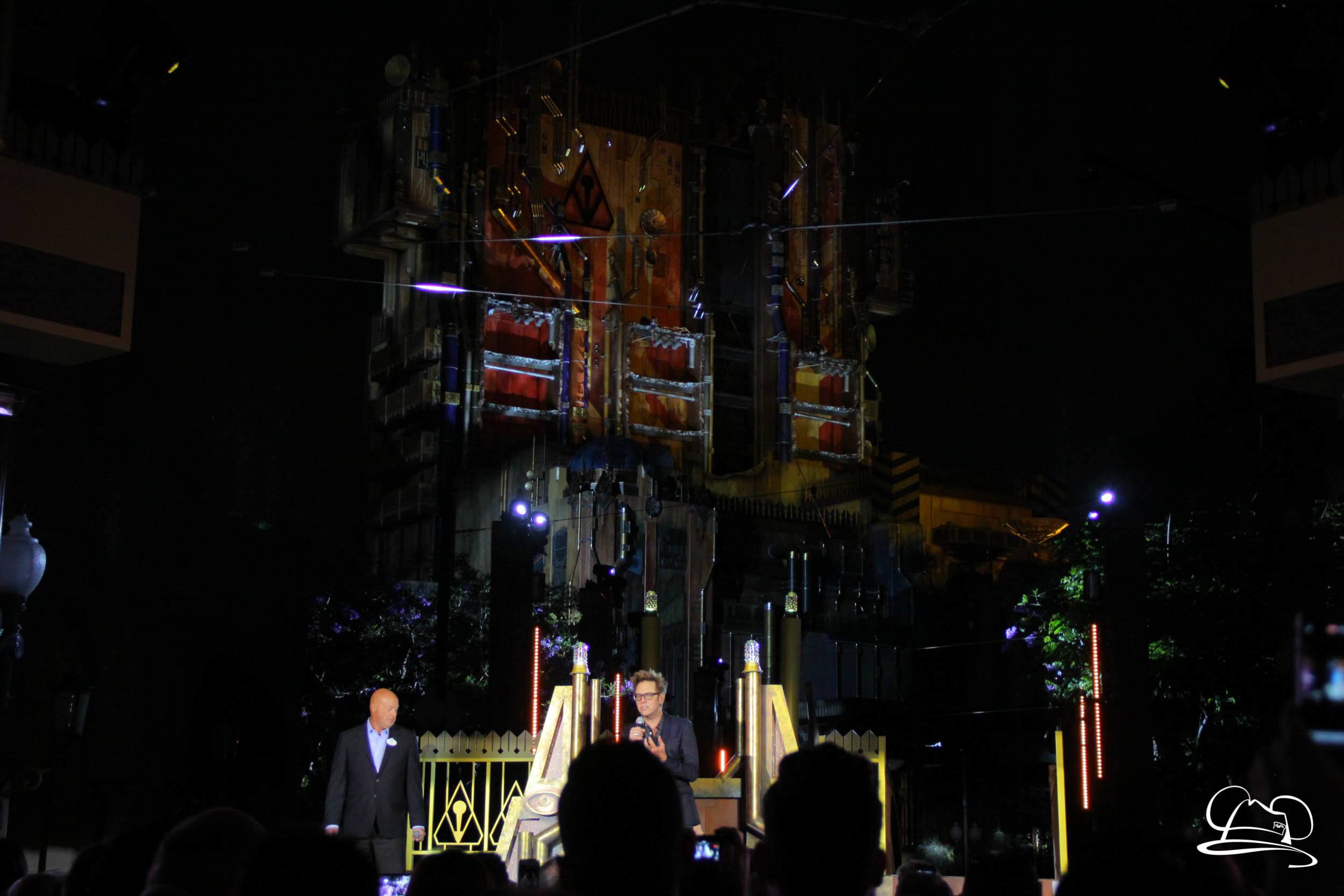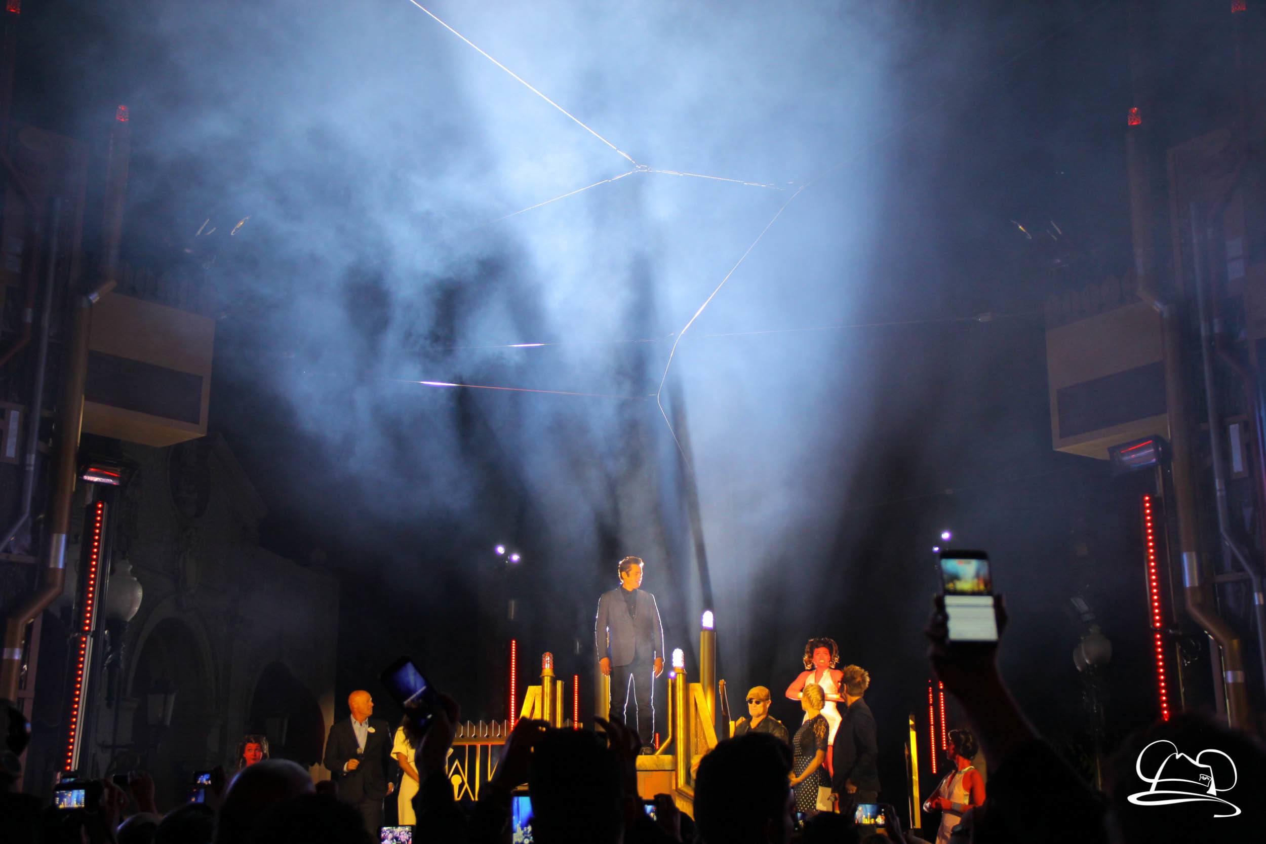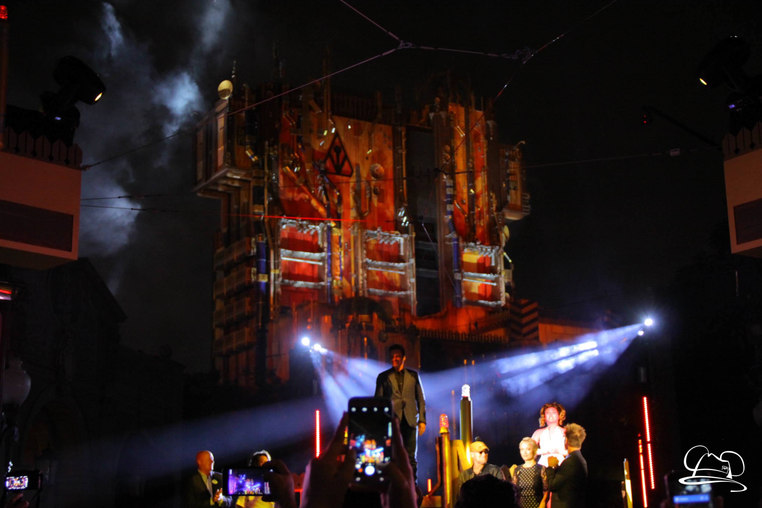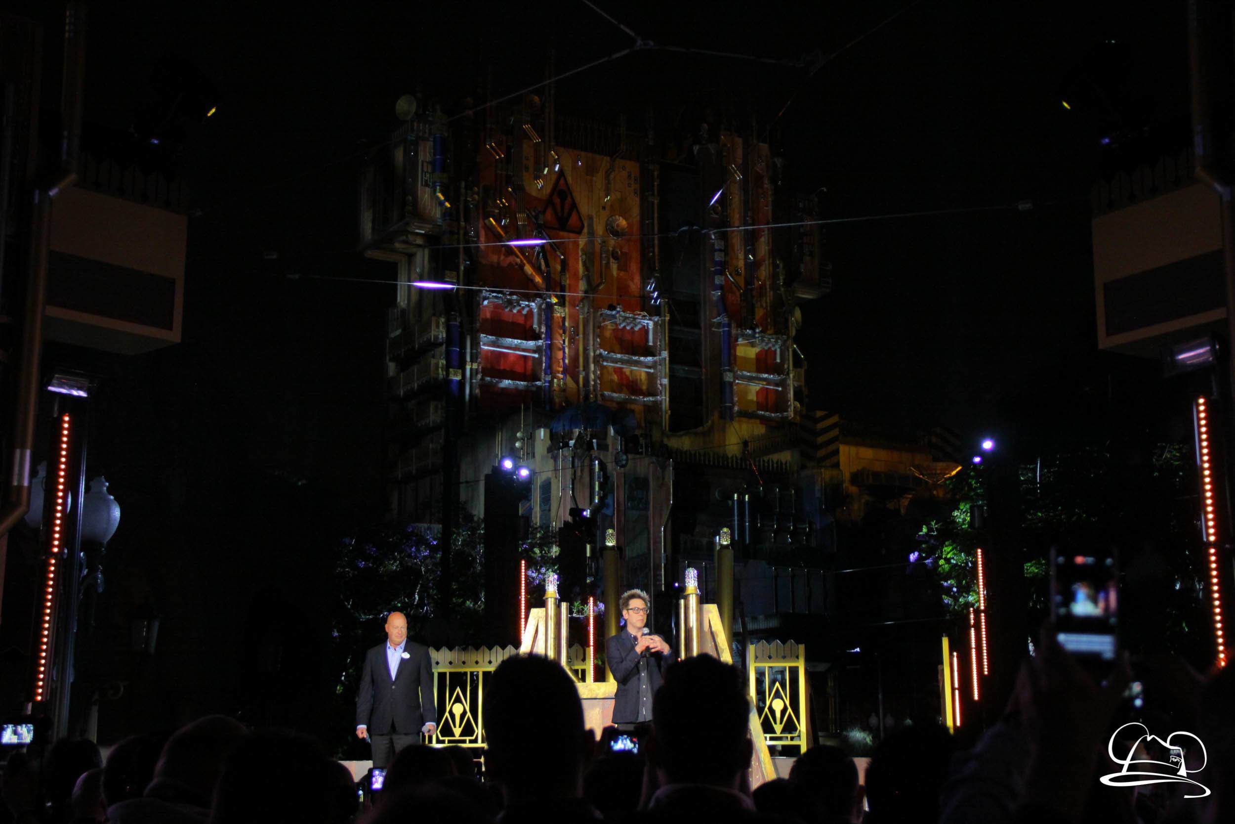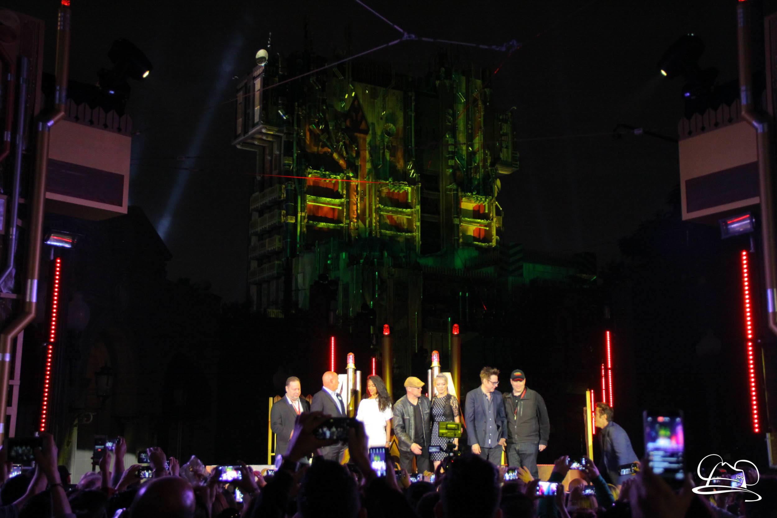 The Disneyland Resort kicked off the Summer of Heroes with a star studded event in Disney California Adventure. After a special party in Hollywood Backlots, a ceremony took place for the opening of the Tivan Collection by The Collector. Hosted by The Collector’s assistant(s), this event included Chairman of Disney Parks and Resorts Bob Chapek and Guardians of the Galaxy Vol. 1 and Vol. 2 director James Gunn. They were joined by Pom Klementieff who portrayed Mantis, Michael Rooker who portrayed Yondu, and Zoe Saldana who plays Gamora. Finally Benicio del Toro joined to take the place of The Collector. When The Collector’s assistant was worried about him taking The Collector’s place he quipped that he was sure The Collector would mind. Moments later the area erupted with lights, lasers, and pyrotechnics as Guardians of the Galaxy – Mission: BREAKOUT! was officially opened to the media and honored guests.