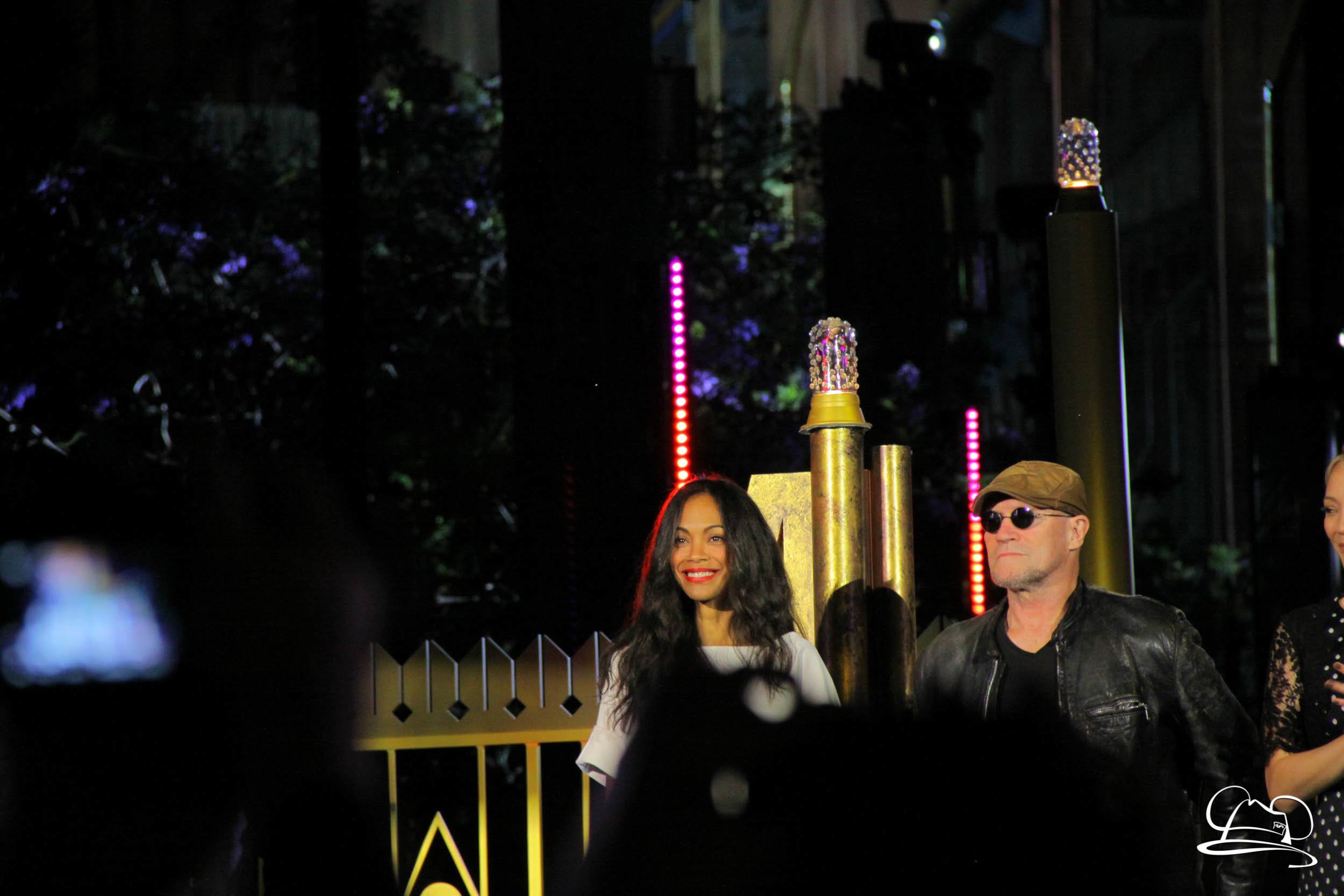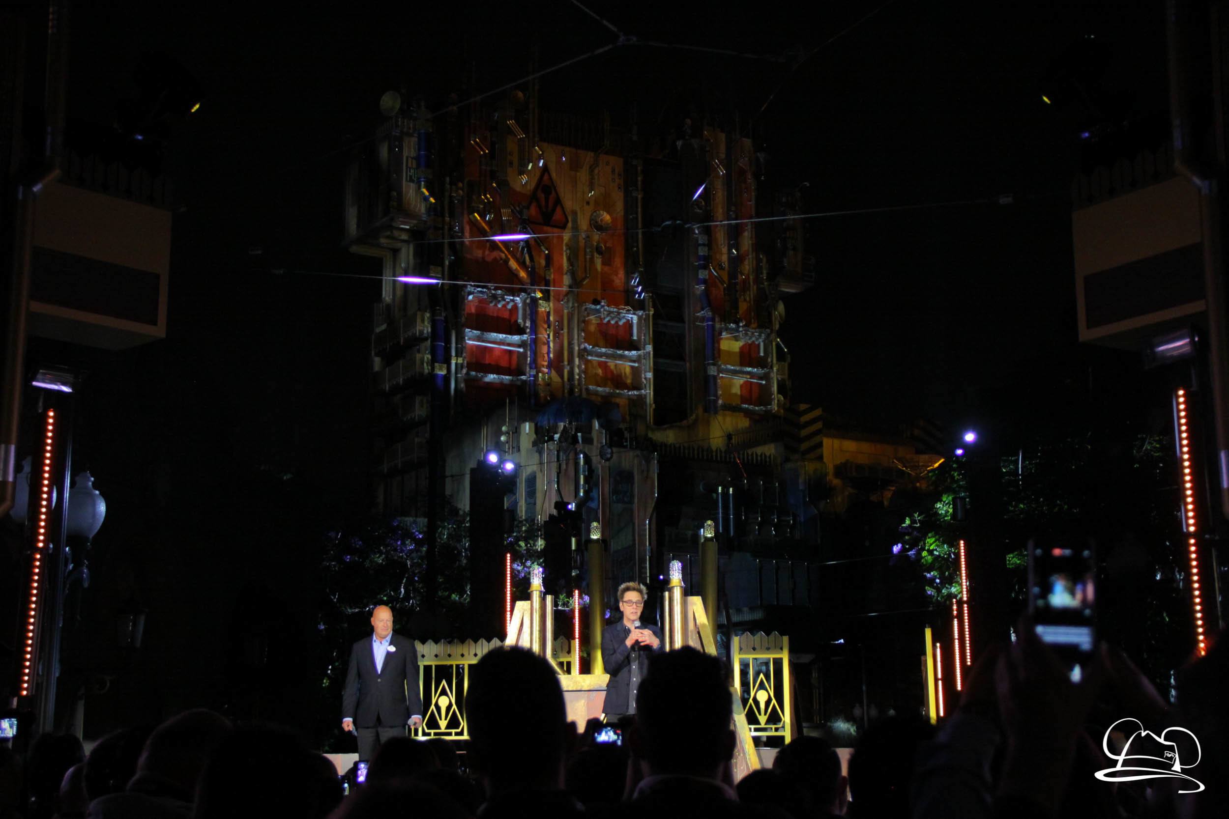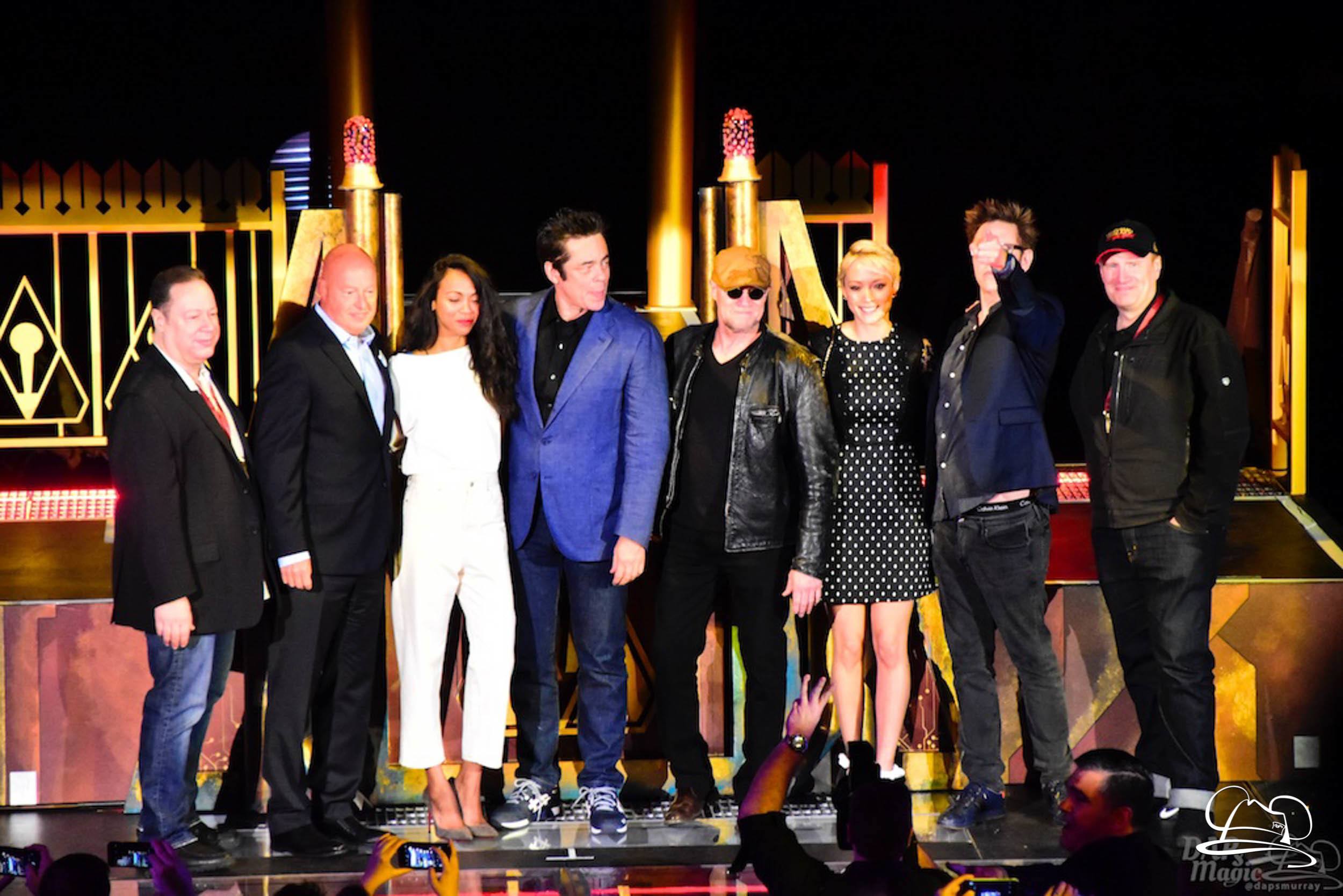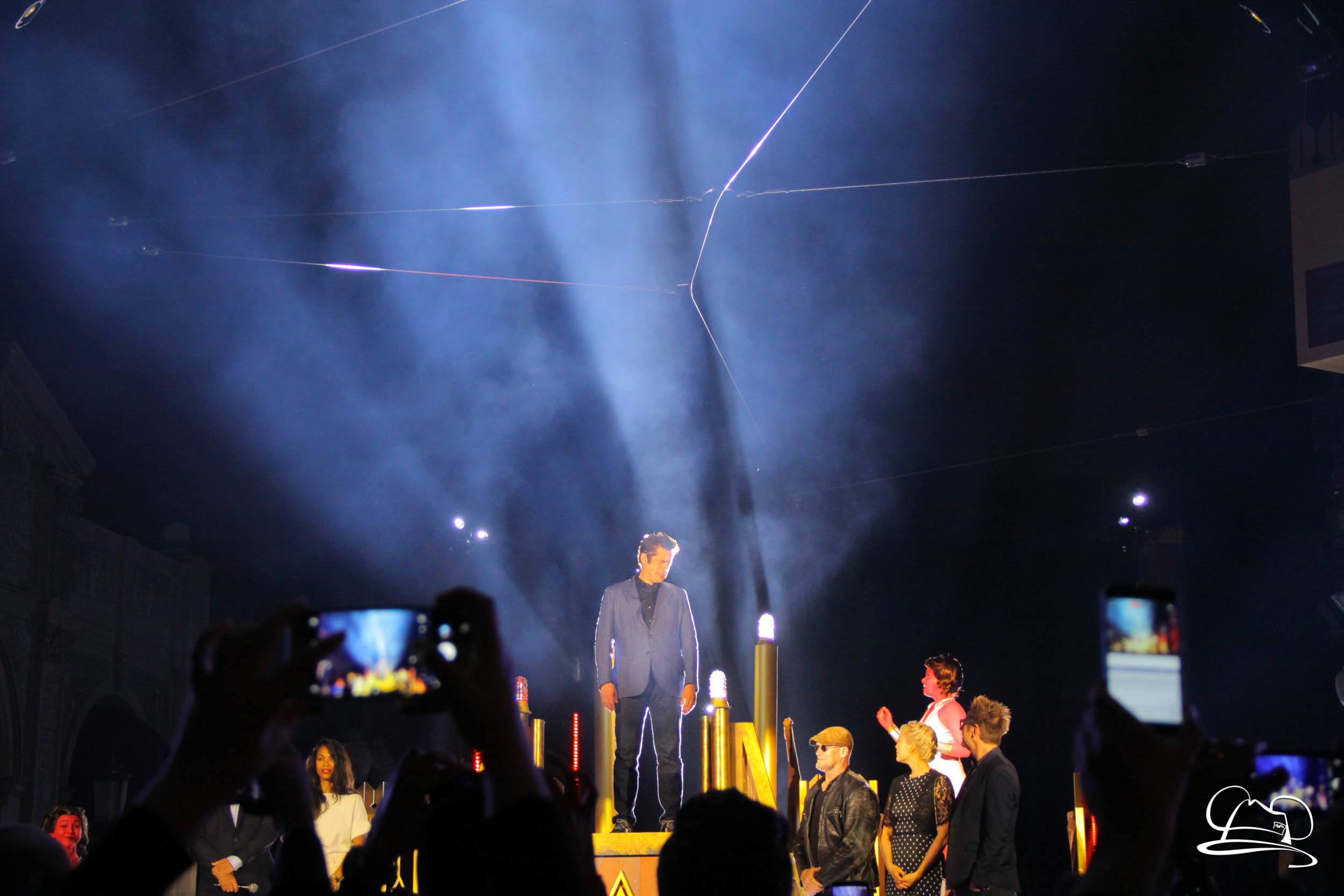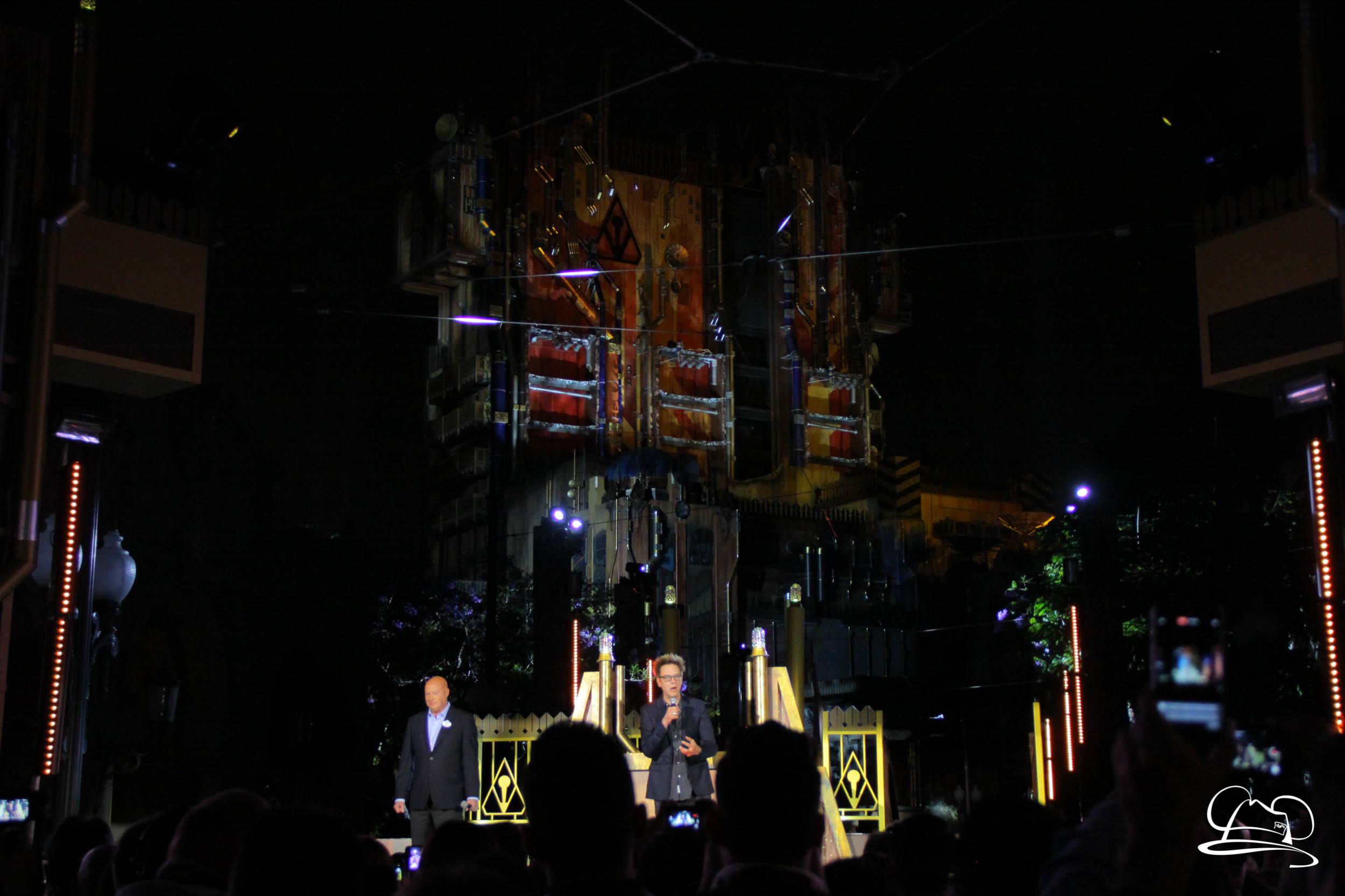The Disneyland Resort kicked off the Summer of Heroes with a star studded event in Disney California Adventure. After a special party in Hollywood Backlots, a ceremony took place for the opening of the Tivan Collection by The Collector. Hosted by The Collector’s assistant(s), this event included Chairman of Disney Parks and Resorts Bob Chapek and Guardians of the Galaxy Vol. 1 and Vol. 2 director James Gunn. They were joined by Pom Klementieff who portrayed Mantis, Michael Rooker who portrayed Yondu, and Zoe Saldana who plays Gamora. Finally Benicio del Toro joined to take the place of The Collector. When The Collector’s assistant was worried about him taking The Collector’s place he quipped that he was sure The Collector would mind. Moments later the area erupted with lights, lasers, and pyrotechnics as Guardians of the Galaxy – Mission: BREAKOUT! was officially opened to the media and honored guests.