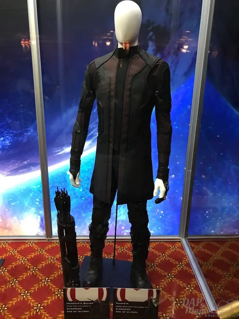Though it was announced, this new montage movie was quietly opened at the Sunset Showcase Theater. In the waiting area there are four costumes and props of Avengers. Black Widow, Captain America, Thor, and Hawkeye costumes are featured in these glass cases.