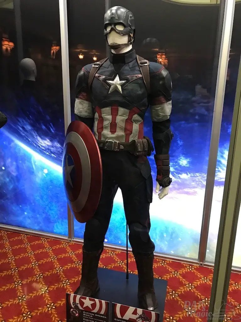 Though it was announced, this new montage movie was quietly opened at the Sunset Showcase Theater. In the waiting area there are four costumes and props of Avengers. Black Widow, Captain America, Thor, and Hawkeye costumes are featured in these glass cases.