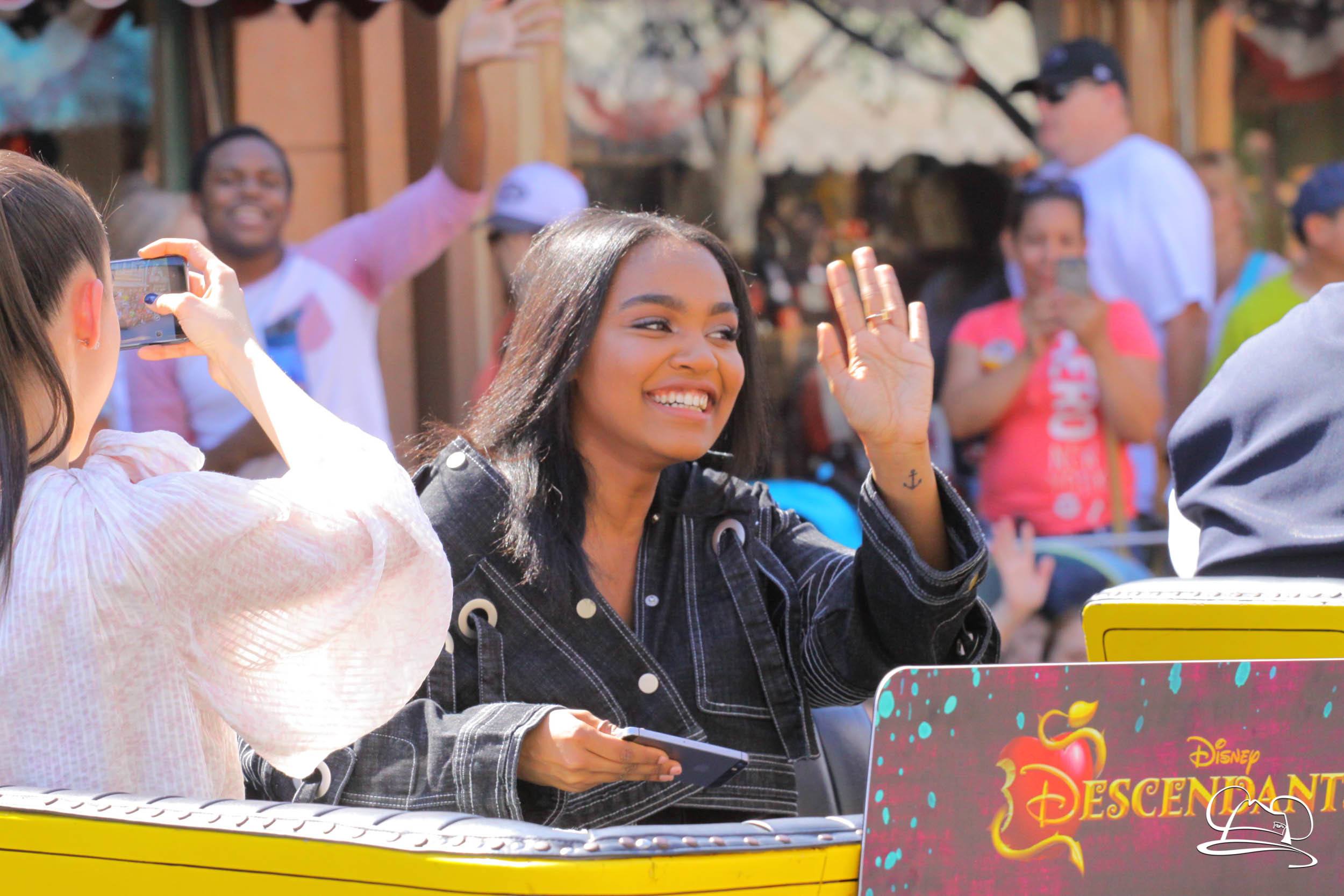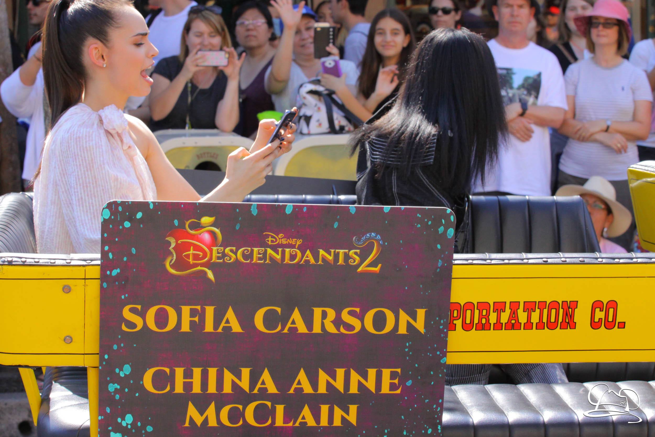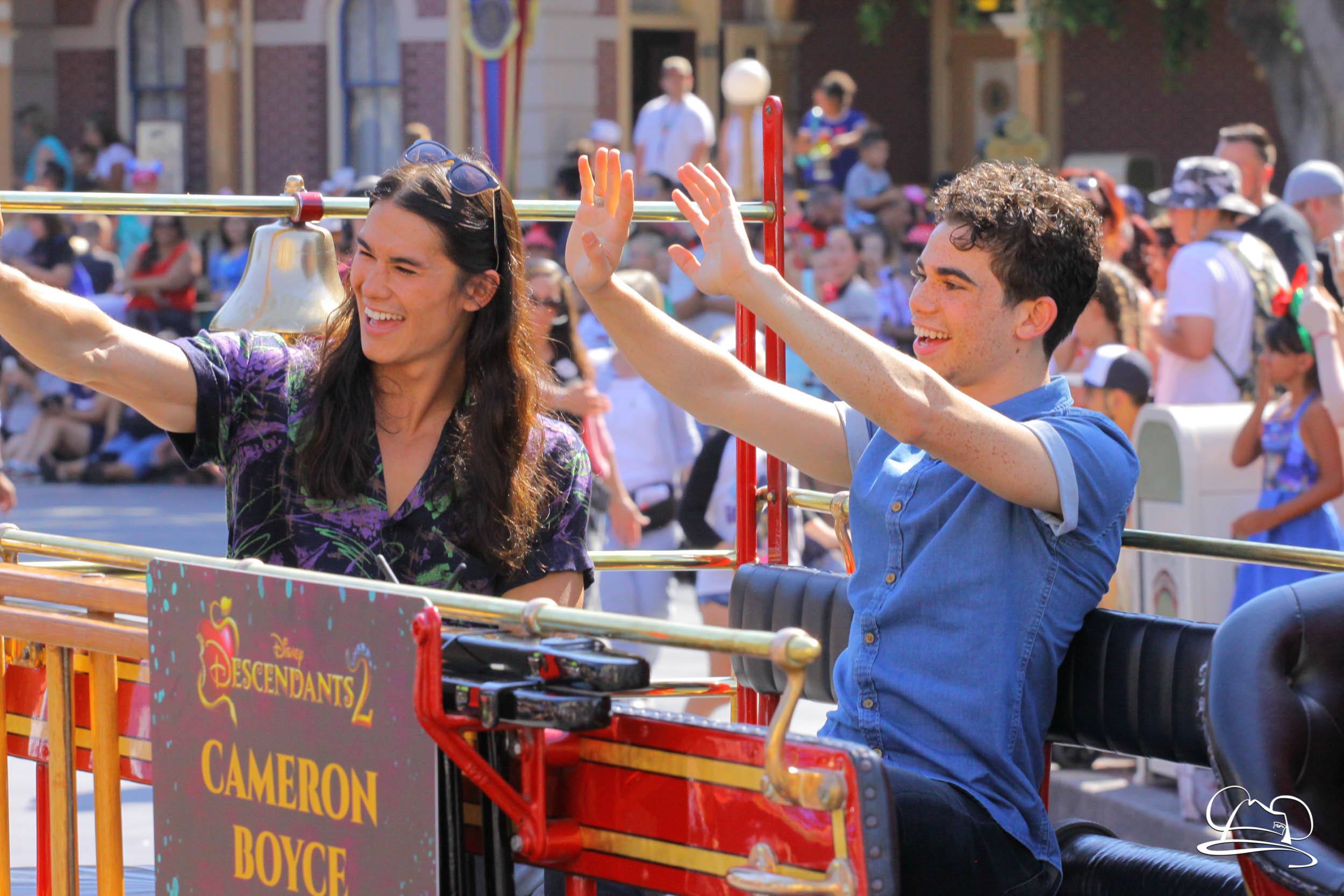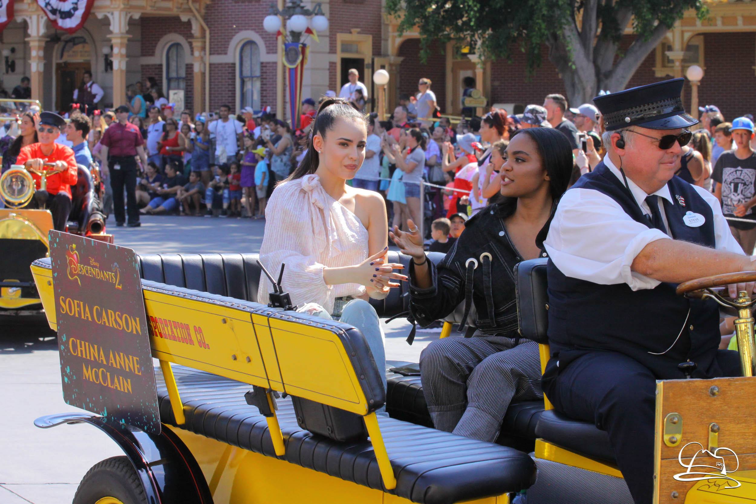 Today the cast of Disney Descendants 2 came to Disneyland. They were a part of the pre-parade before Mickey’s Soundsational Parade. With music from the movie and screams from fans, the stars made their way up the route. Mal (Dove Cameron), Evie (Sofia Carson), Carlos (Cameron Boyce), Jay (Booboo Stewart) and Uma (China Anne McClain), along with Emmy Award-winning director Kenny Ortega were the Grand Marshals for the pre-parade.