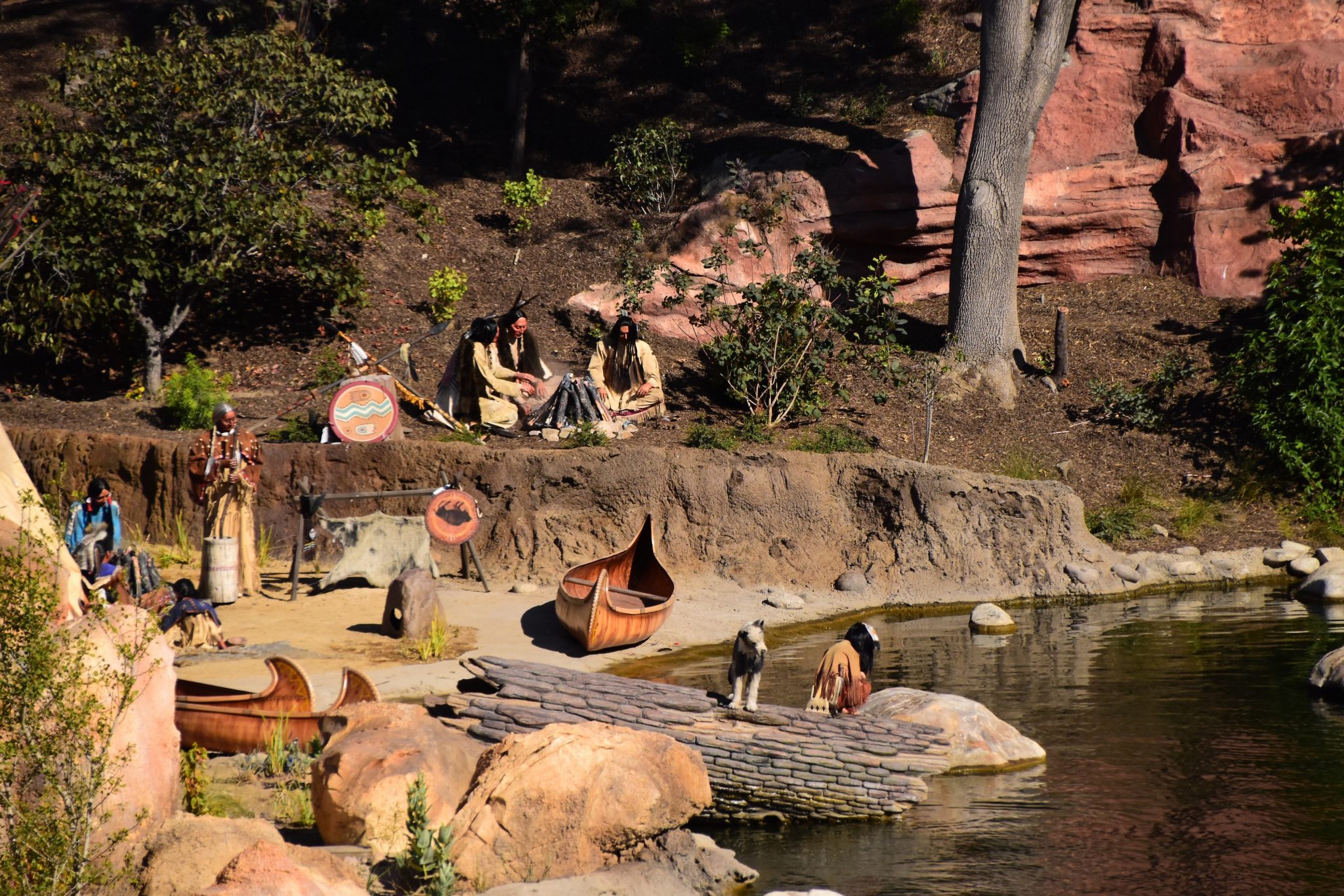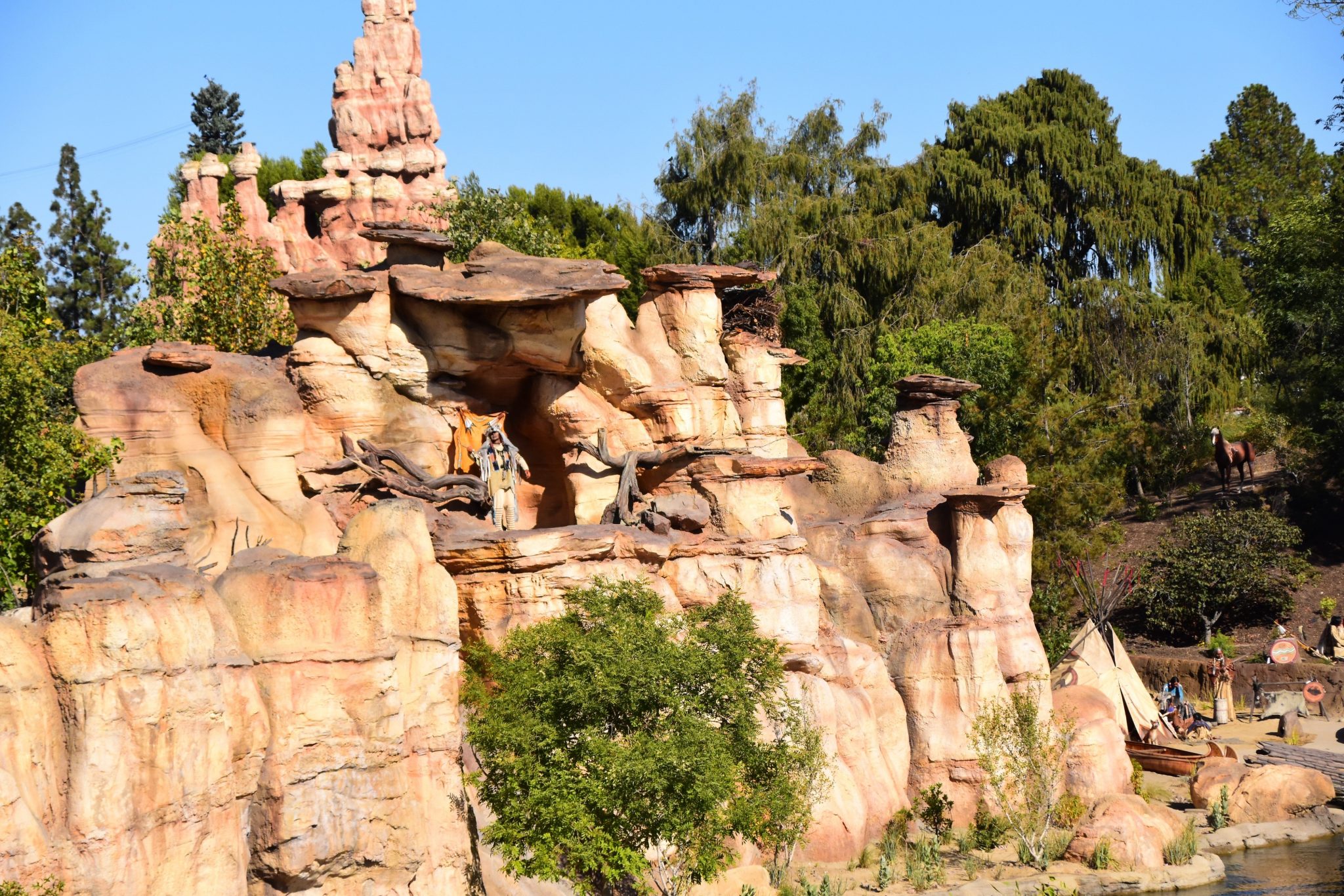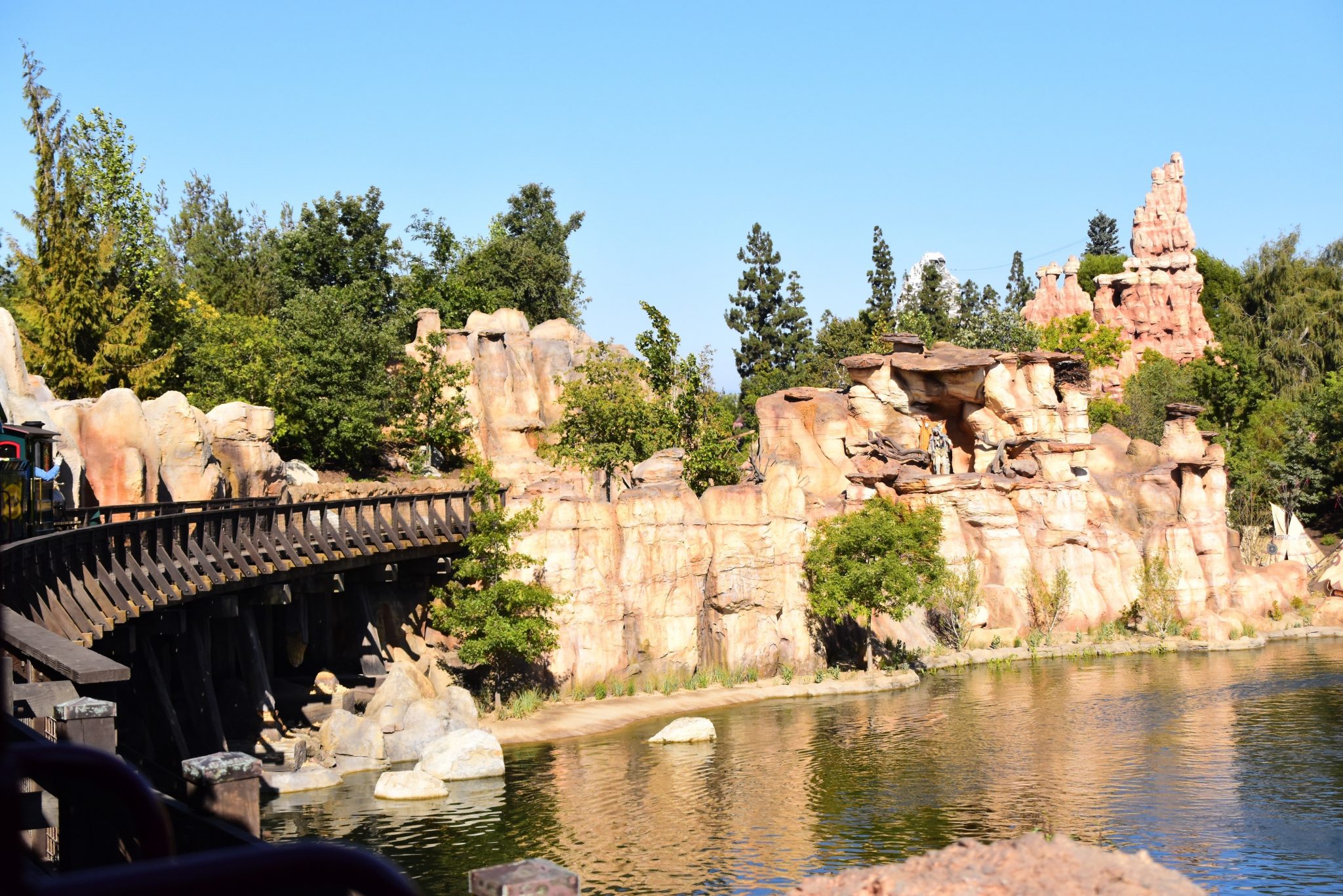 The significant difference along the track is seen after Critter Country, along Rivers of America. Some of the views you can see from the various river boats. The train has a nice birds eye view of these. The new Indian Chief waves at guests aboard the train. The trestle is an elegant feature while traveling by railway. And the rock work by Big Thunder Mountain gives it a great wilderness feel. There are many new sights to see from these areas.