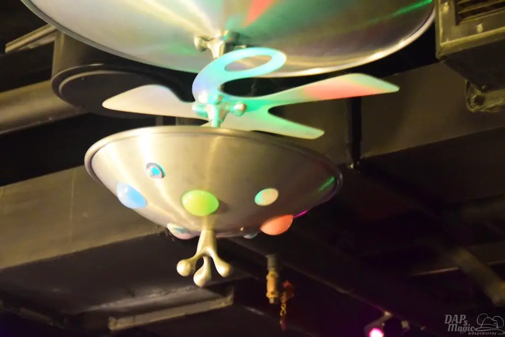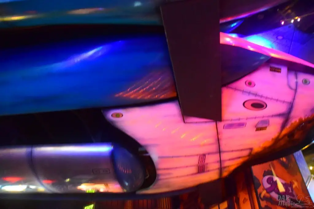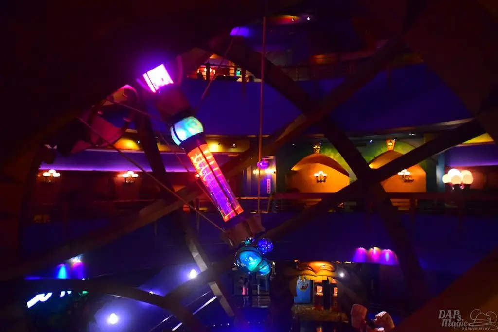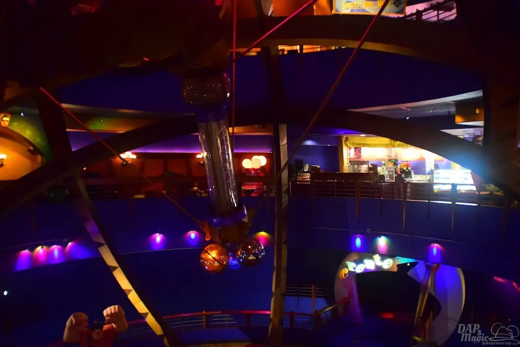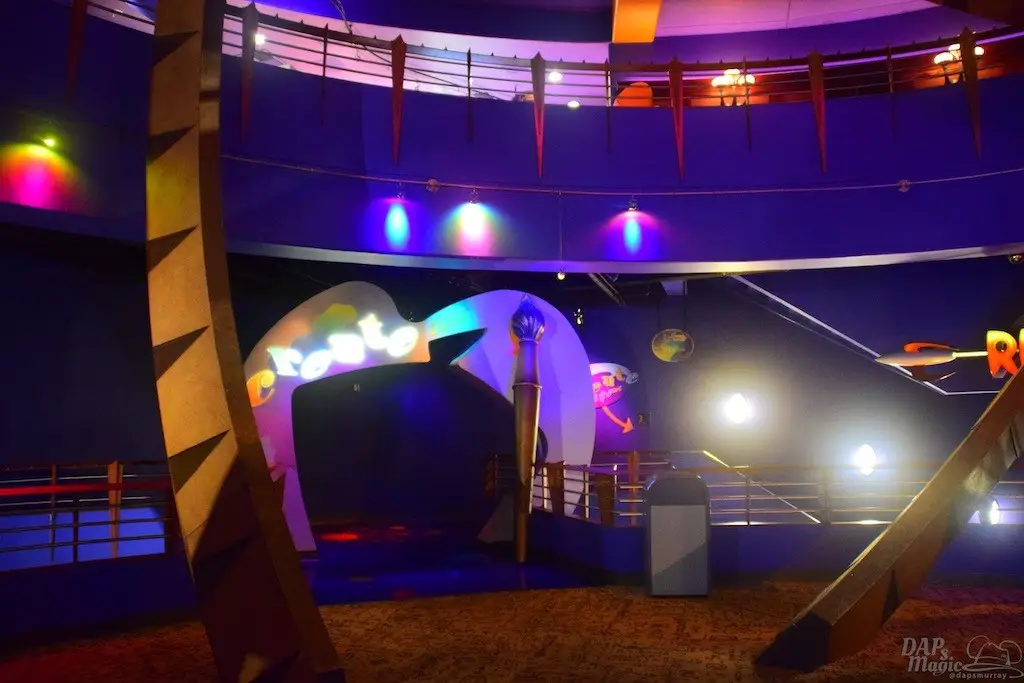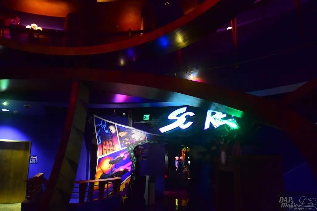 Once the Cybrolator ride ended, guests were let out at VenturePort – the entry to all the Zones. A giant lit up sculpture was featured at the top of the ceiling and the entrances to the zones were seen from the center hub.