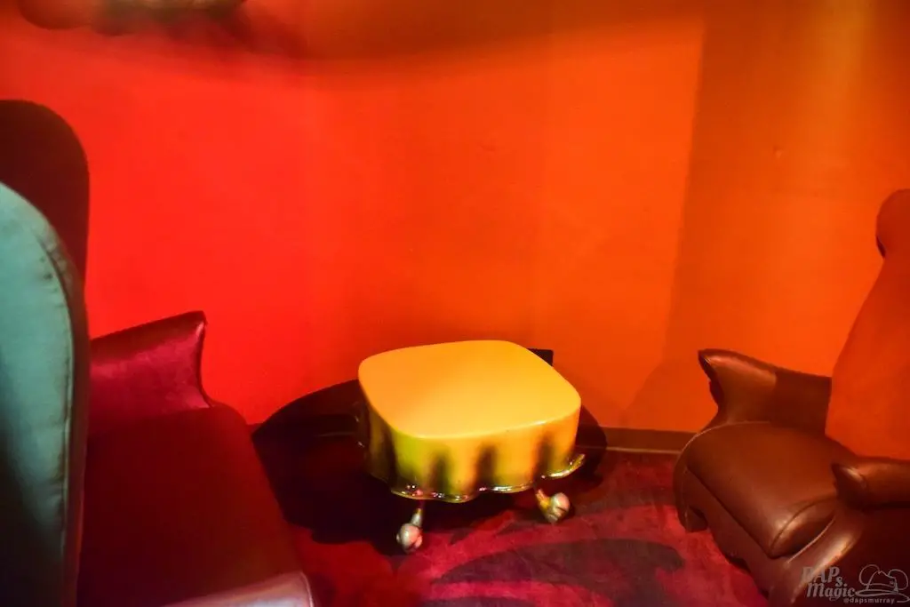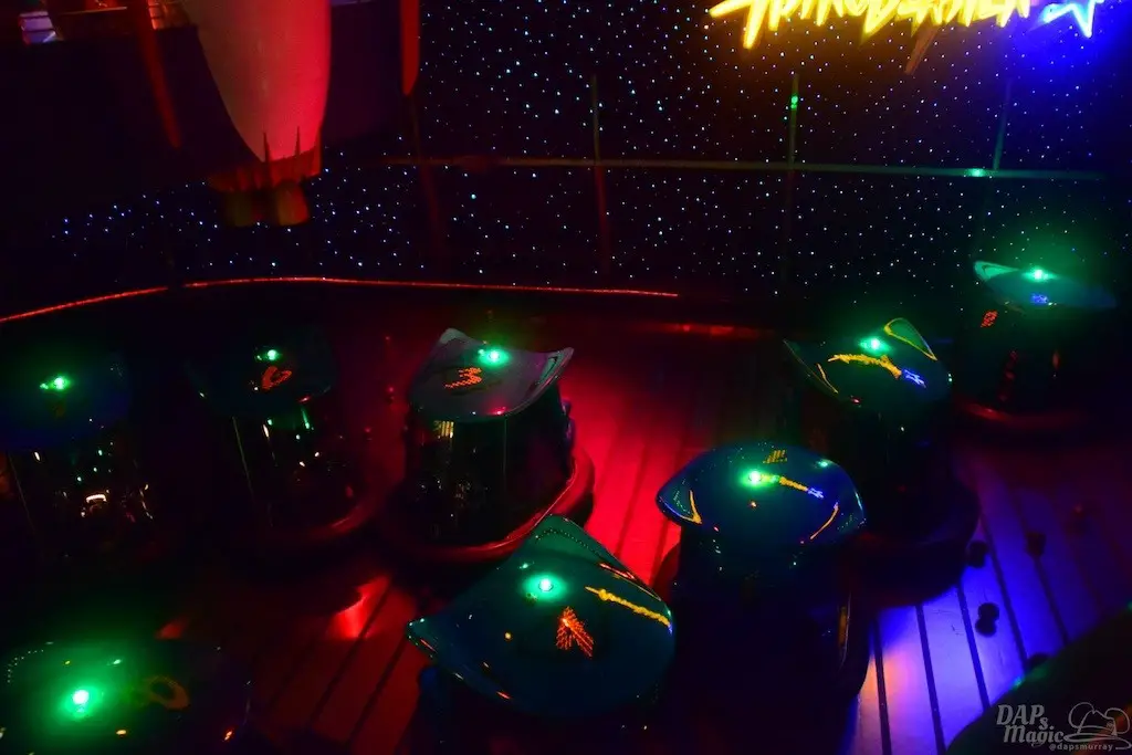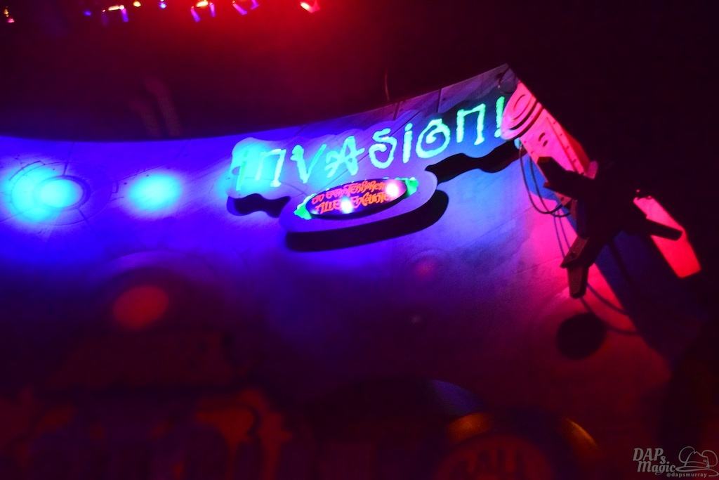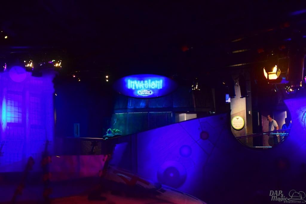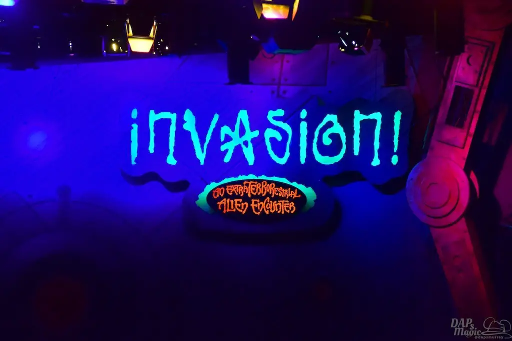 Invasion! An Alien Encounter used “pod” rooms where four people worked together to rescue workers trapped on a hostile planet. One pilot maneuvered the contraption which was simulated through displays wrapping around the whole pod. Others were gunners destroying the hostile aliens. Guests sat back to back but could talk to each other in the pod. The game also used XS Tech character Chairman Clench, and both were part of former Magic Kingdom attraction Alien Encounter.