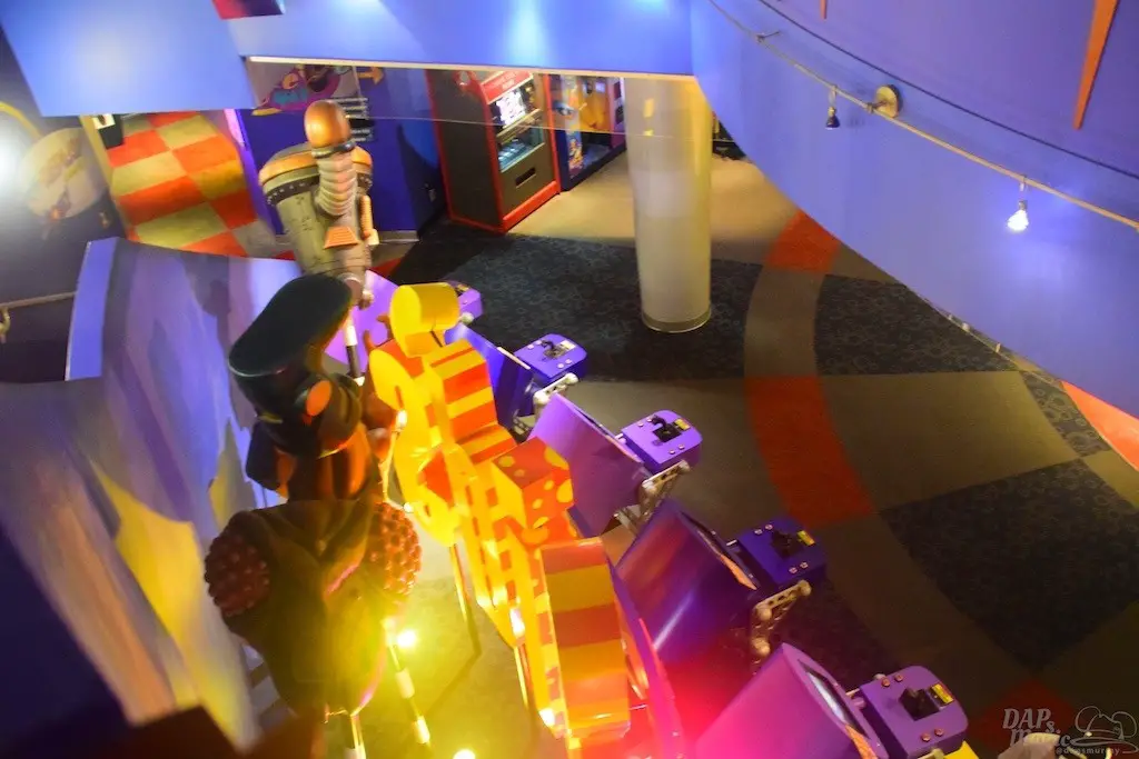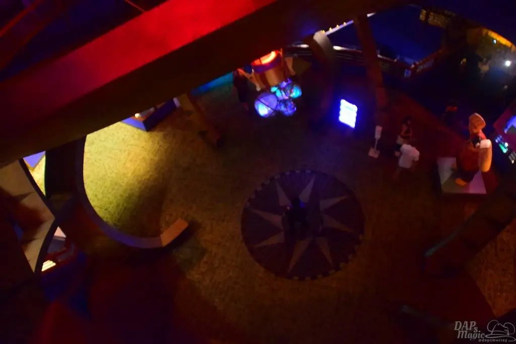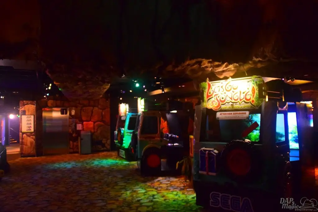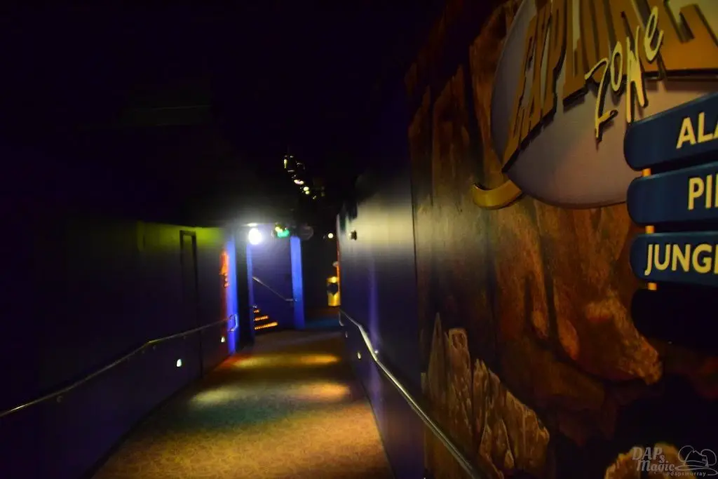The Explore Zone had virtual adventures. Aladdin’s Magic Carpets was a virtual reality scavenger hunt. Treasure of the Incas incorporated kiosks with video screens and driving controls, while under the floor was a temple maze with miniature cars equipped with cameras were controlled by the kiosks. Effects were synced to treasures found in the maze, and guests had a certain amount of time to find as many treasures as possible.