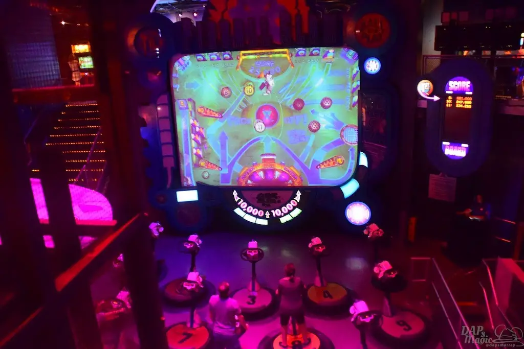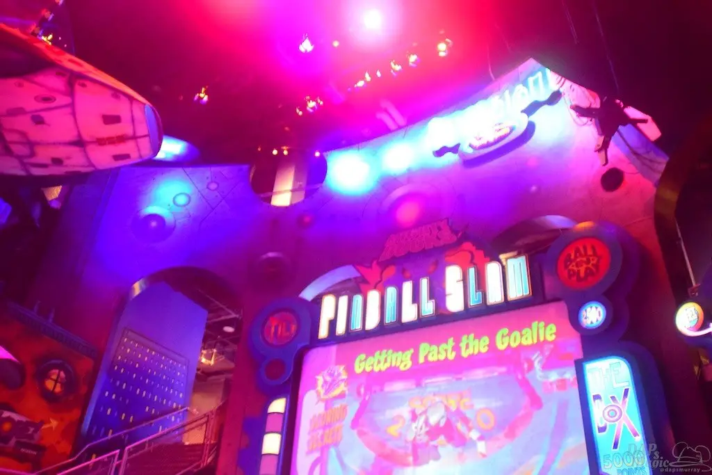 The Score Zone featured big games with fun stories. Mighty Ducks Pinball Slam used characters from the television cartoon and once owned hockey team. A giant screen let not just the players see what was happening but anyone passing by too! Players stood on platforms that moved from side to side with them. It was how the pucks on the screen were controlled. They players had to try to get past various obstacles as they competed for the high score.