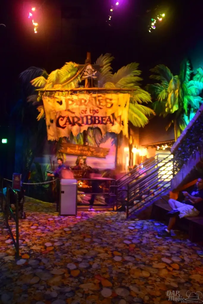 Pirates of the Caribbean: Battle for Buccaneer Gold replaced the Hercules attraction. The room kept the 3D projection screens, but the floor emulated a ship hull and several virtual cannons were around the rails. Guests could move about the room shooting off the cannons to sink ships and gain treasure. They had to fight the Buccaneer – a skeleton fashioned after the one that welcomes you before the waterfalls in Disneyland and Walt Disney World.