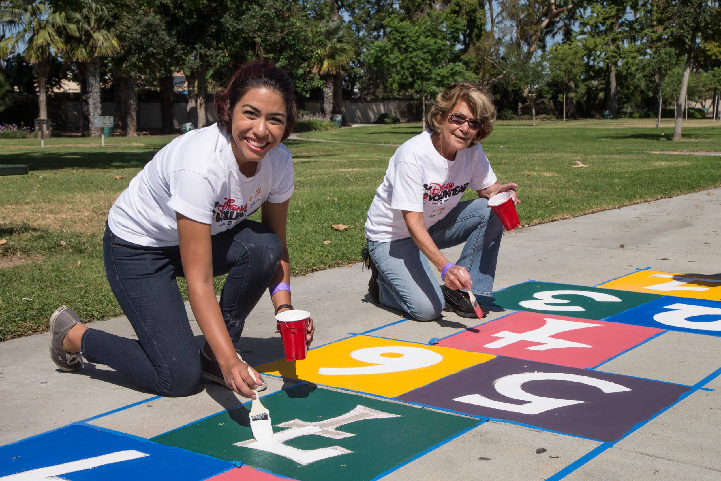 DISNEY VOLUNTEARS HELP BUILD PLAYGROUND IN ANAHEIM – Disney Ambassador Alexa Garcia, left, and Disney Alumni Maryann Meirowsky paint a new hop scotch court at Willow Park in Anaheim in Saturday, September 23, 2017. The park was transformed into a kid-designed play space in less than eight hours with the help of close to 300 volunteers from the City of Anaheim, Anaheim Family YMCA, Disney, Disney alumni, area residents and organizers from KaBOOM!. With this new addition to the neighborhood, 400 kids now have more opportunities to get the balanced and active play they need to thrive. Willow Park marks the ninth Disney-sponsored KaBOOM! playground in the city of Anaheim. (Joshua Sudock/Disney Parks)