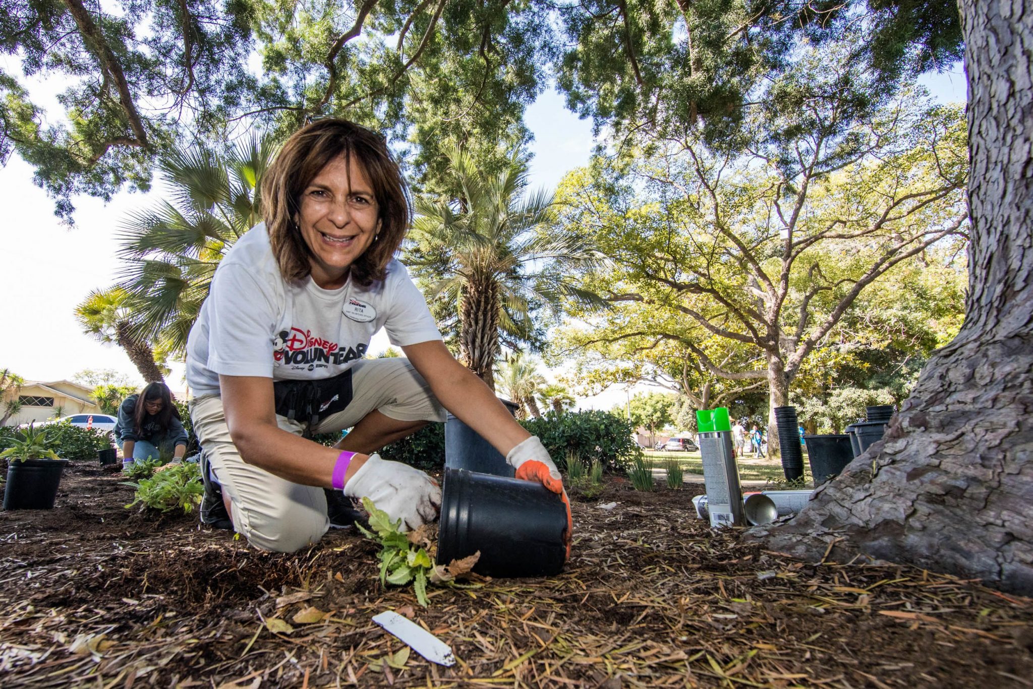 DISNEY VOLUNTEARS HELP BUILD PLAYGROUND IN ANAHEIM – Rita Burns, President Disney VoluntEARS Leadership Council, installs new plants at Willow Park in Anaheim on Saturday, September 23, 2017. The park was transformed into a kid-designed play space in less than eight hours with the help of close to 300 volunteers from the City of Anaheim, Anaheim Family YMCA, Disney, Disney alumni, area residents and organizers from KaBOOM!. With this new addition to the neighborhood, 400 kids now have more opportunities to get the balanced and active play they need to thrive. Willow Park marks the ninth Disney-sponsored KaBOOM! playground in the city of Anaheim. (Joshua Sudock/Disney Parks)