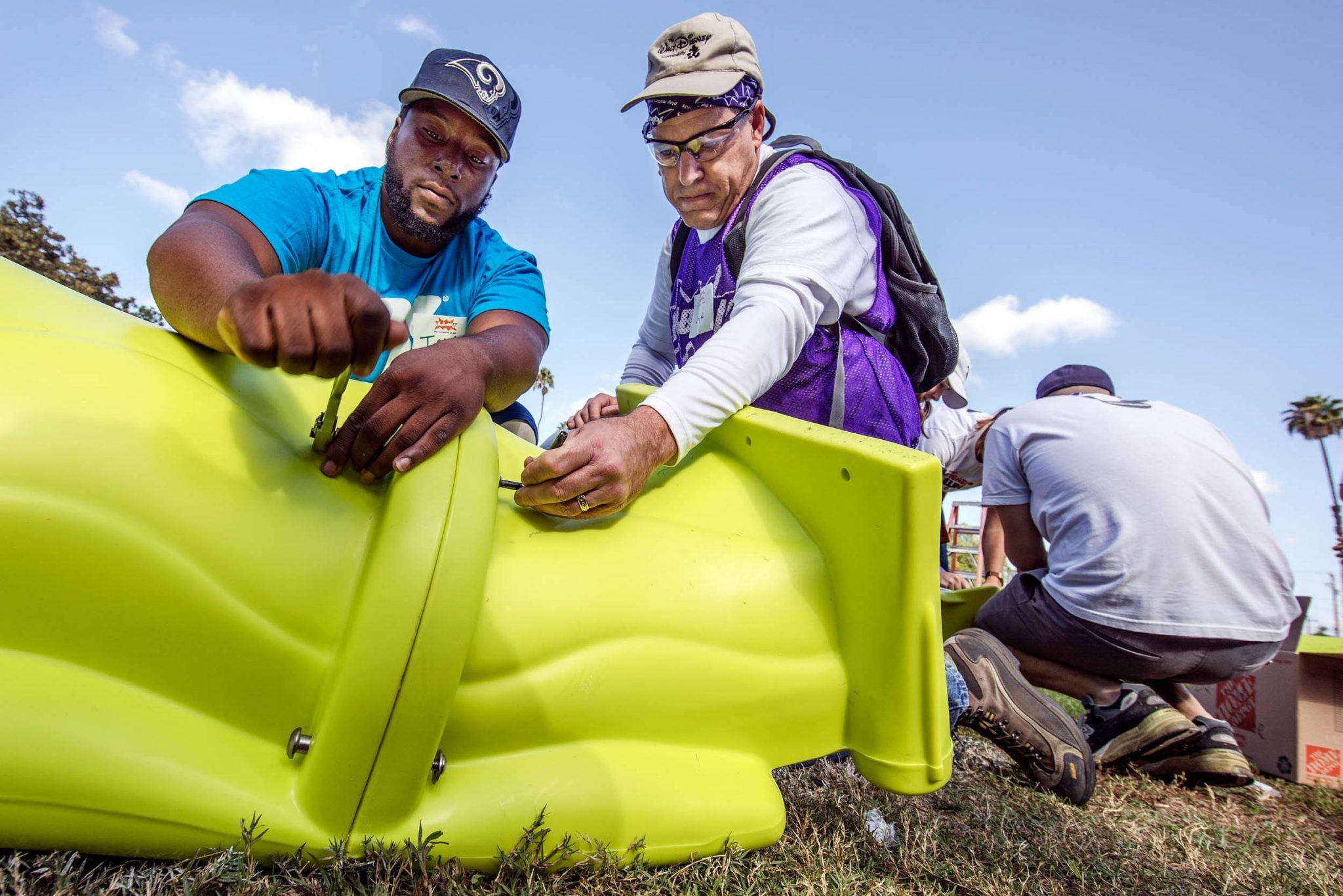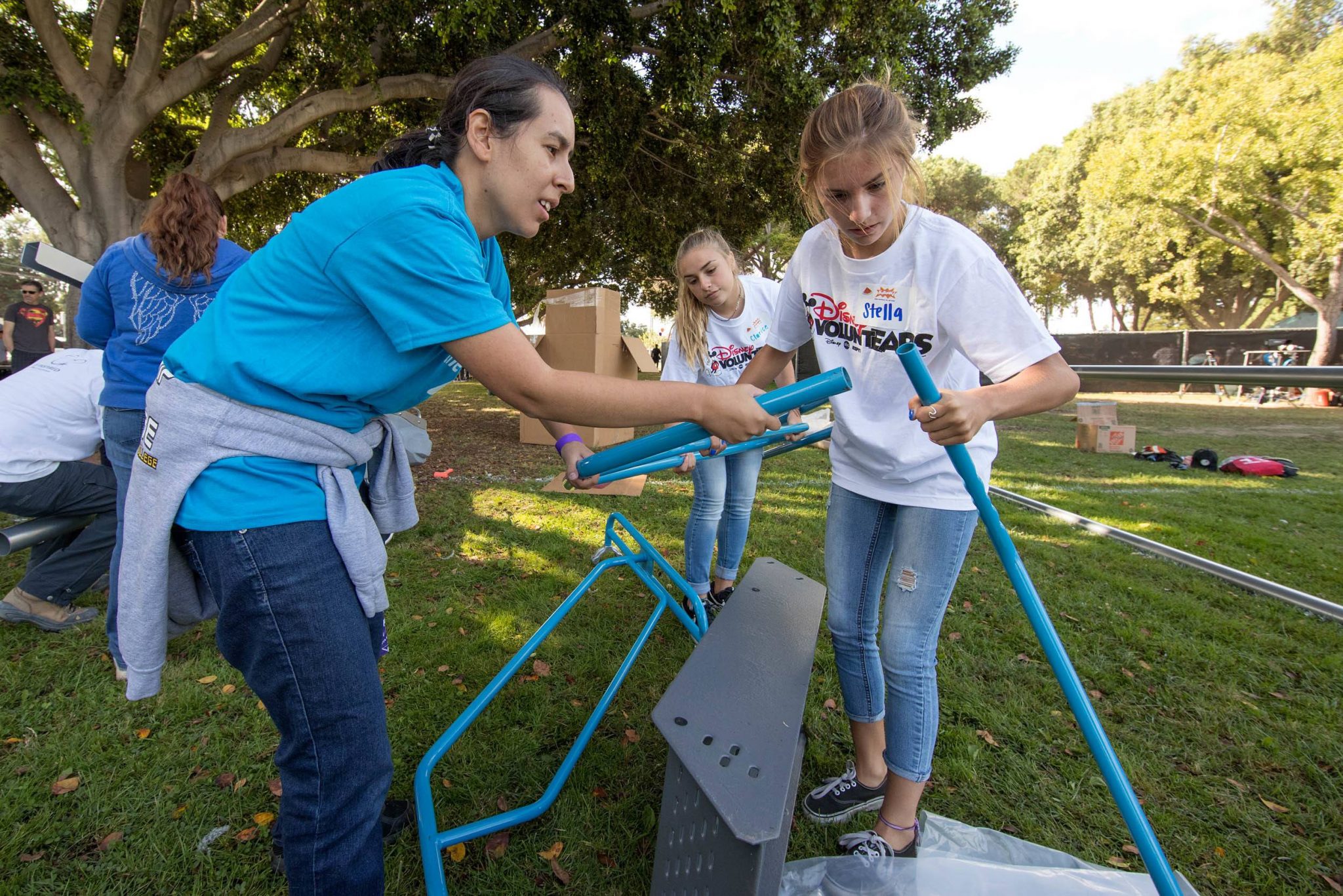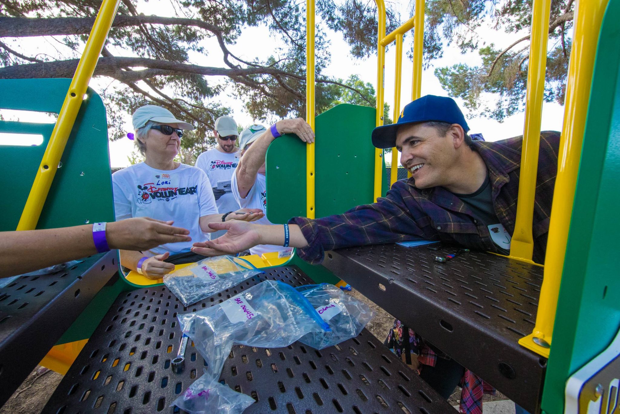 DISNEY VOLUNTEARS HELP BUILD PLAYGROUND IN ANAHEIM – Anaheim City Council Member Jose F. Moreno assists Disneyland Resort VoluntEARS with the construction of a new KaBOOM! playground at Willow Park in Anaheim on Saturday, September 23, 2017. The park was transformed into a kid-designed play space in less than eight hours with the help of close to 300 volunteers from the City of Anaheim, Anaheim Family YMCA, Disney, Disney alumni, area residents and organizers from KaBOOM!. With this new addition to the neighborhood, 400 kids now have more opportunities to get the balanced and active play they need to thrive. Willow Park marks the ninth Disney-sponsored KaBOOM! playground in the city of Anaheim. (Joshua Sudock/Disney Parks)