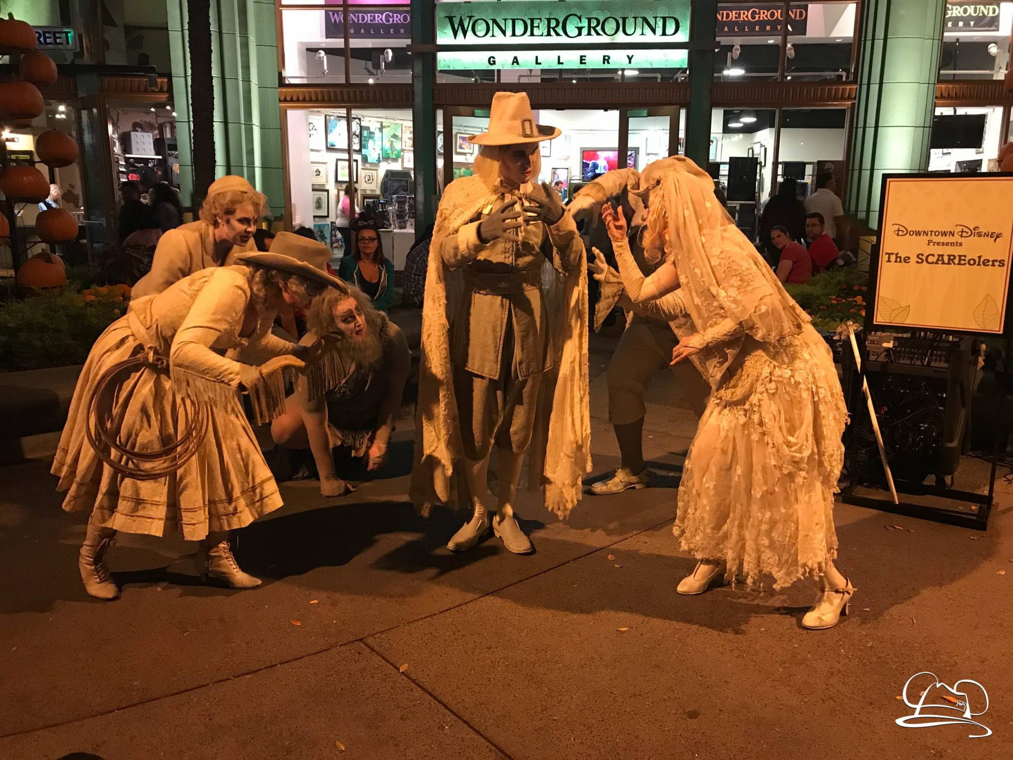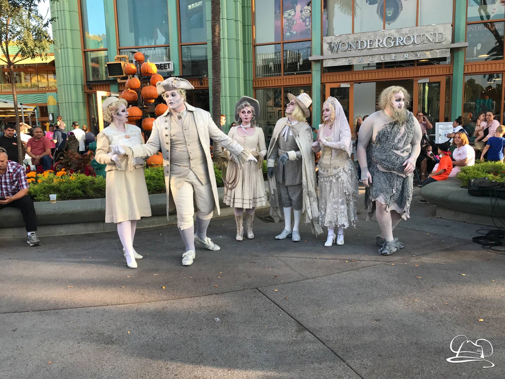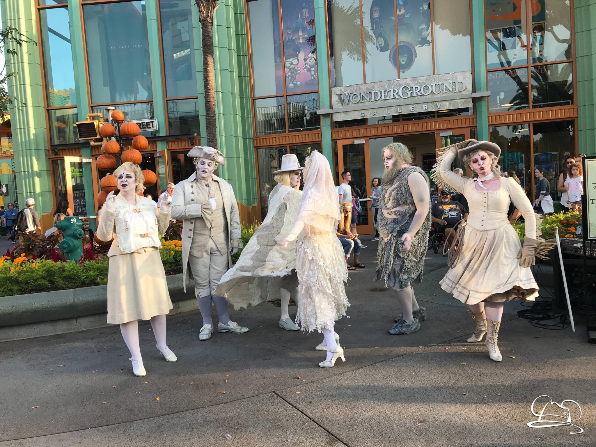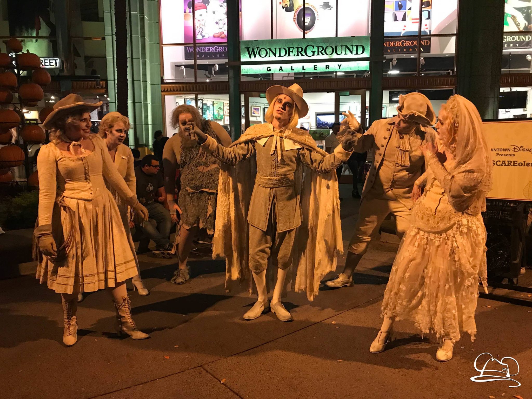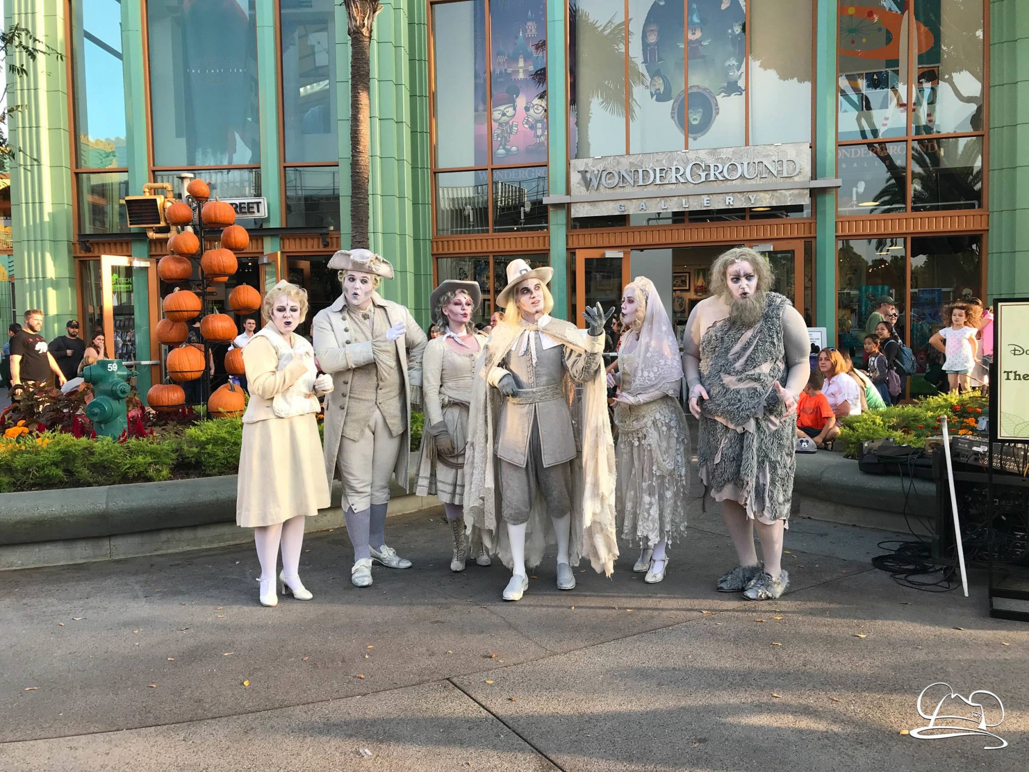 There are many different exciting things to experience at the Disneyland Resort during Halloween Time. Both in the parks and also in Downtown Disney there is Halloween magic to be found. In Downtown Disney there a lot of different musical experiences to find. The SCAREolers embody (or should I say disembody) Halloween more than any of the others. This ghostly ensemble sings the night away in Downtown Disney in front of the WonderGround Gallery.