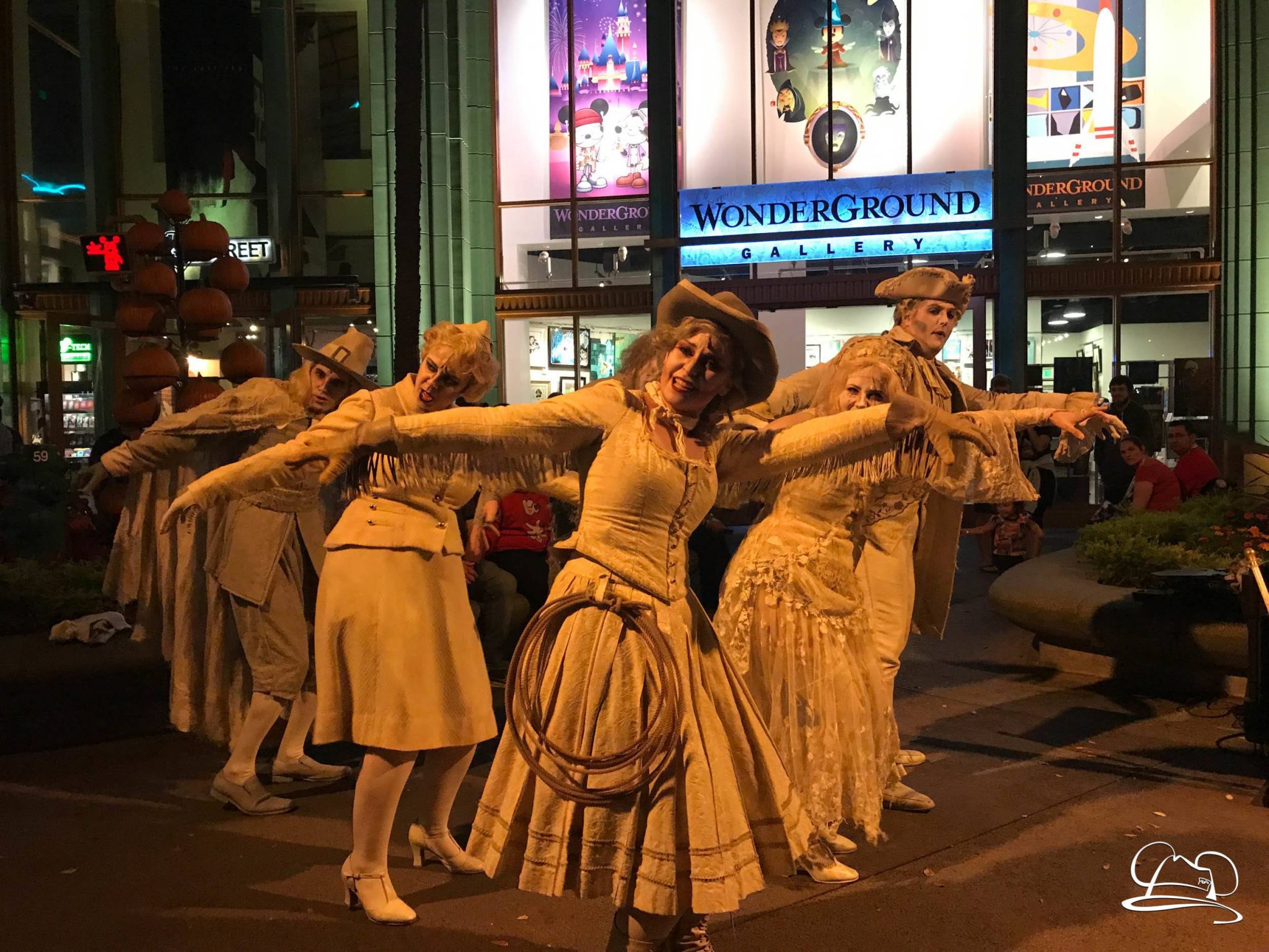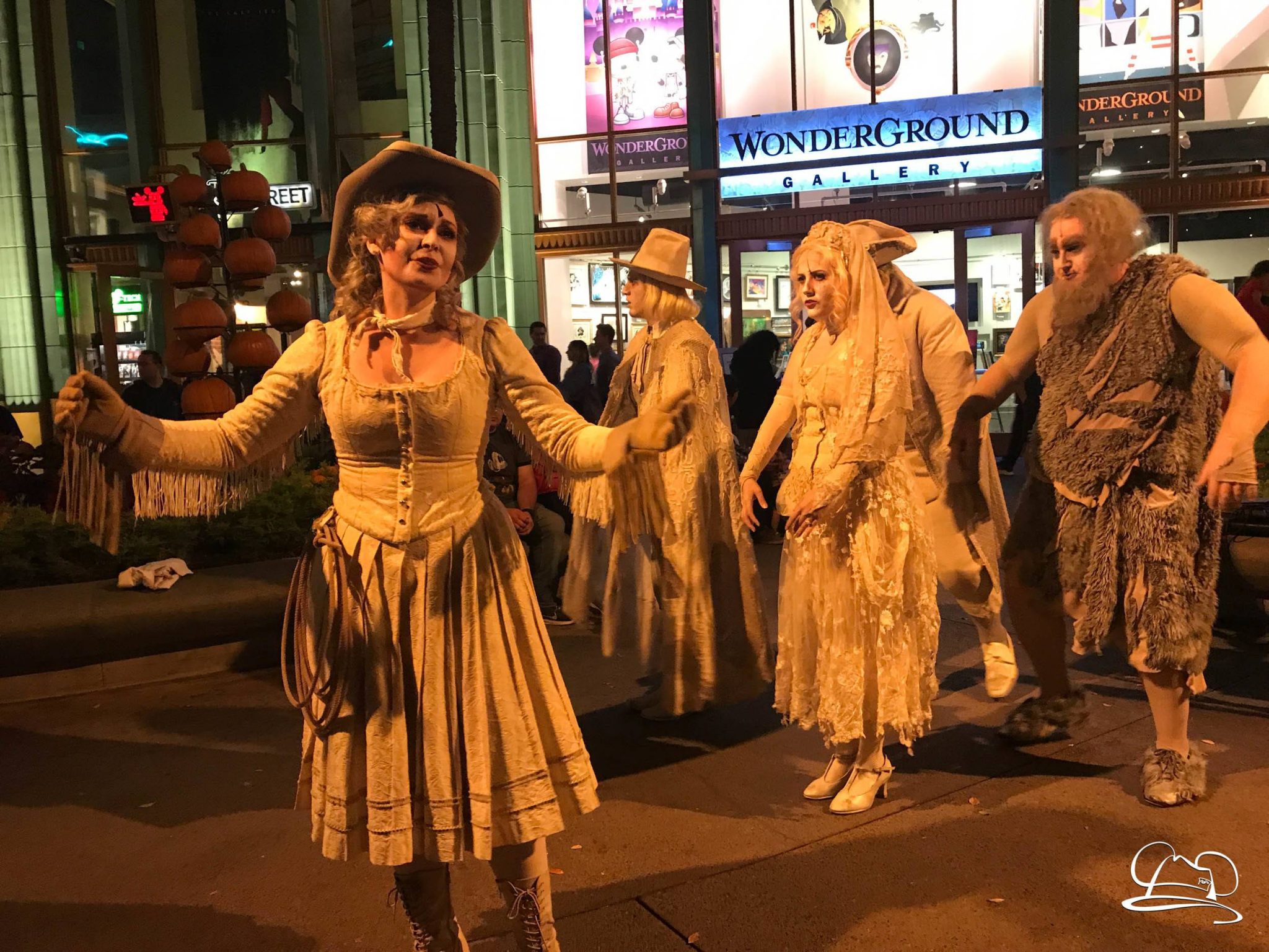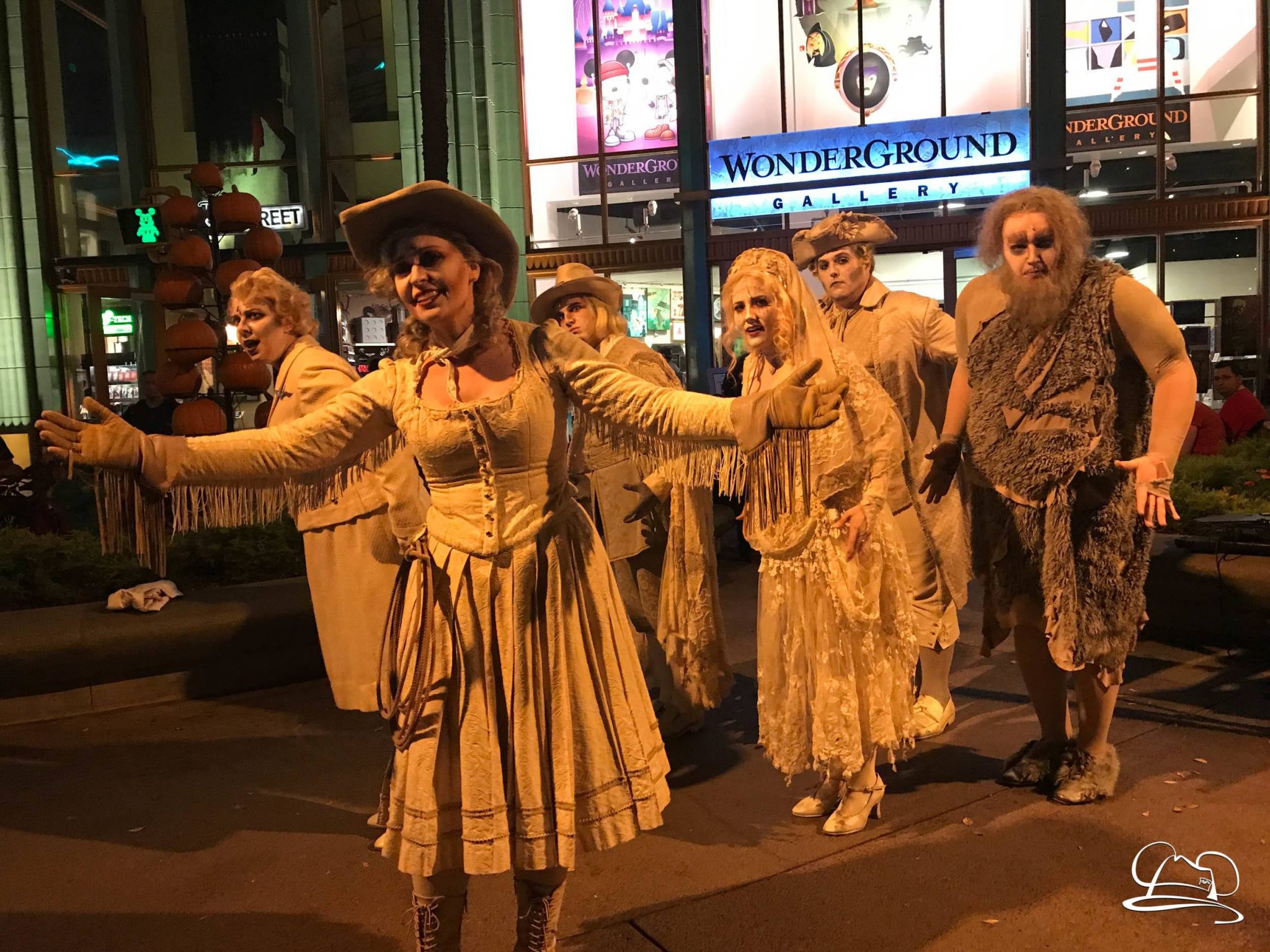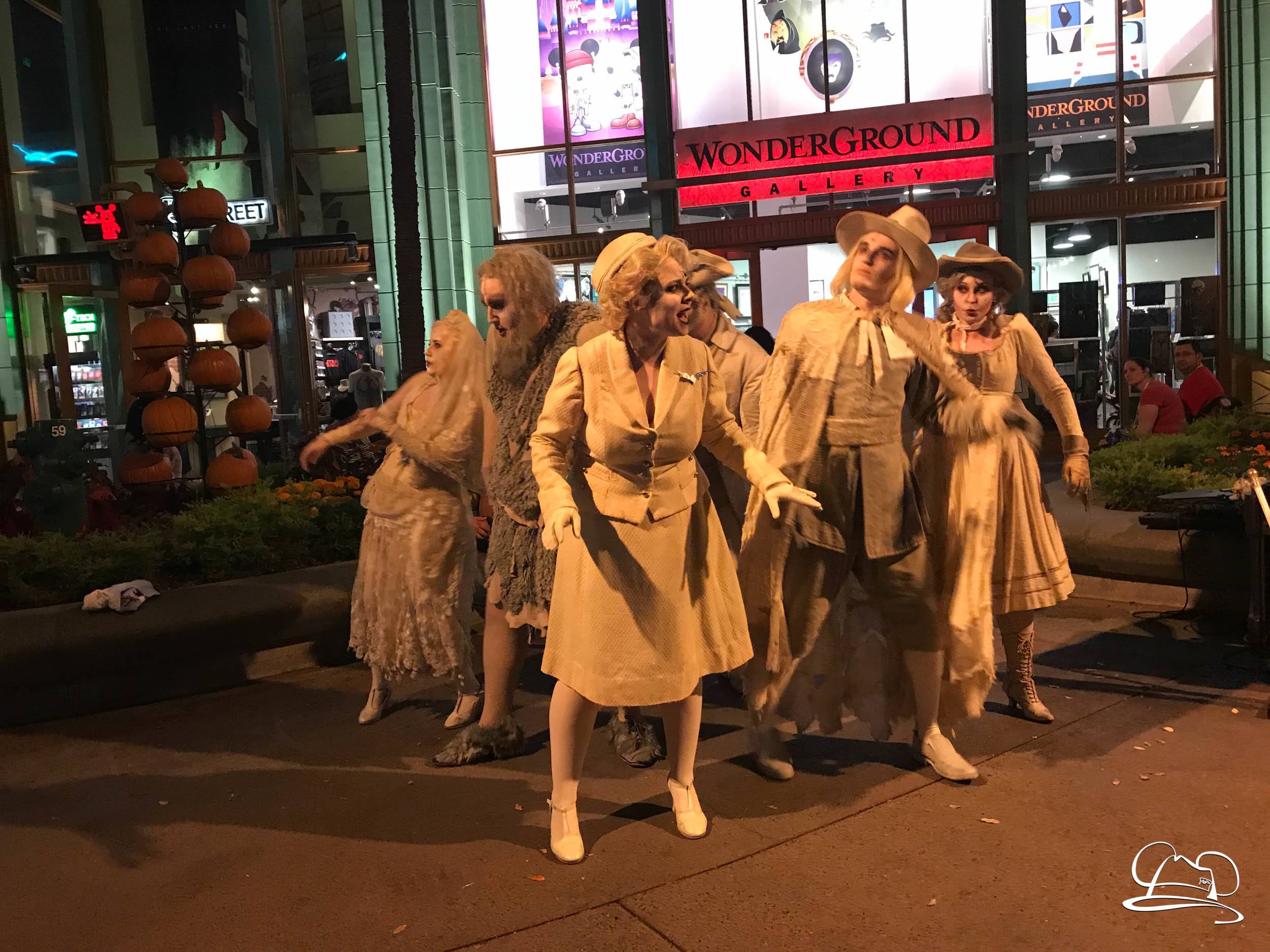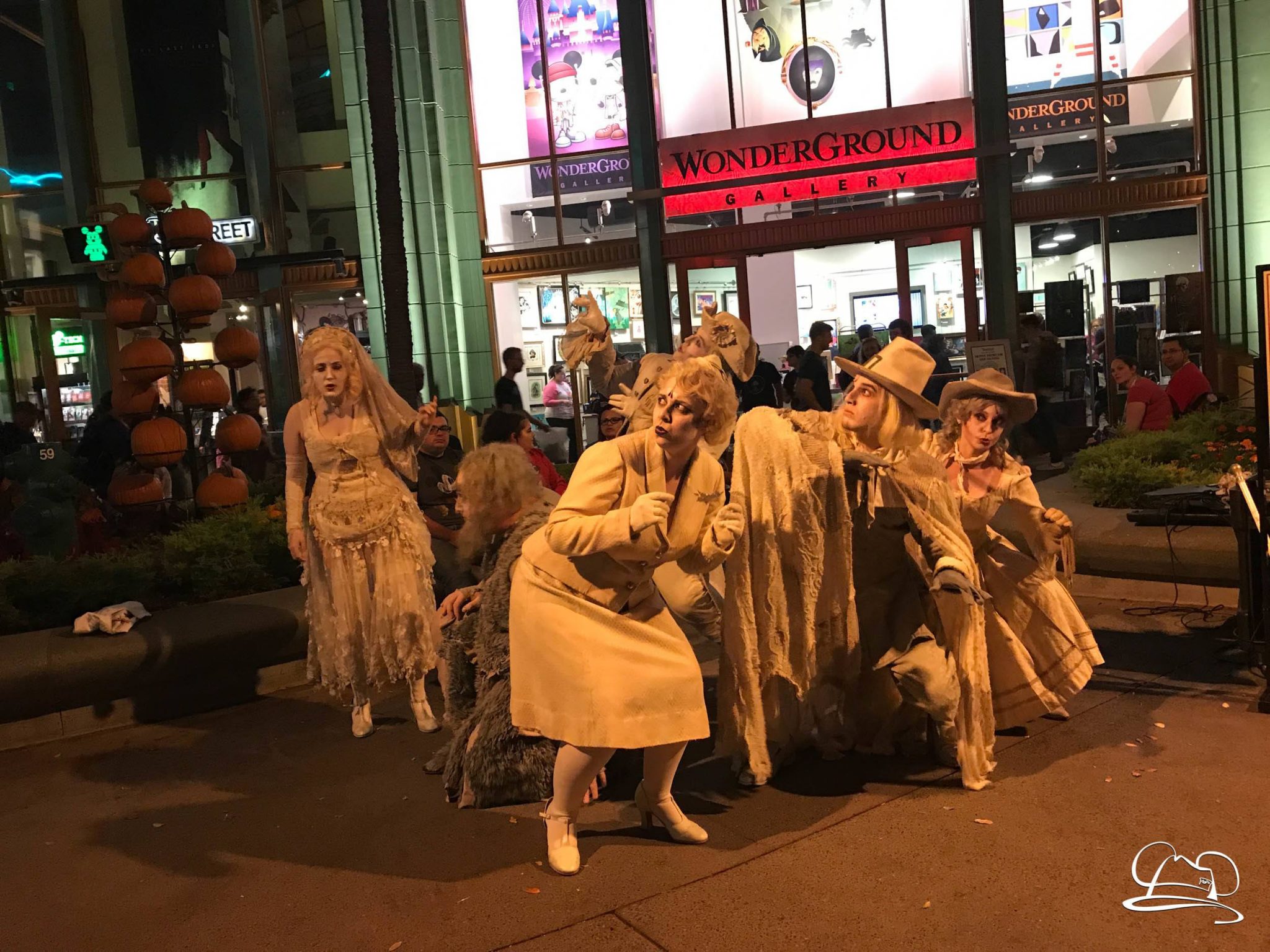 There are many different exciting things to experience at the Disneyland Resort during Halloween Time. Both in the parks and also in Downtown Disney there is Halloween magic to be found. In Downtown Disney there a lot of different musical experiences to find. The SCAREolers embody (or should I say disembody) Halloween more than any of the others. This ghostly ensemble sings the night away in Downtown Disney in front of the WonderGround Gallery.