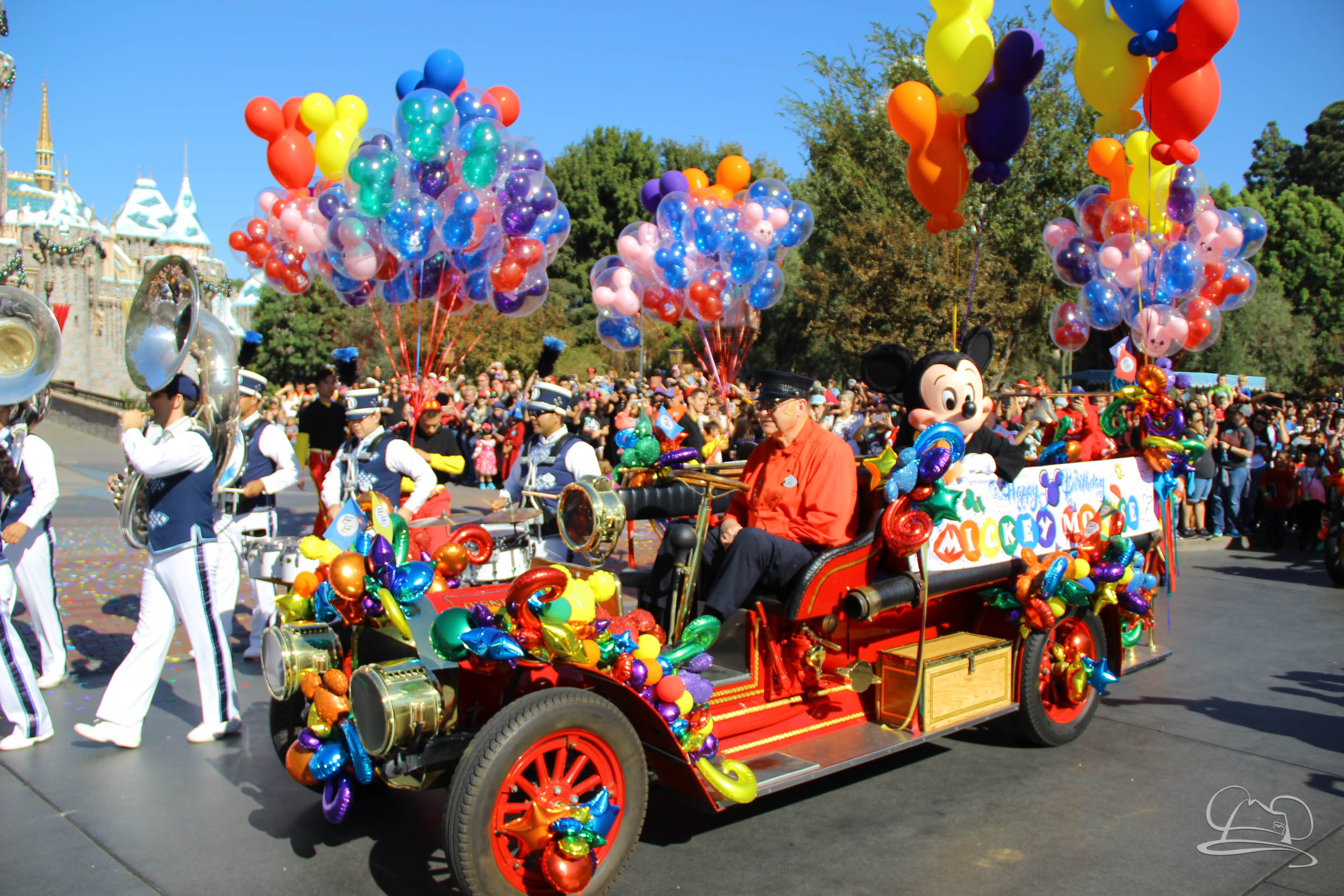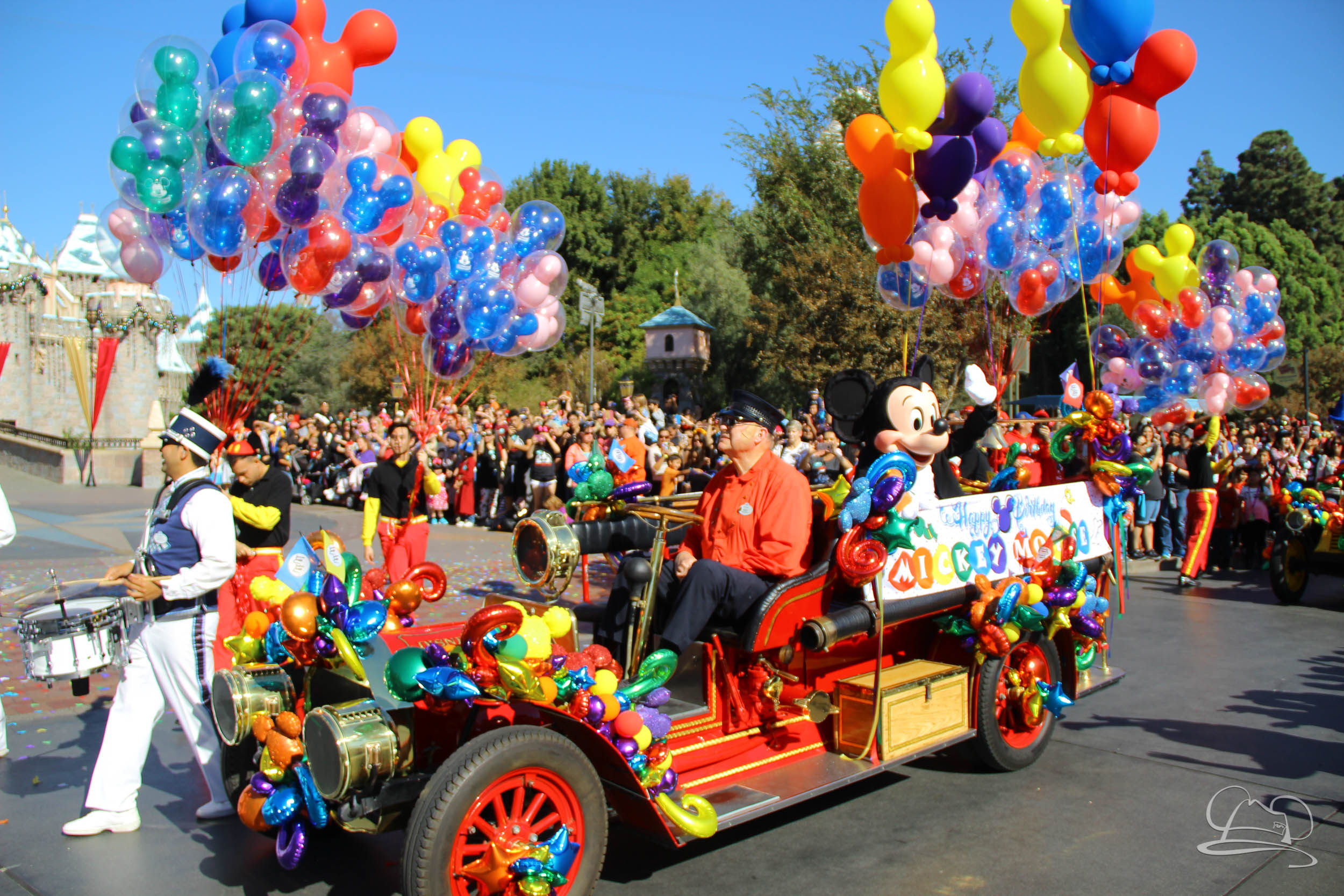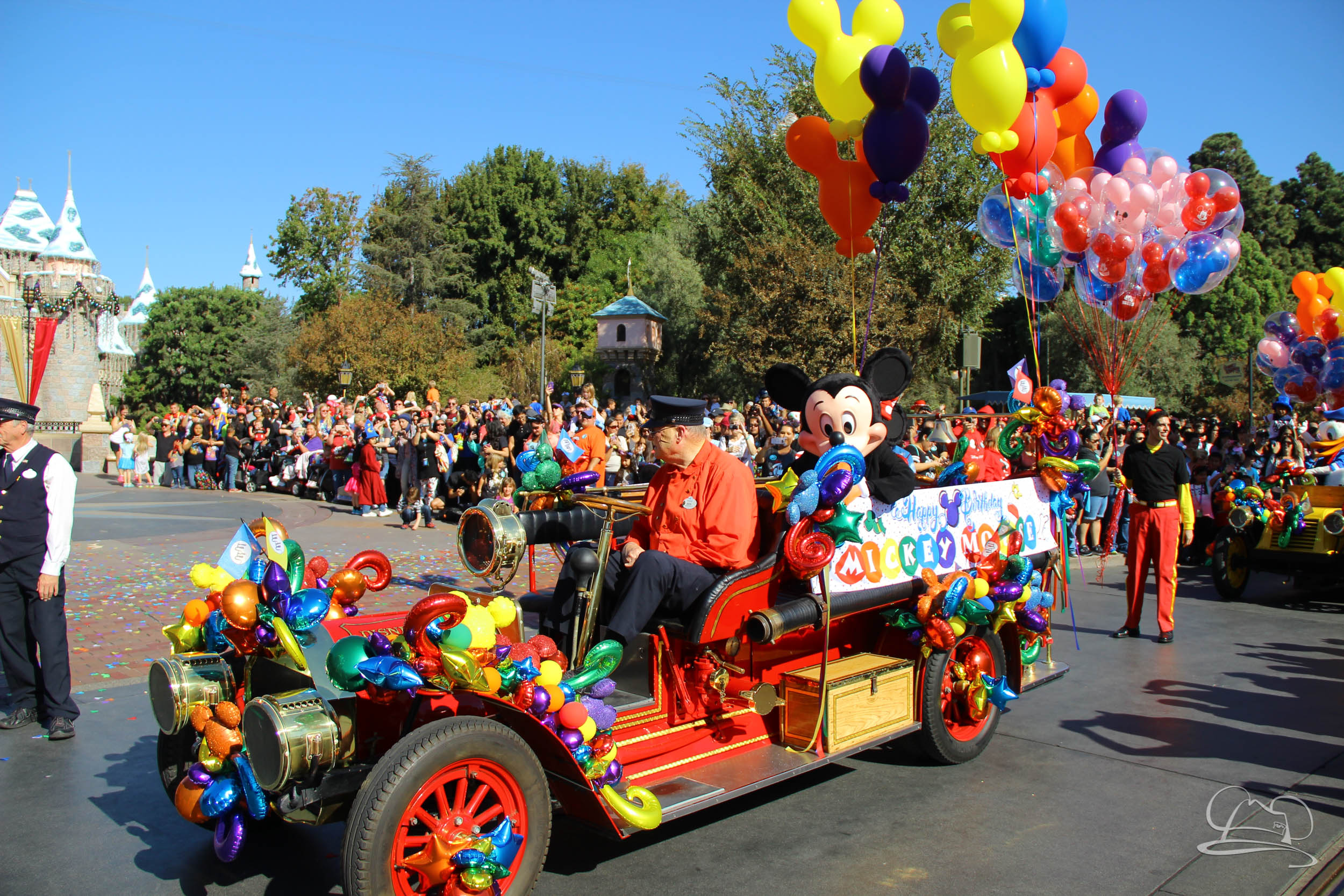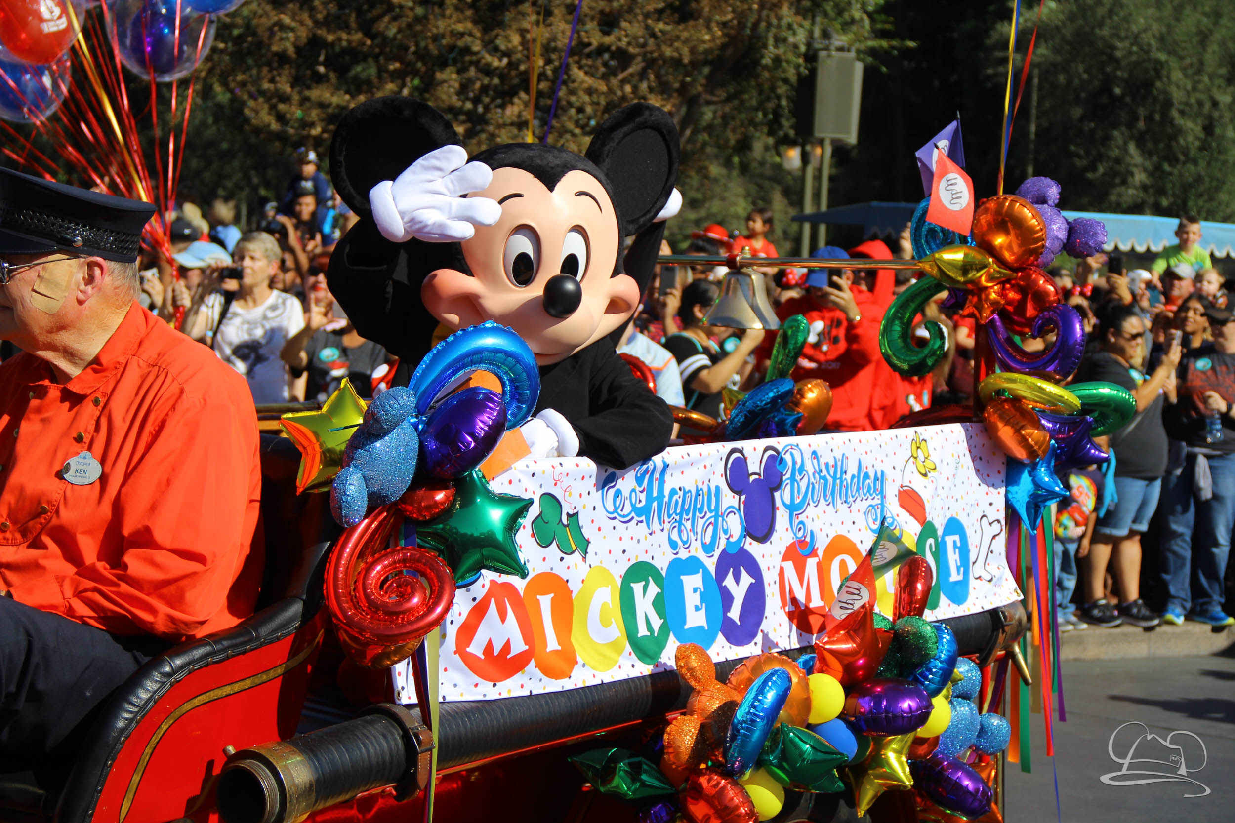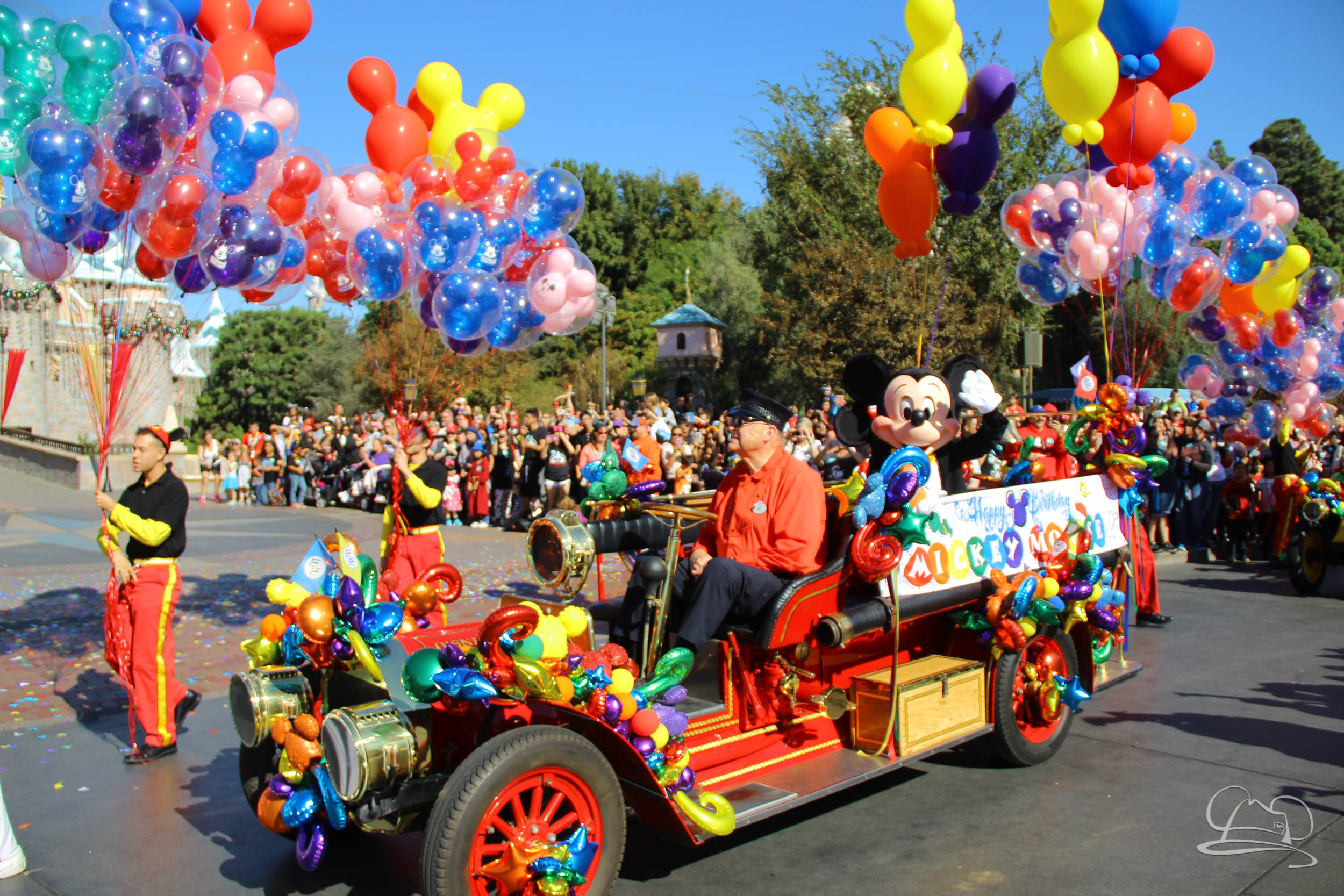 The celebration began with buttons that were given to guests as they entered the turnstiles at Disneyland and Disney California Adventure. In the Emporium at Disneyland and also in the World of Disney in Downtown Disney, merchandise commemorating the day could be found. The big event though was the surprise birthday celebration for Mickey Mouse along the parade route. A cavalcade, led by the Disneyland Band, made its way down the parade route before stopping in front of Sleeping Beauty Castle. This cavalcade also included Minnie Mouse (also her birthday), Pluto, Donald Duck, and Goofy in various Main Street vehicles. On the side of the firetruck a banner wished Mickey Mouse a happy birthday.