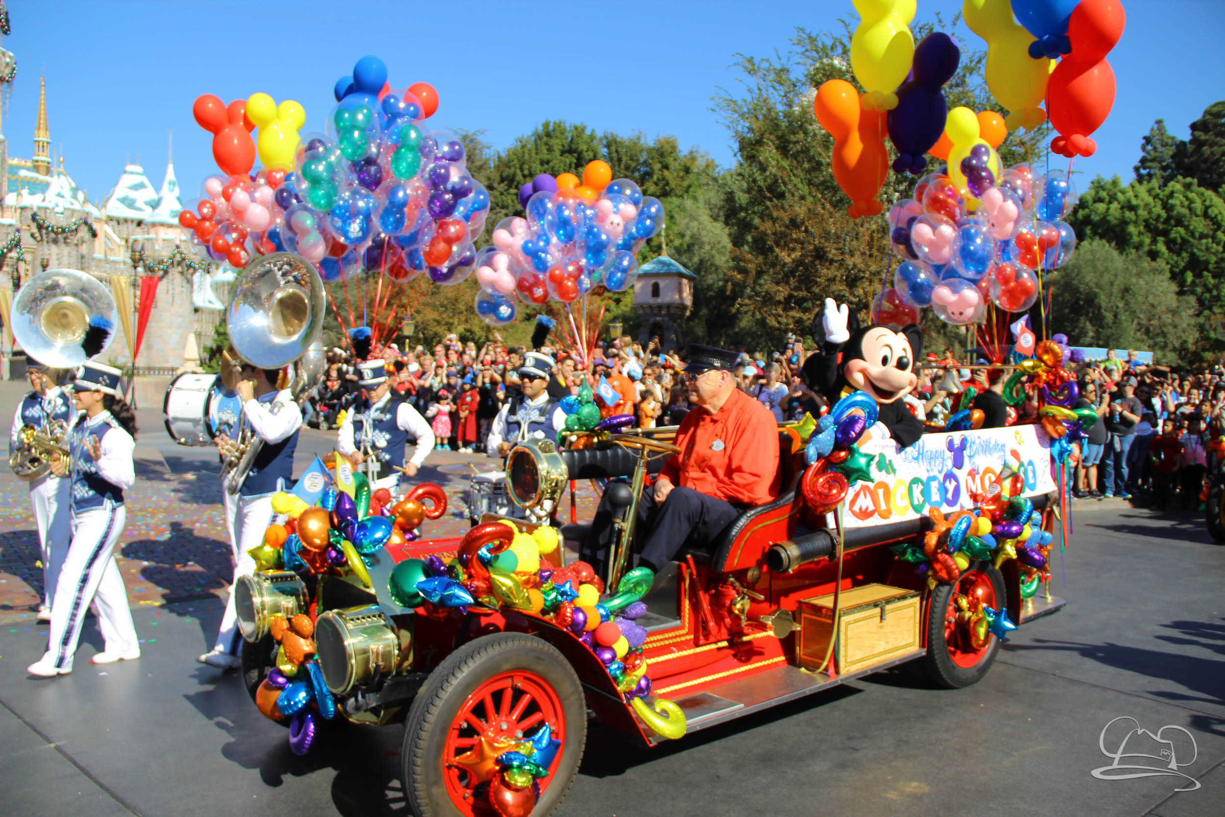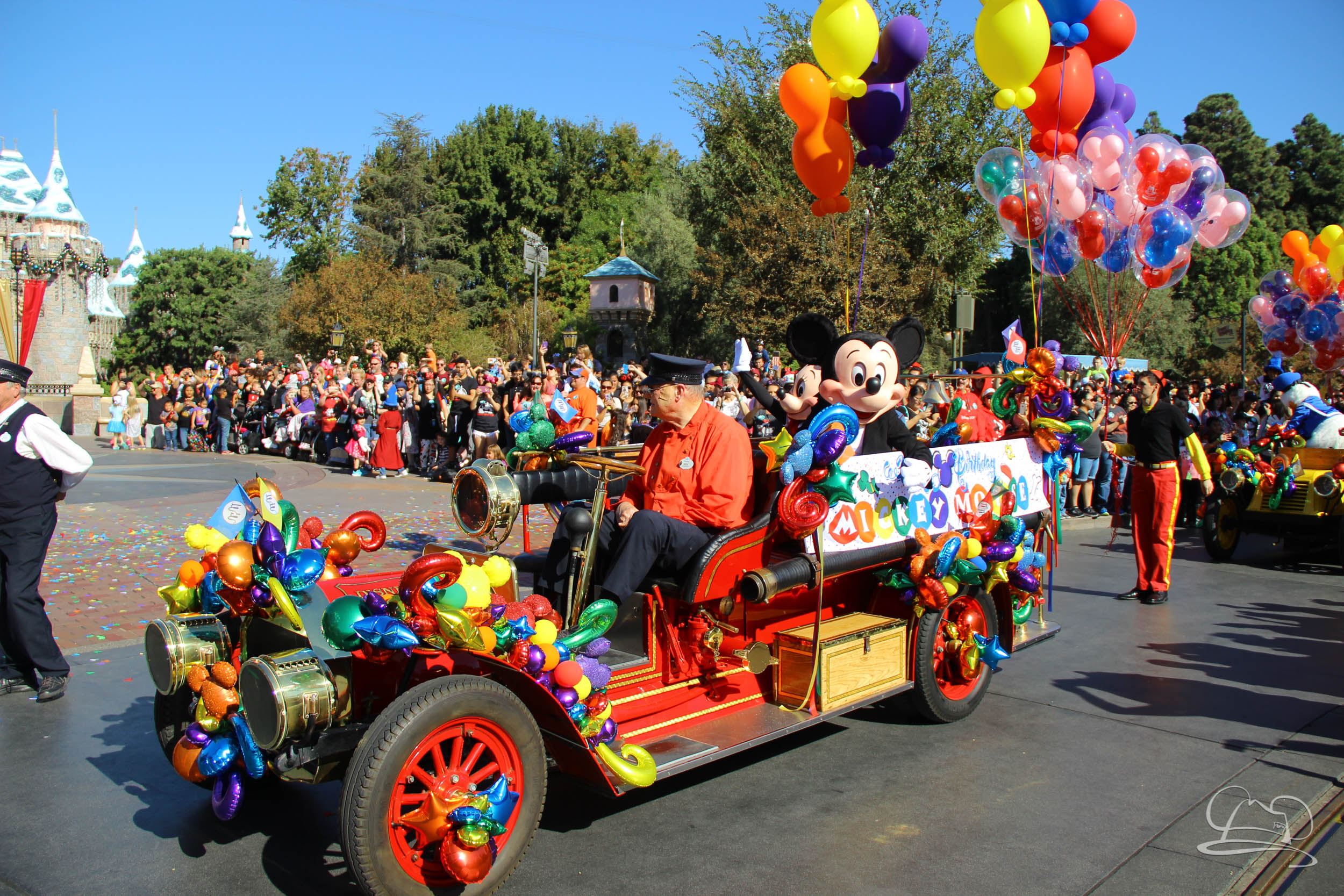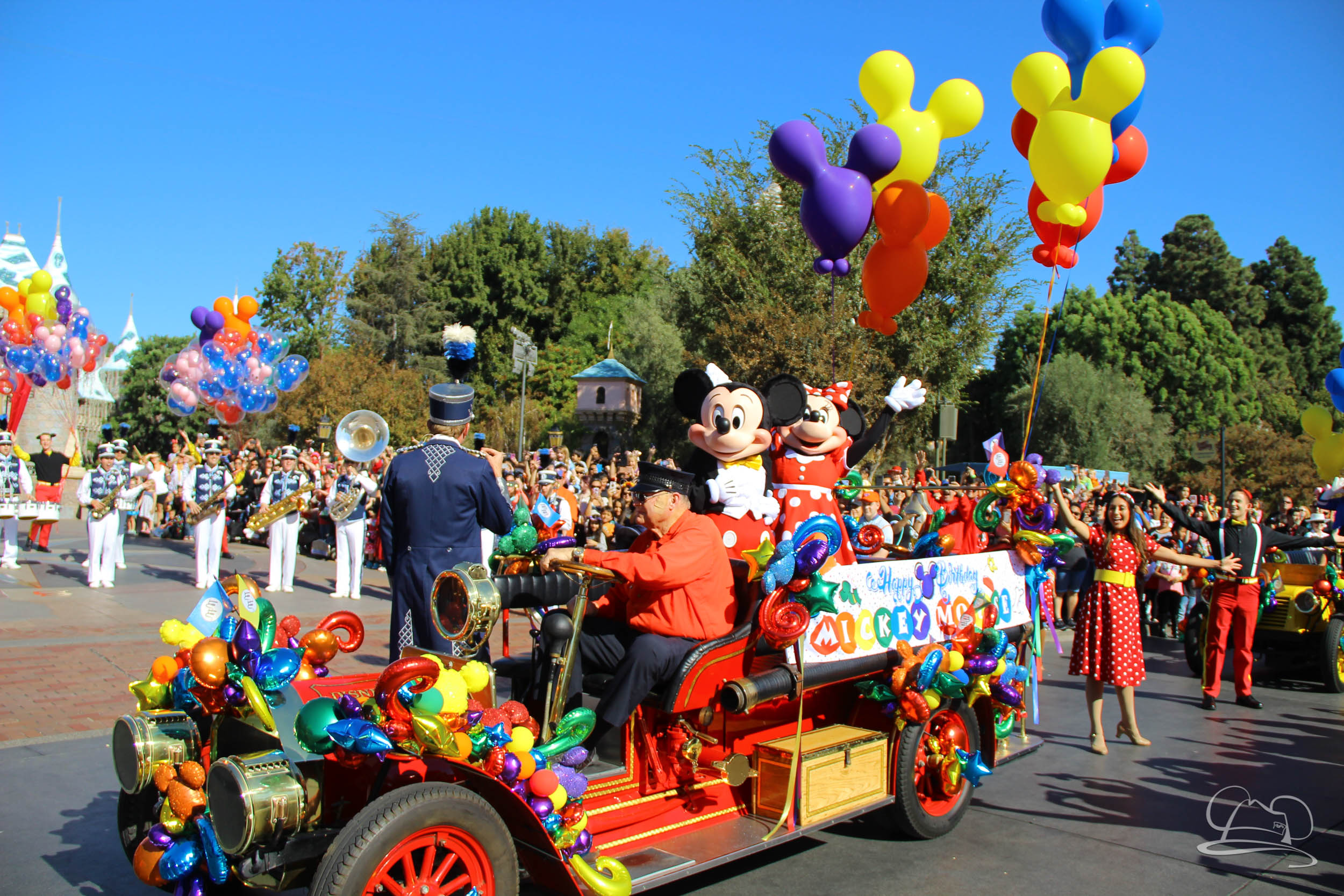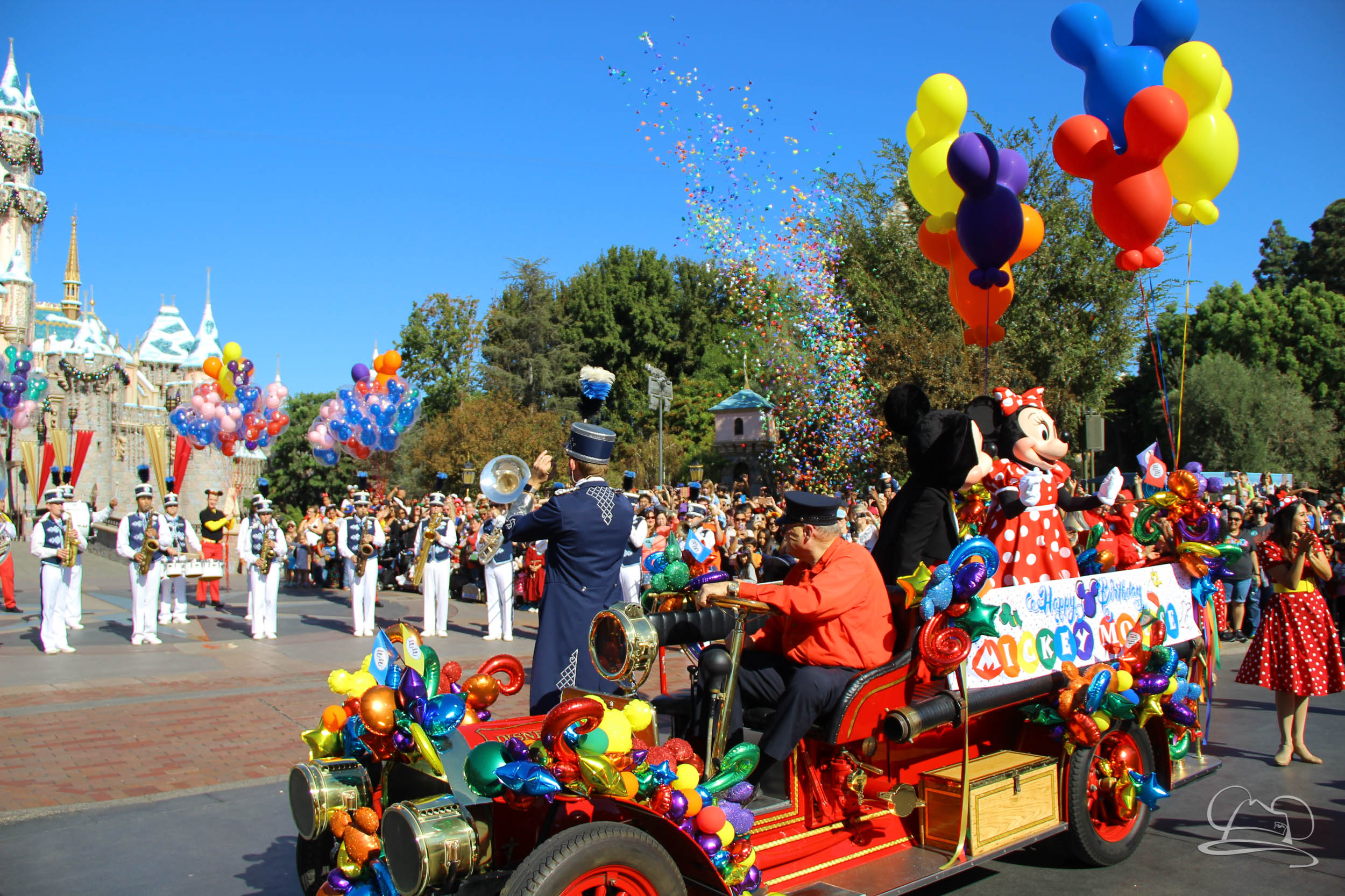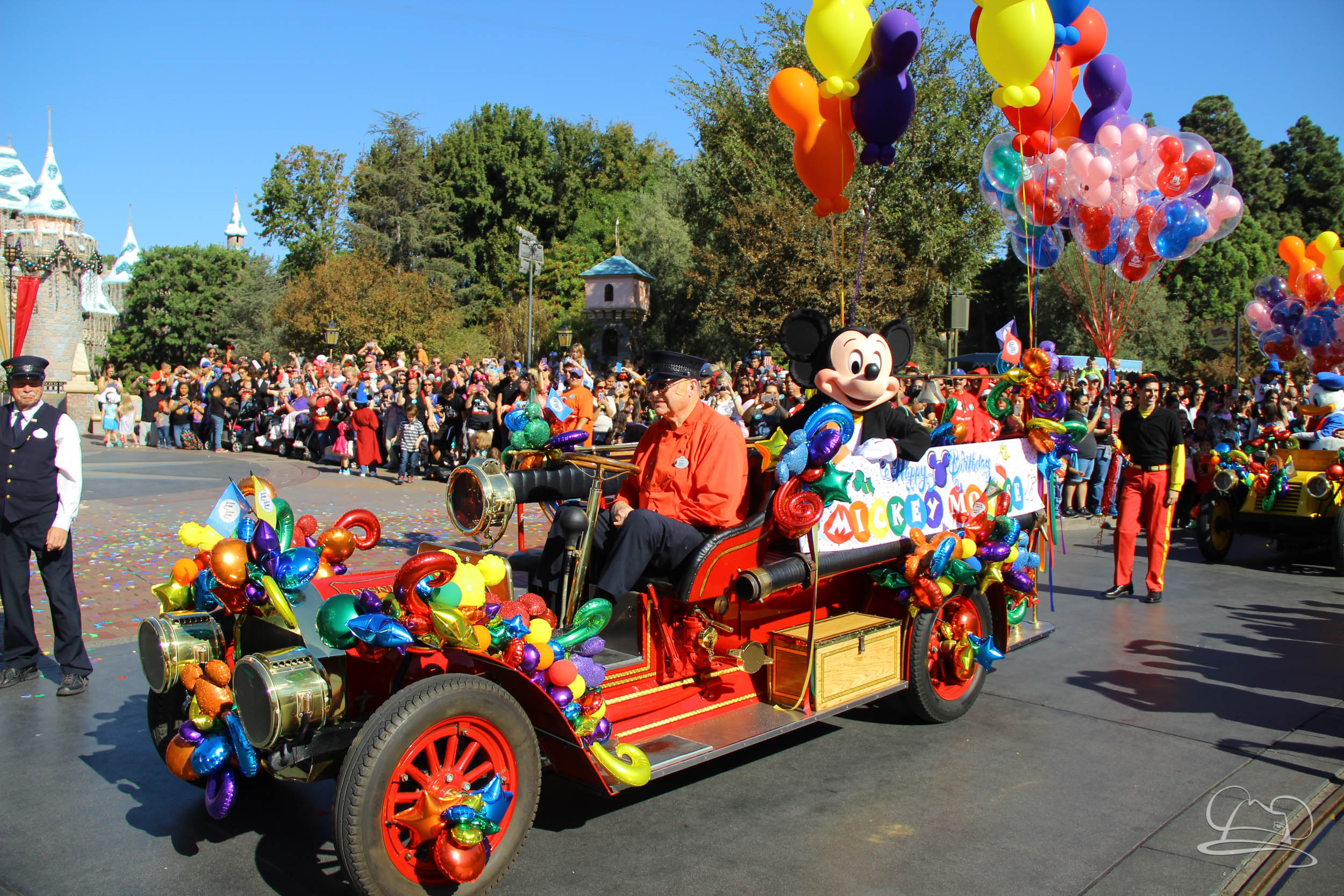 The celebration began with buttons that were given to guests as they entered the turnstiles at Disneyland and Disney California Adventure. In the Emporium at Disneyland and also in the World of Disney in Downtown Disney, merchandise commemorating the day could be found. The big event though was the surprise birthday celebration for Mickey Mouse along the parade route. A cavalcade, led by the Disneyland Band, made its way down the parade route before stopping in front of Sleeping Beauty Castle. This cavalcade also included Minnie Mouse (also her birthday), Pluto, Donald Duck, and Goofy in various Main Street vehicles. On the side of the firetruck a banner wished Mickey Mouse a happy birthday.
