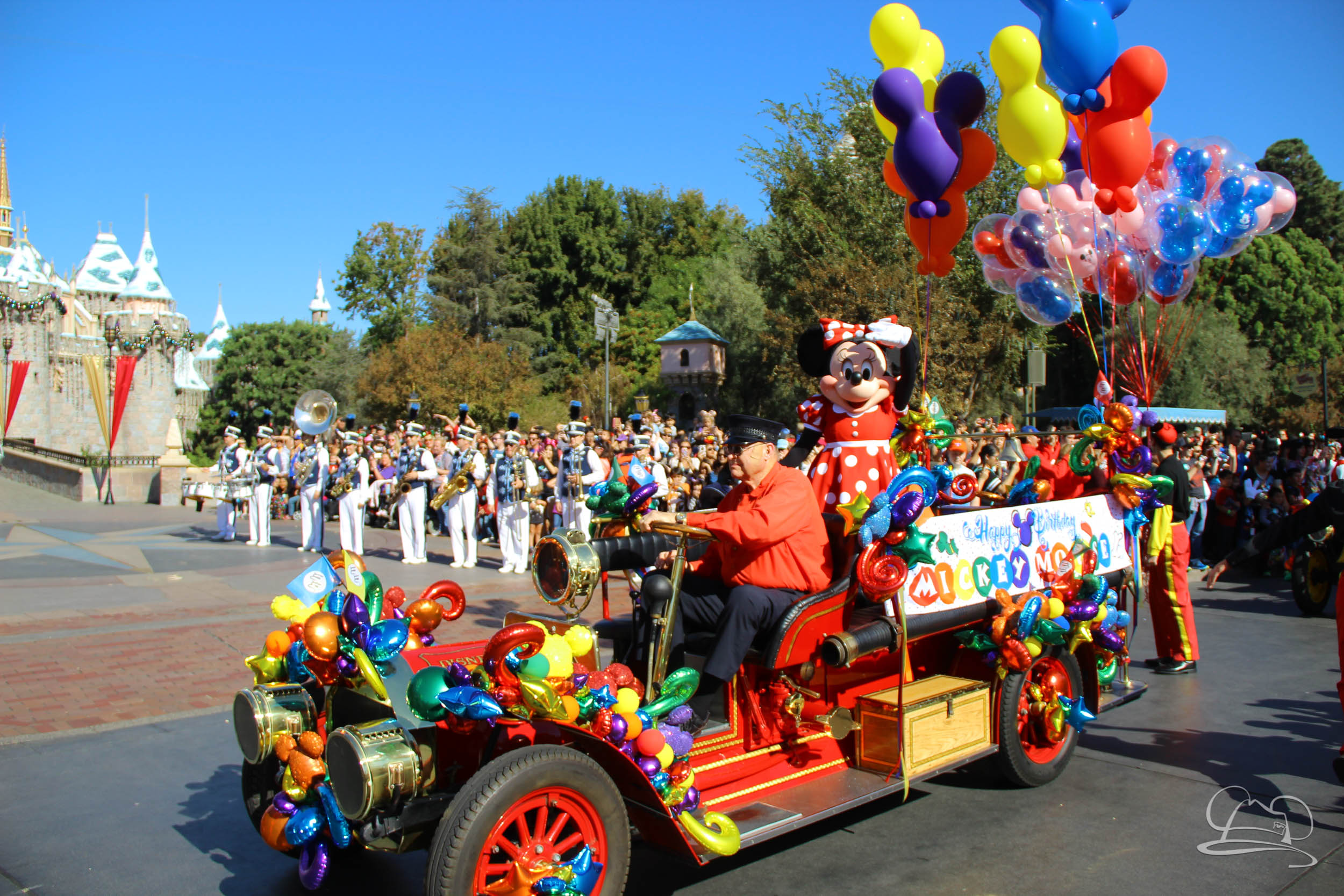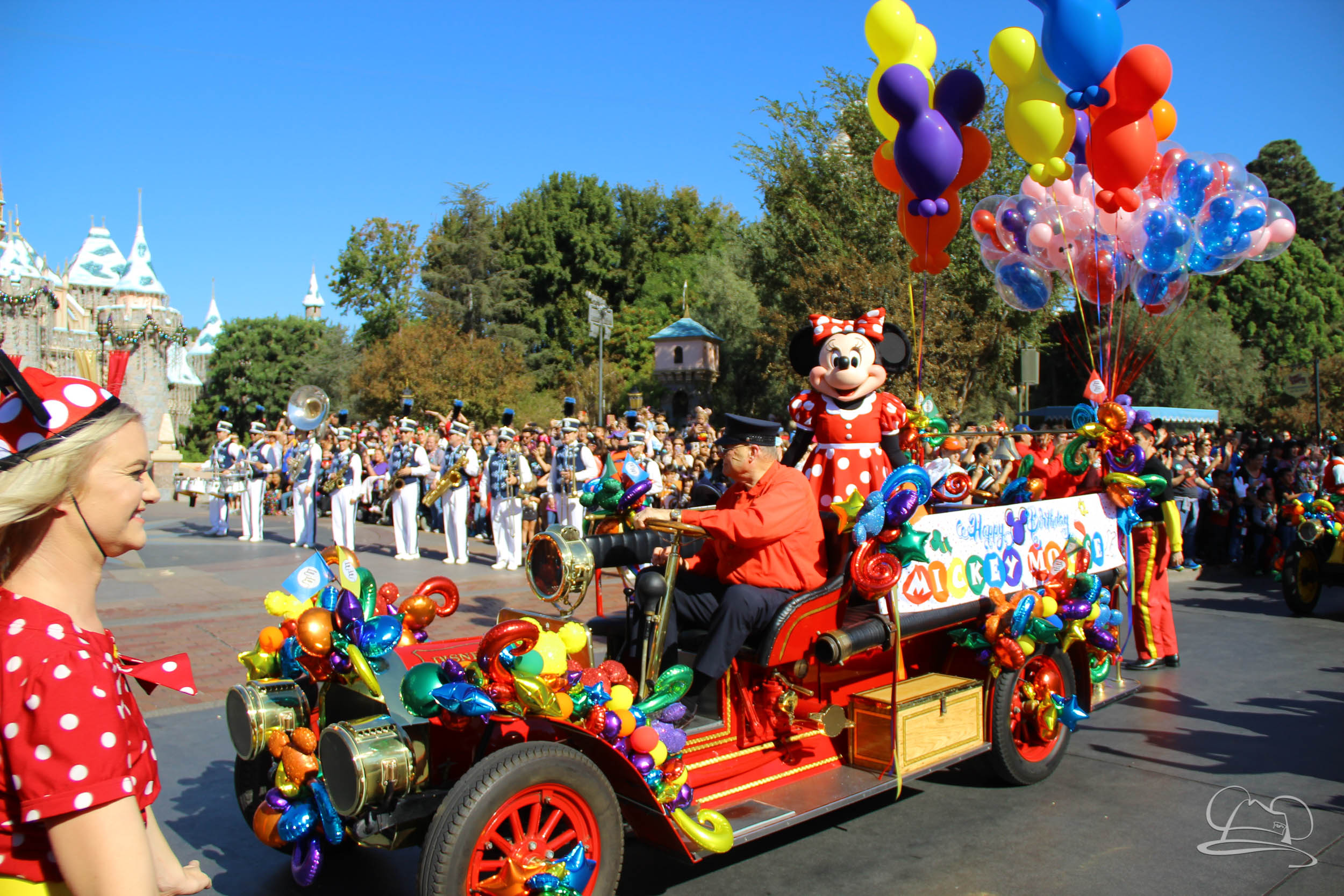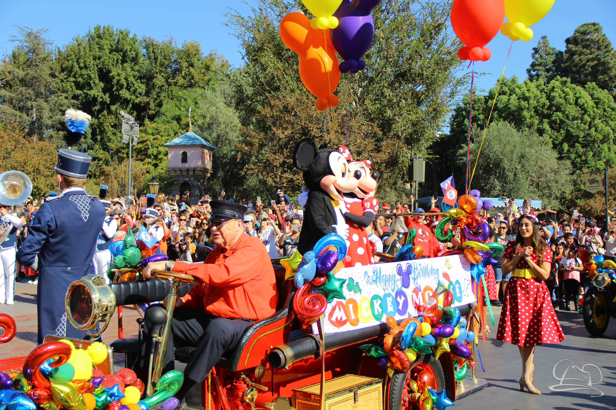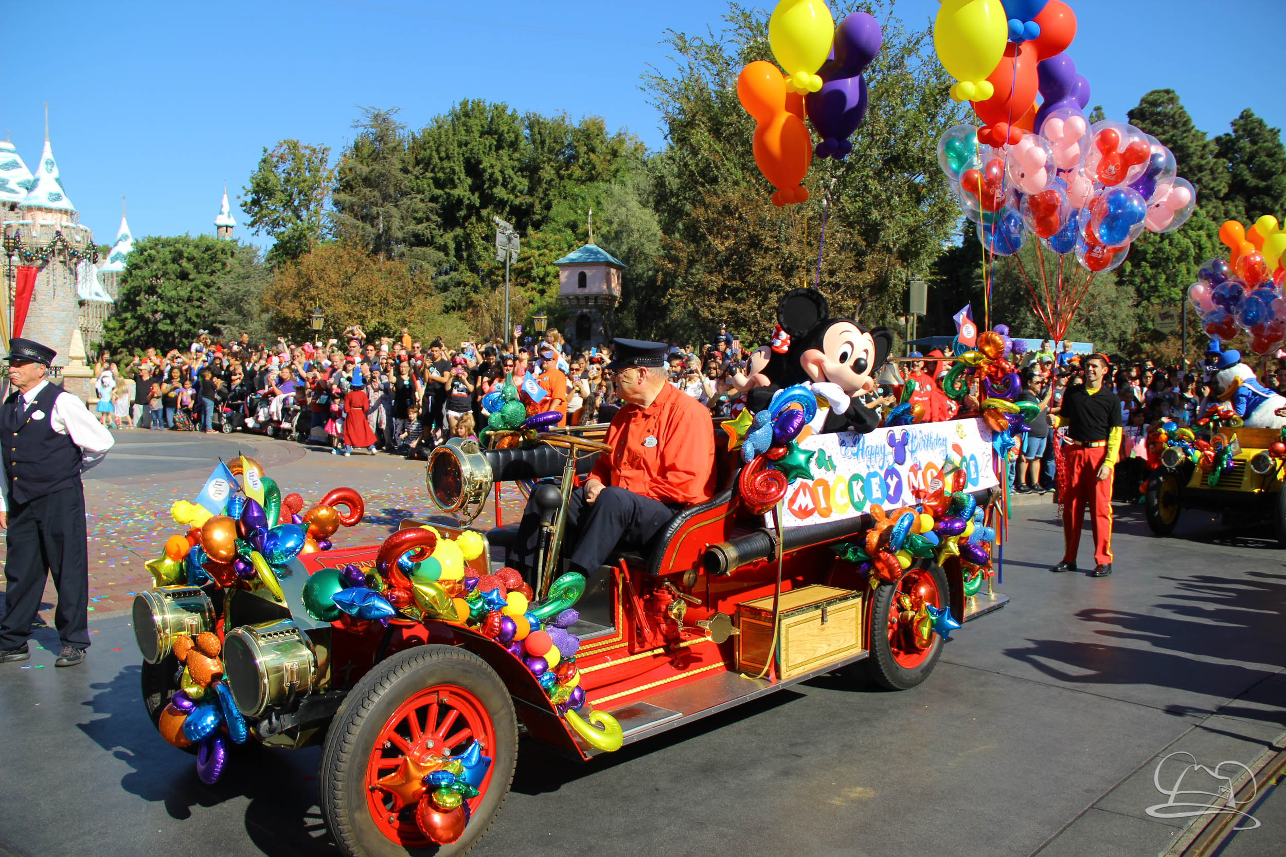 The celebration began with buttons that were given to guests as they entered the turnstiles at Disneyland and Disney California Adventure. In the Emporium at Disneyland and also in the World of Disney in Downtown Disney, merchandise commemorating the day could be found. The big event though was the surprise birthday celebration for Mickey Mouse along the parade route. A cavalcade, led by the Disneyland Band, made its way down the parade route before stopping in front of Sleeping Beauty Castle. This cavalcade also included Minnie Mouse (also her birthday), Pluto, Donald Duck, and Goofy in various Main Street vehicles. On the side of the firetruck a banner wished Mickey Mouse a happy birthday.
