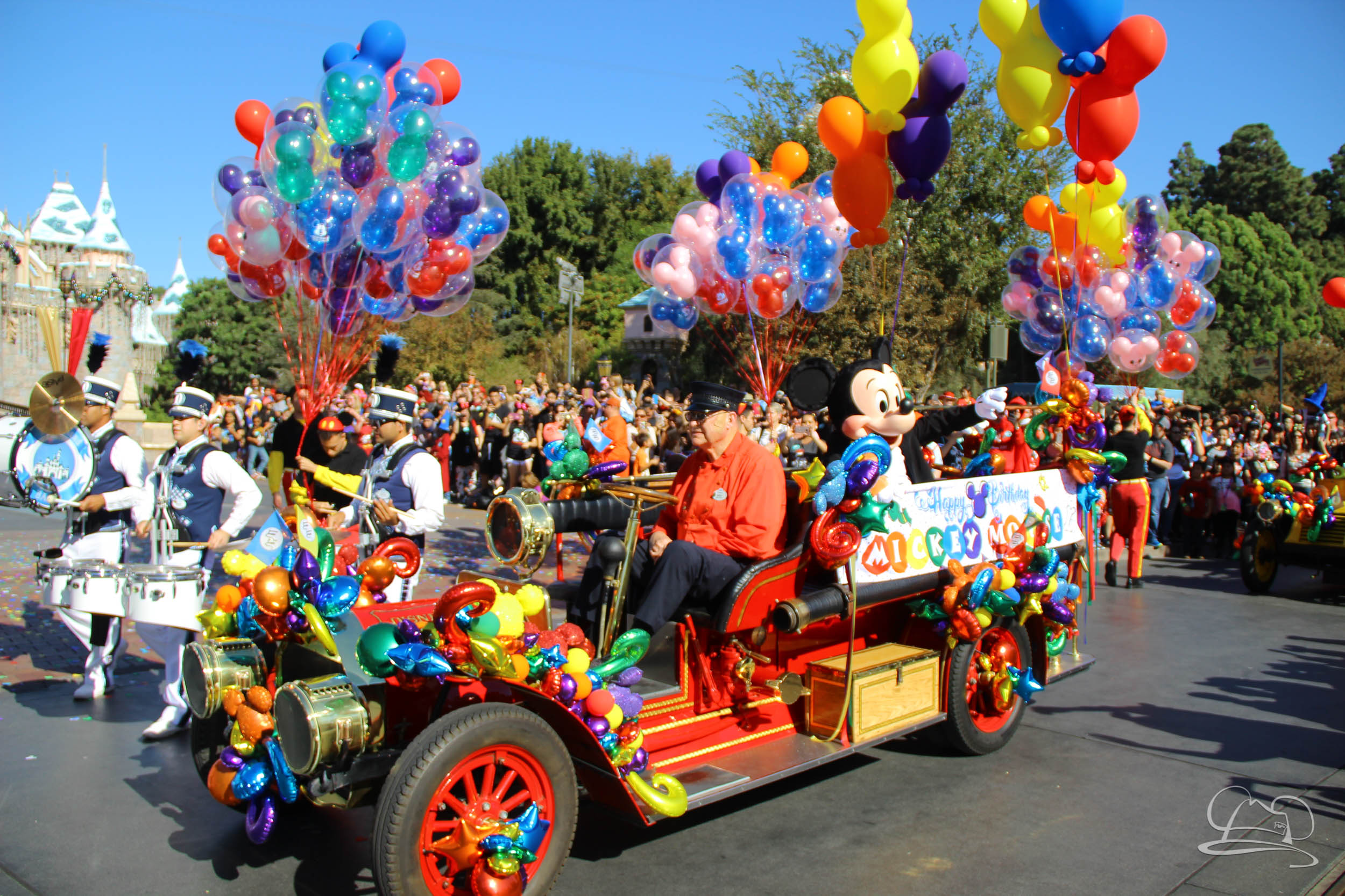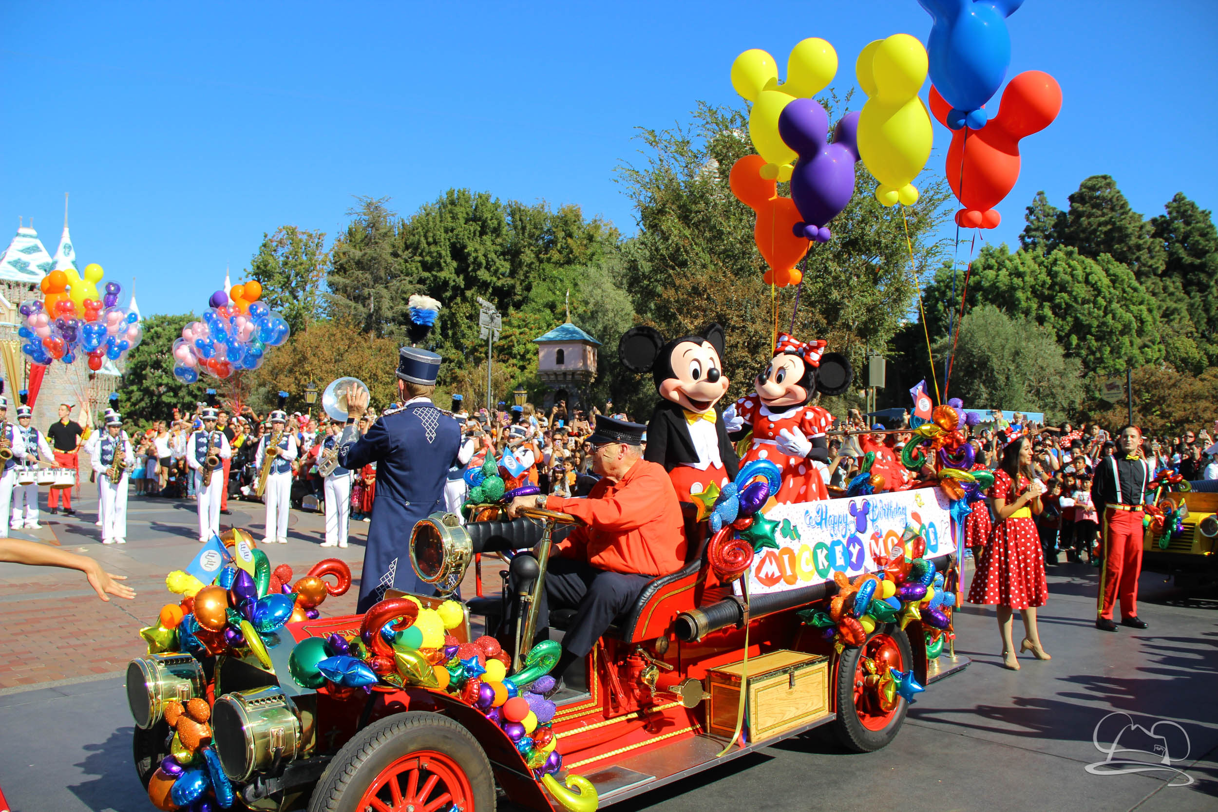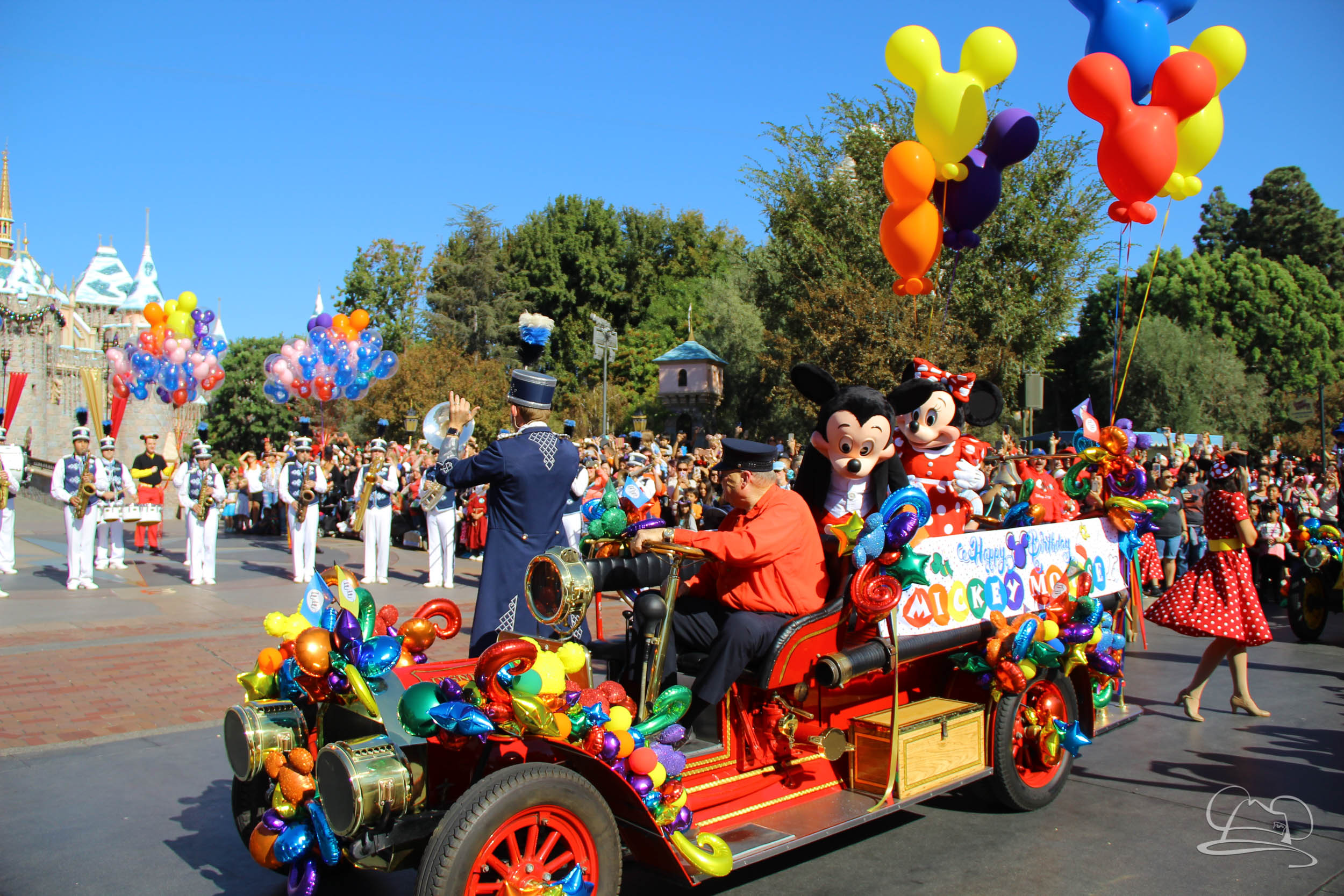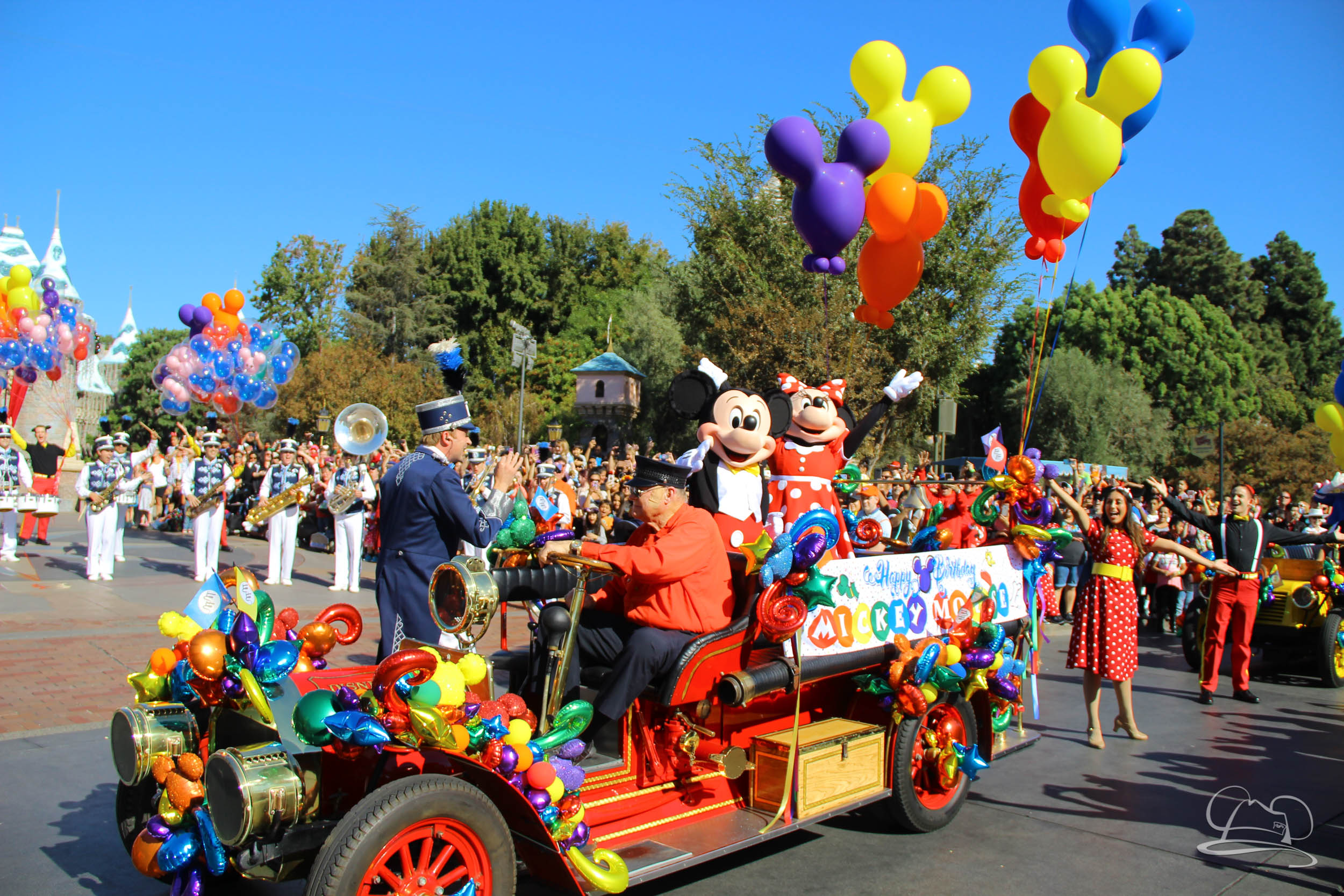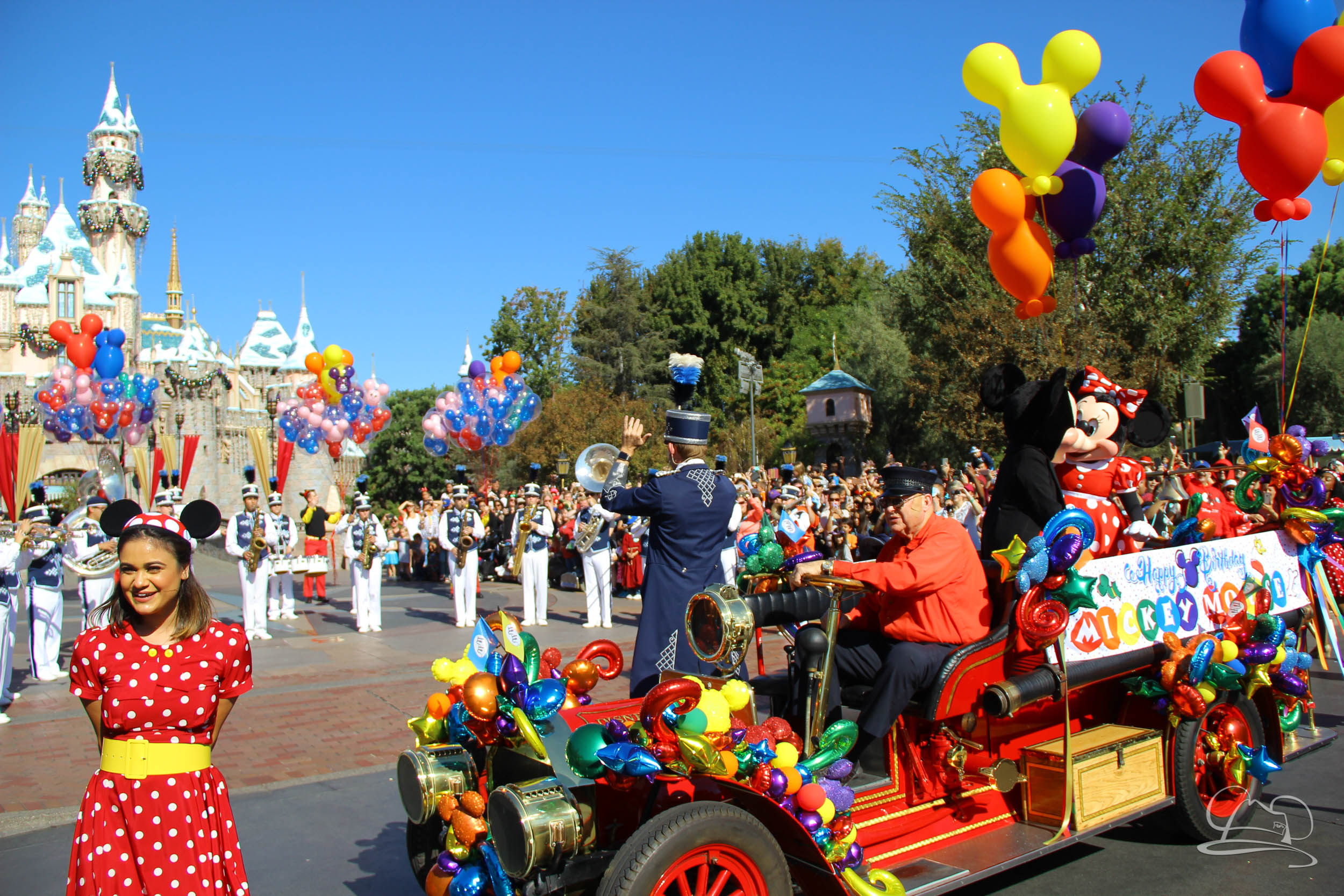 The celebration began with buttons that were given to guests as they entered the turnstiles at Disneyland and Disney California Adventure. In the Emporium at Disneyland and also in the World of Disney in Downtown Disney, merchandise commemorating the day could be found. The big event though was the surprise birthday celebration for Mickey Mouse along the parade route. A cavalcade, led by the Disneyland Band, made its way down the parade route before stopping in front of Sleeping Beauty Castle. This cavalcade also included Minnie Mouse (also her birthday), Pluto, Donald Duck, and Goofy in various Main Street vehicles. On the side of the firetruck a banner wished Mickey Mouse a happy birthday.