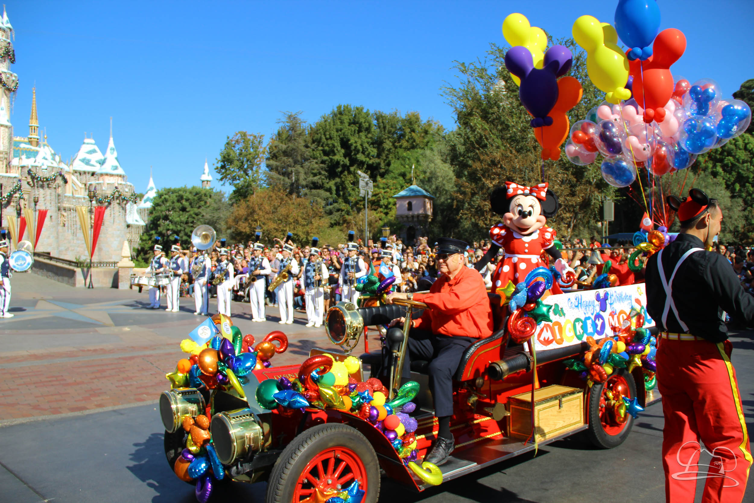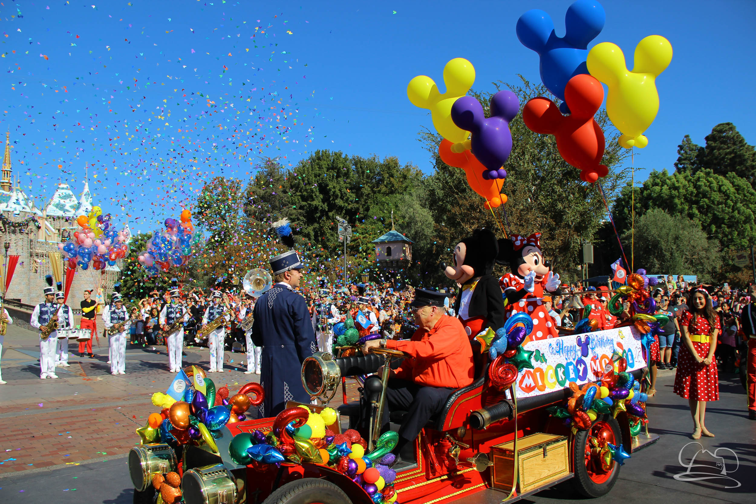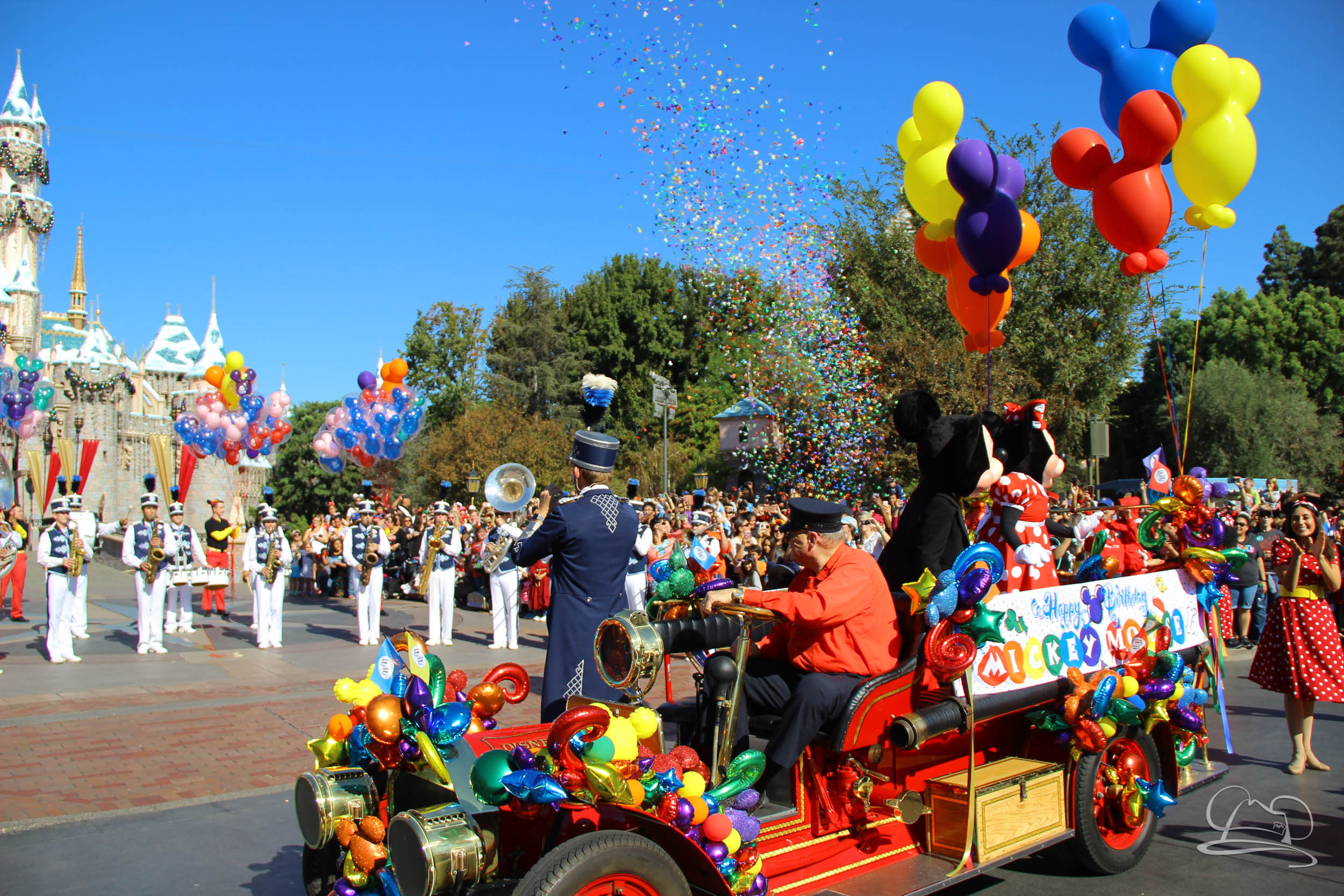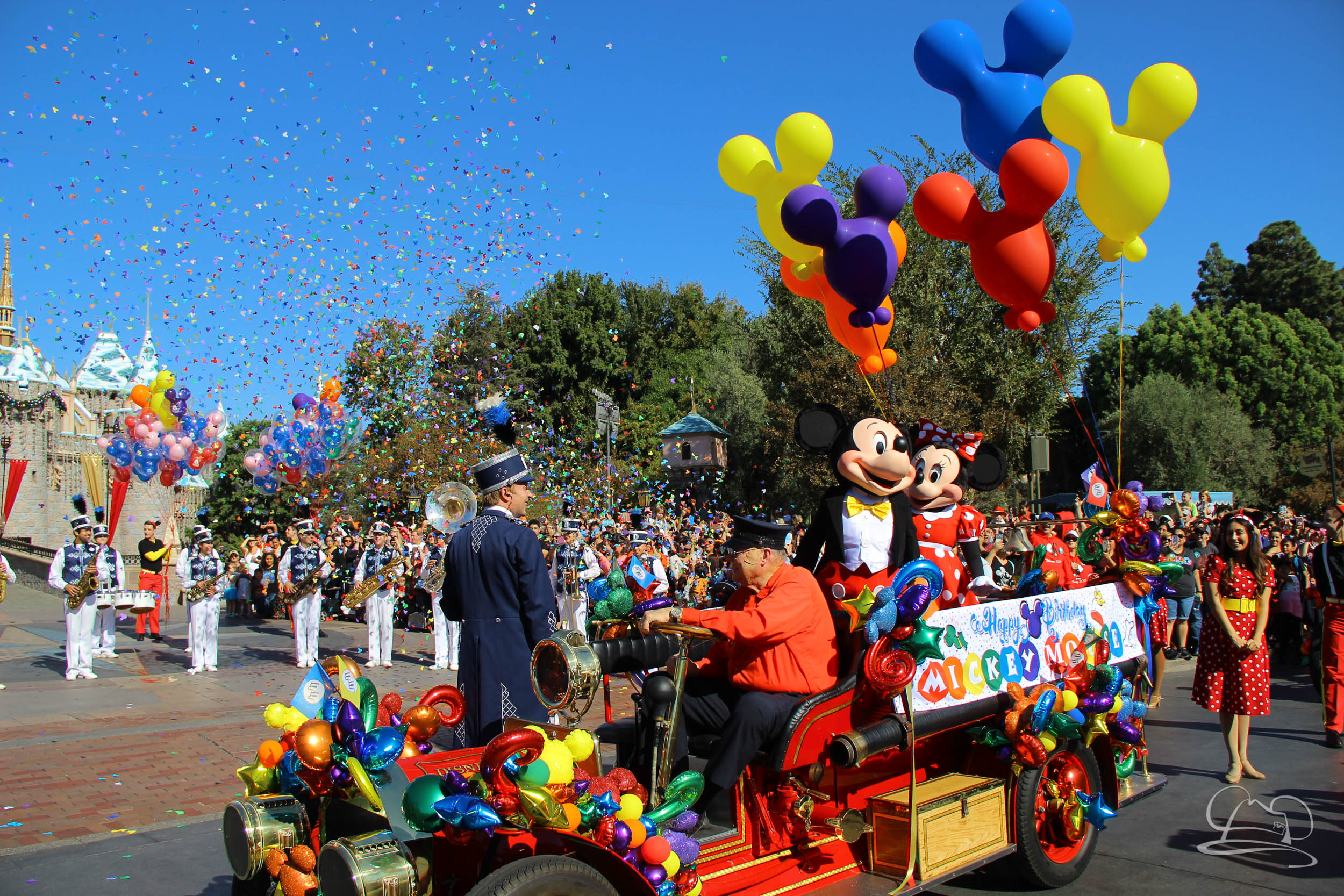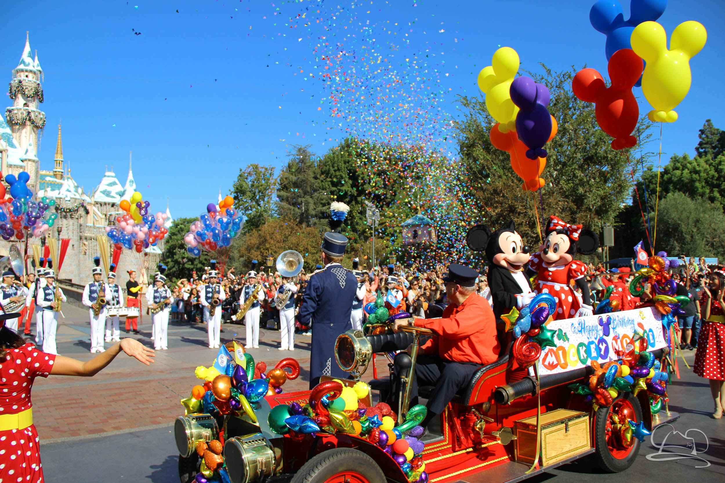 The celebration began with buttons that were given to guests as they entered the turnstiles at Disneyland and Disney California Adventure. In the Emporium at Disneyland and also in the World of Disney in Downtown Disney, merchandise commemorating the day could be found. The big event though was the surprise birthday celebration for Mickey Mouse along the parade route. A cavalcade, led by the Disneyland Band, made its way down the parade route before stopping in front of Sleeping Beauty Castle. This cavalcade also included Minnie Mouse (also her birthday), Pluto, Donald Duck, and Goofy in various Main Street vehicles. On the side of the firetruck a banner wished Mickey Mouse a happy birthday.