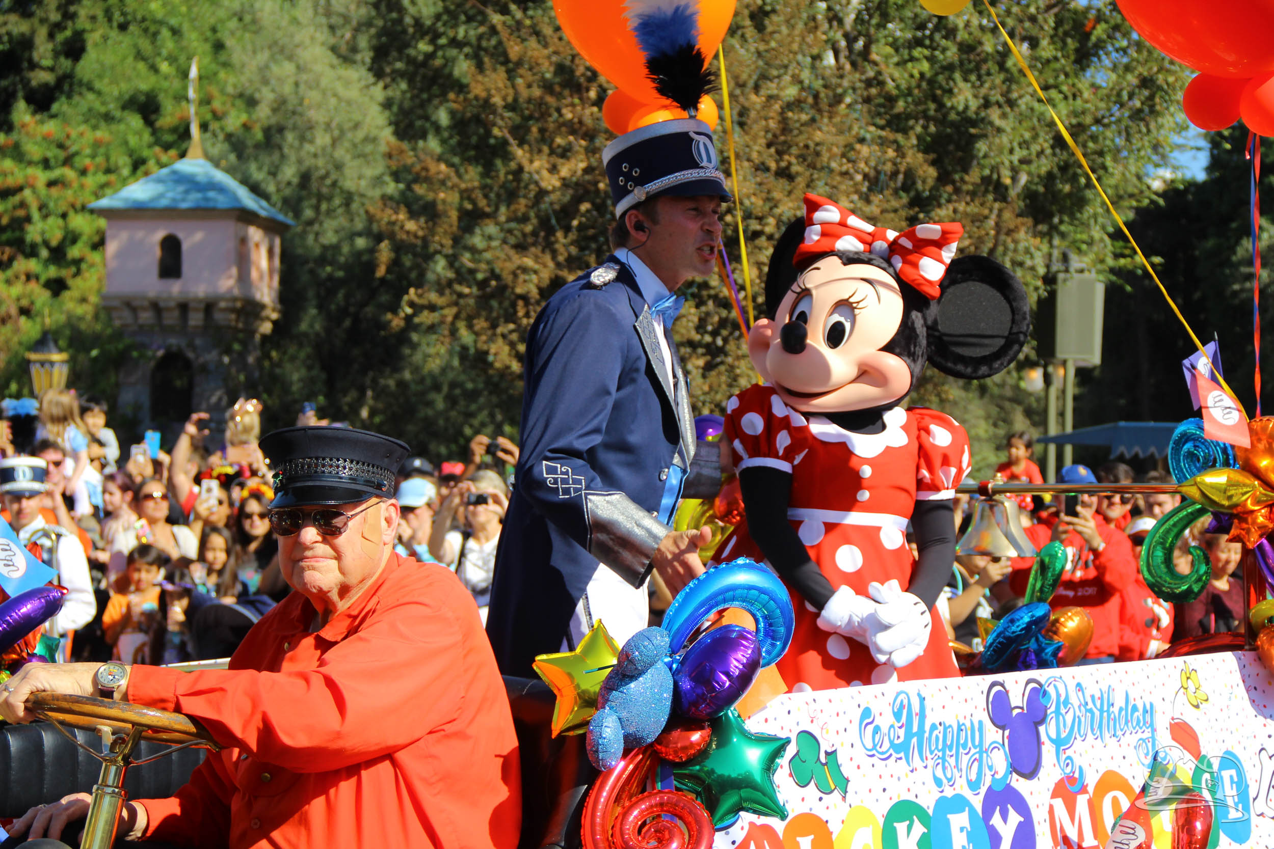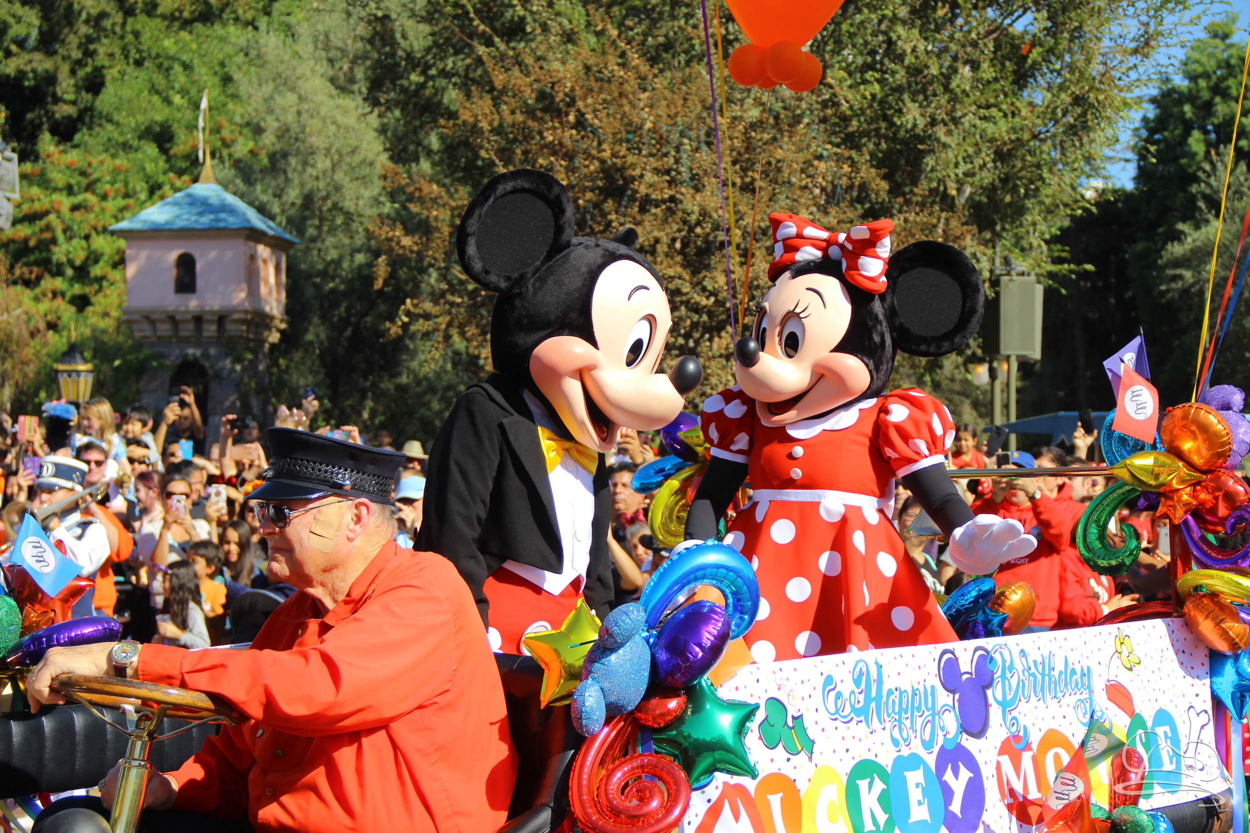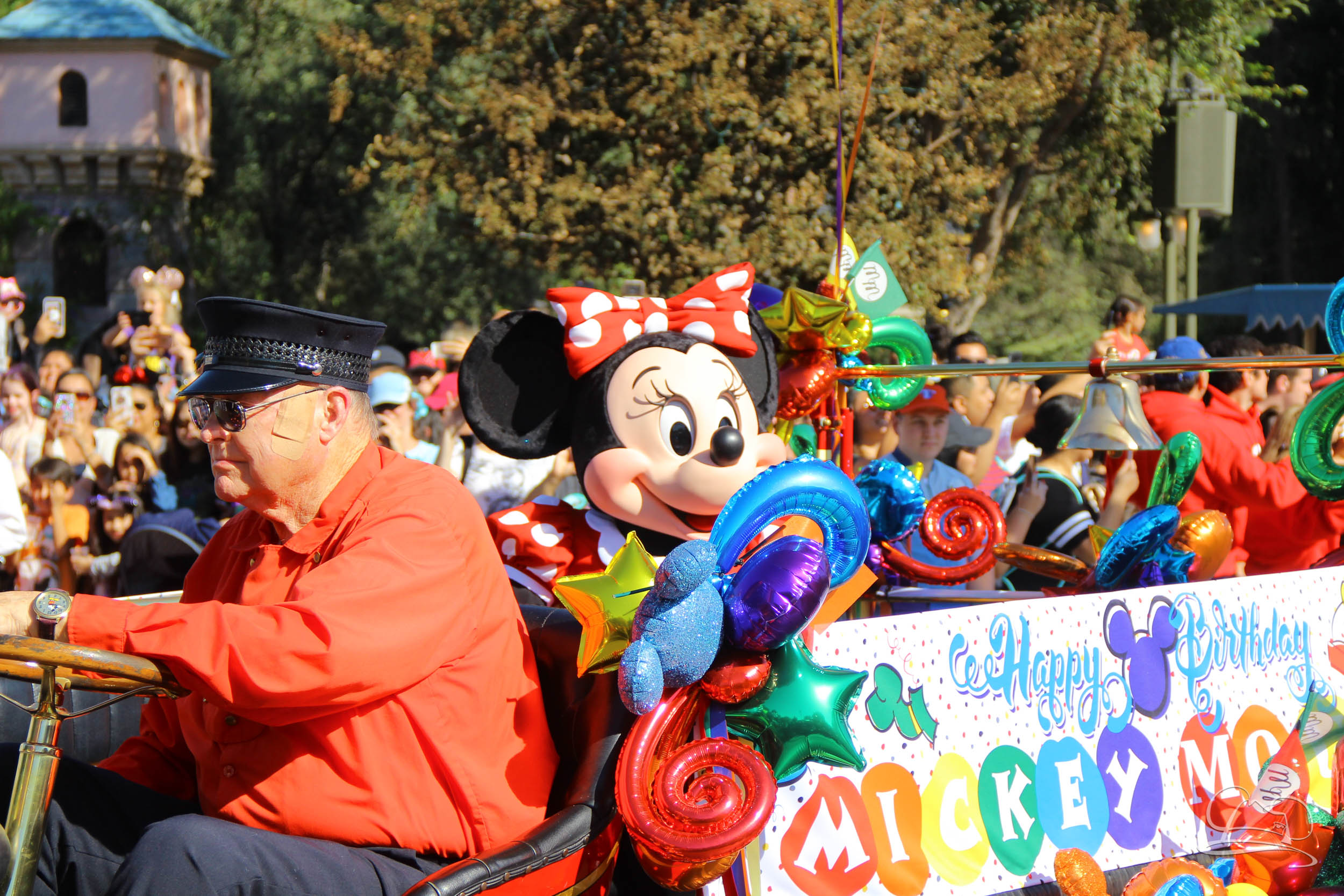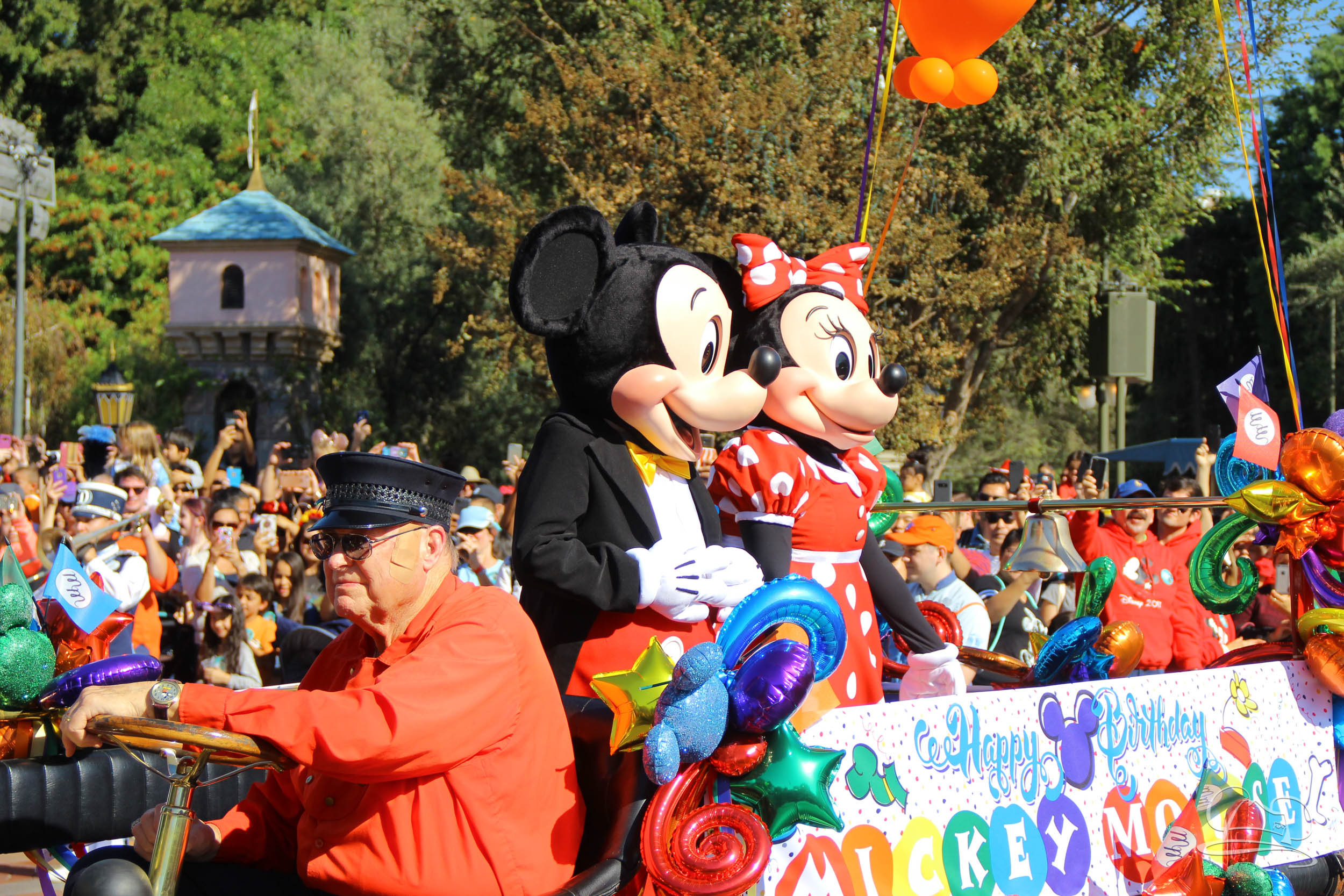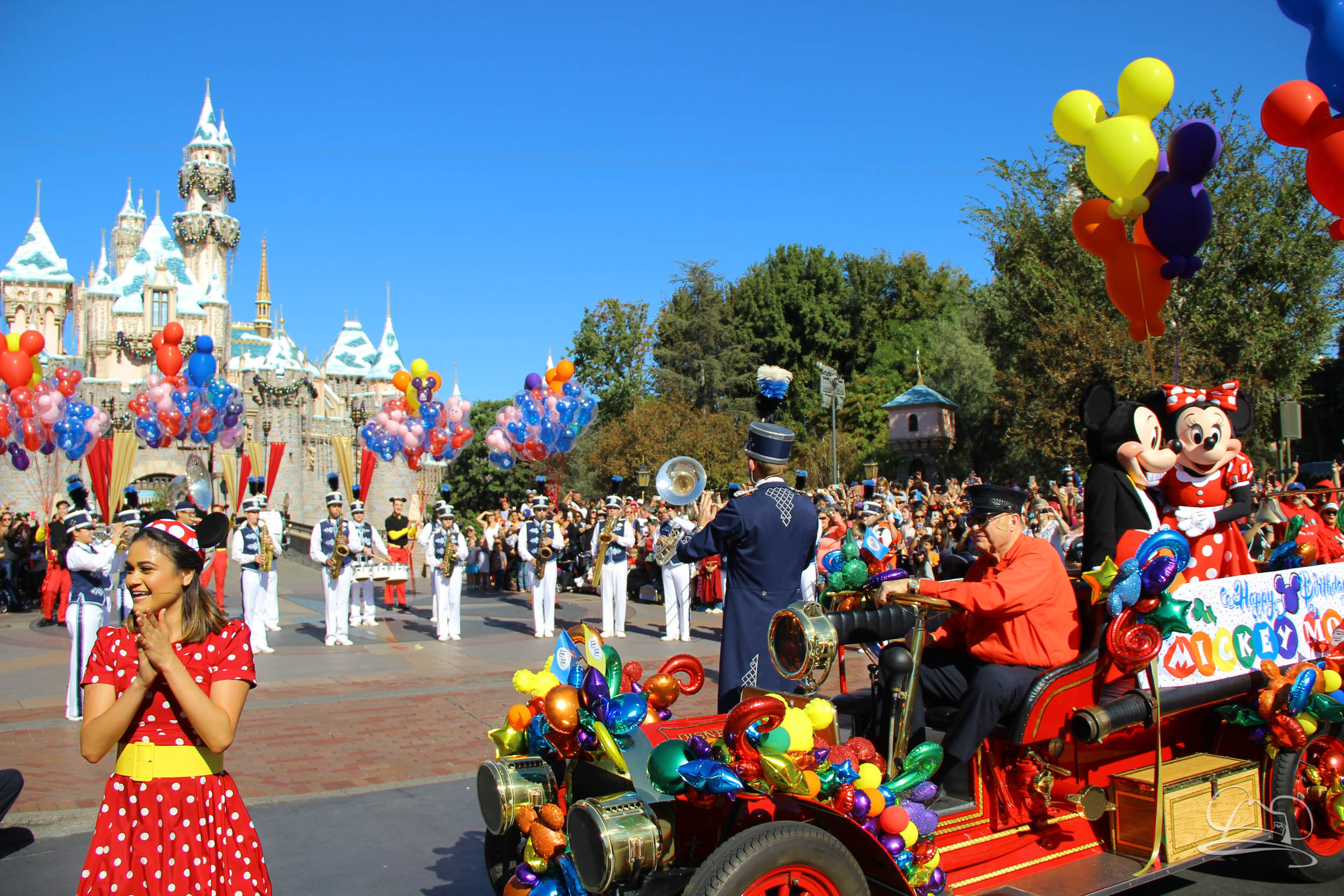 The celebration began with buttons that were given to guests as they entered the turnstiles at Disneyland and Disney California Adventure. In the Emporium at Disneyland and also in the World of Disney in Downtown Disney, merchandise commemorating the day could be found. The big event though was the surprise birthday celebration for Mickey Mouse along the parade route. A cavalcade, led by the Disneyland Band, made its way down the parade route before stopping in front of Sleeping Beauty Castle. This cavalcade also included Minnie Mouse (also her birthday), Pluto, Donald Duck, and Goofy in various Main Street vehicles. On the side of the firetruck a banner wished Mickey Mouse a happy birthday.