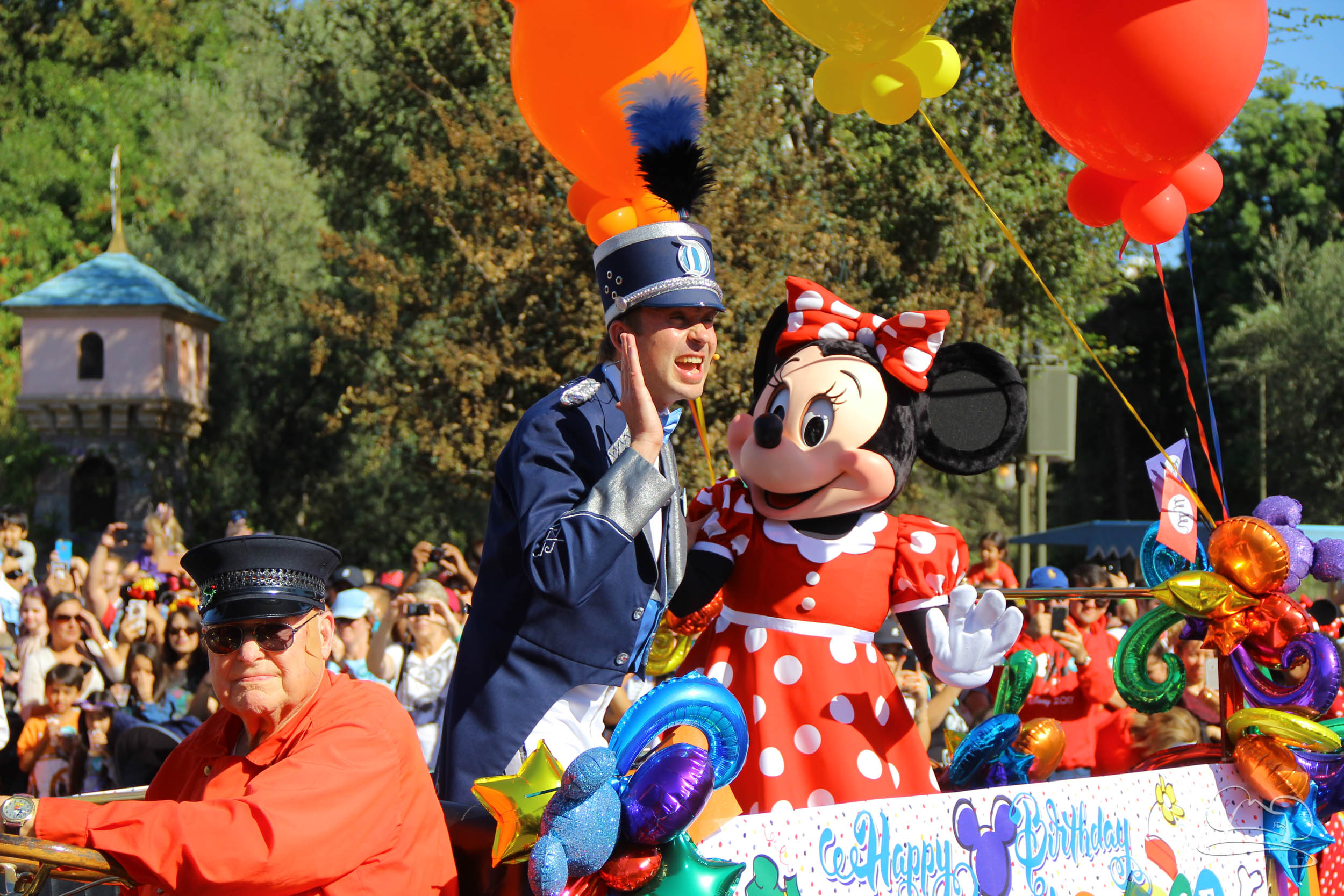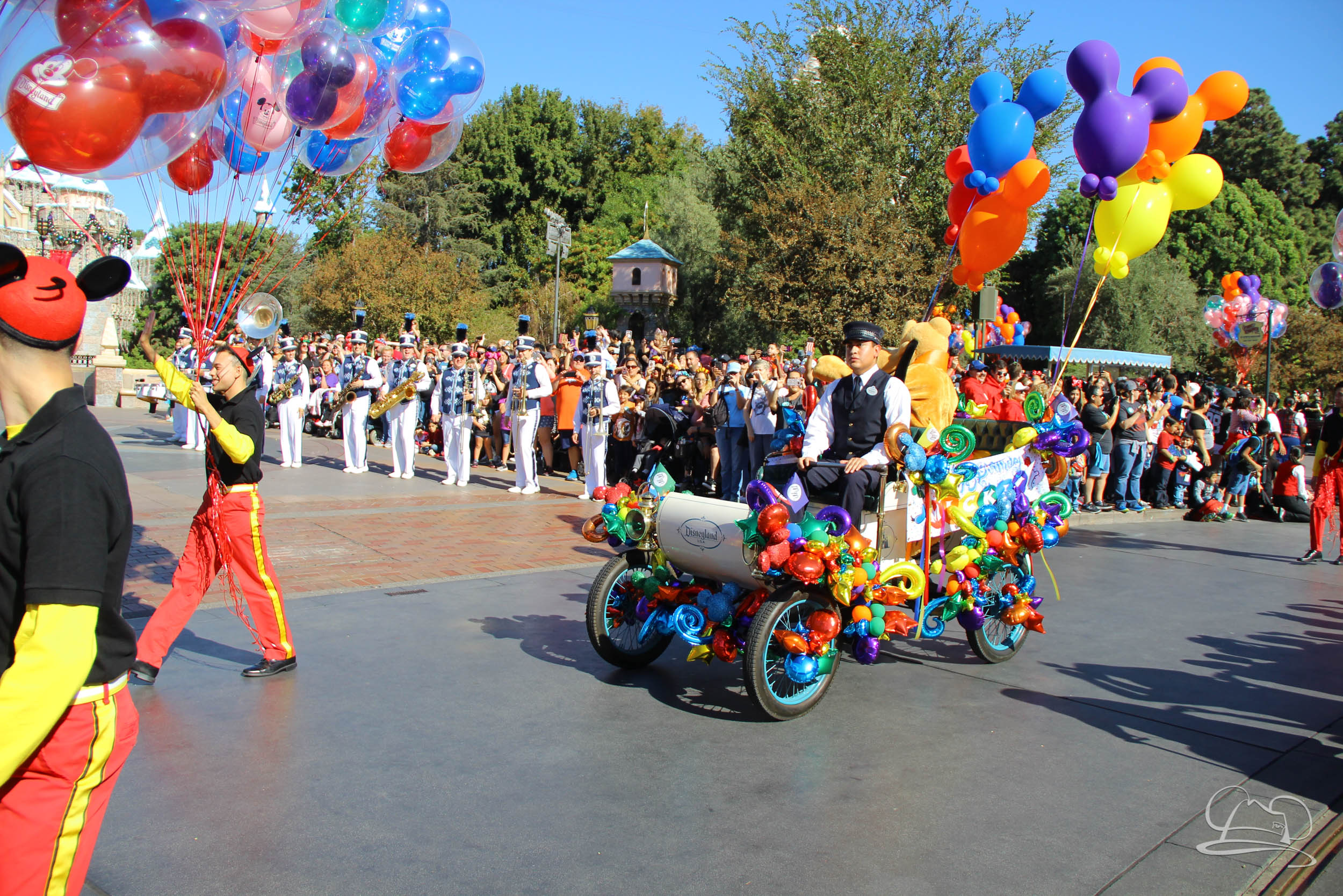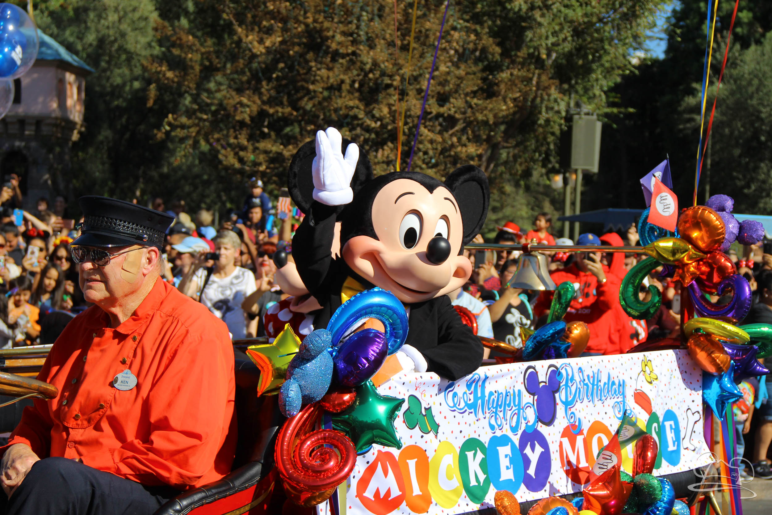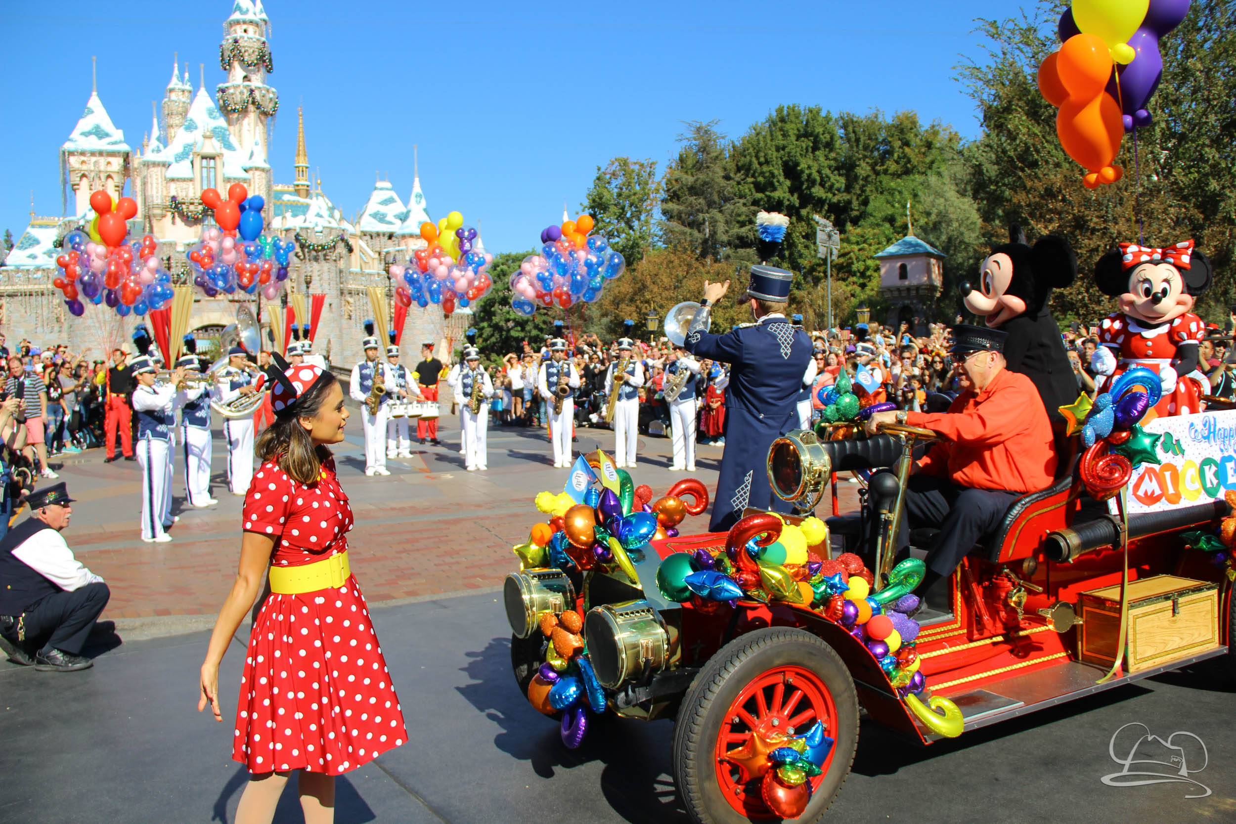 The celebration began with buttons that were given to guests as they entered the turnstiles at Disneyland and Disney California Adventure. In the Emporium at Disneyland and also in the World of Disney in Downtown Disney, merchandise commemorating the day could be found. The big event though was the surprise birthday celebration for Mickey Mouse along the parade route. A cavalcade, led by the Disneyland Band, made its way down the parade route before stopping in front of Sleeping Beauty Castle. This cavalcade also included Minnie Mouse (also her birthday), Pluto, Donald Duck, and Goofy in various Main Street vehicles. On the side of the firetruck a banner wished Mickey Mouse a happy birthday.