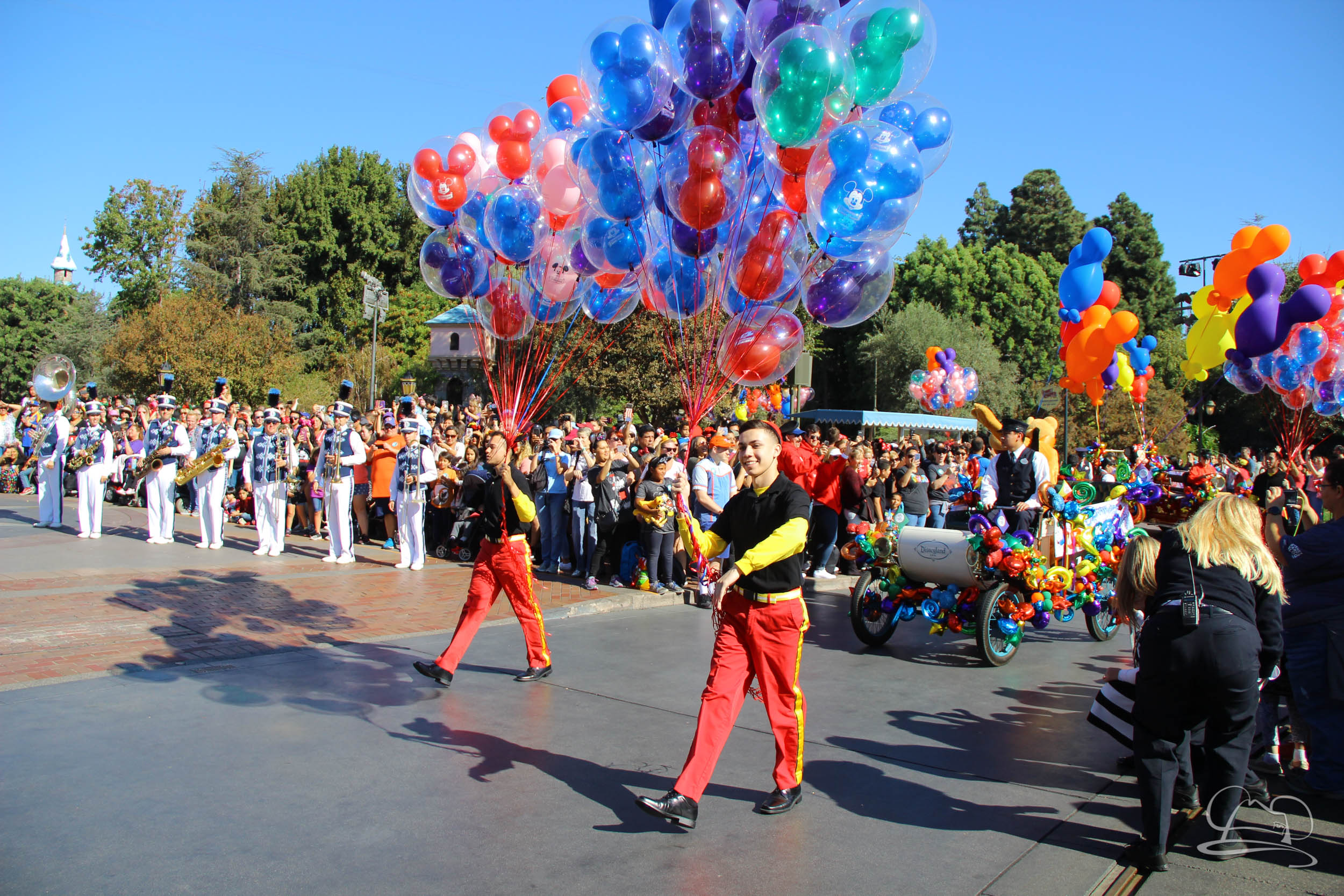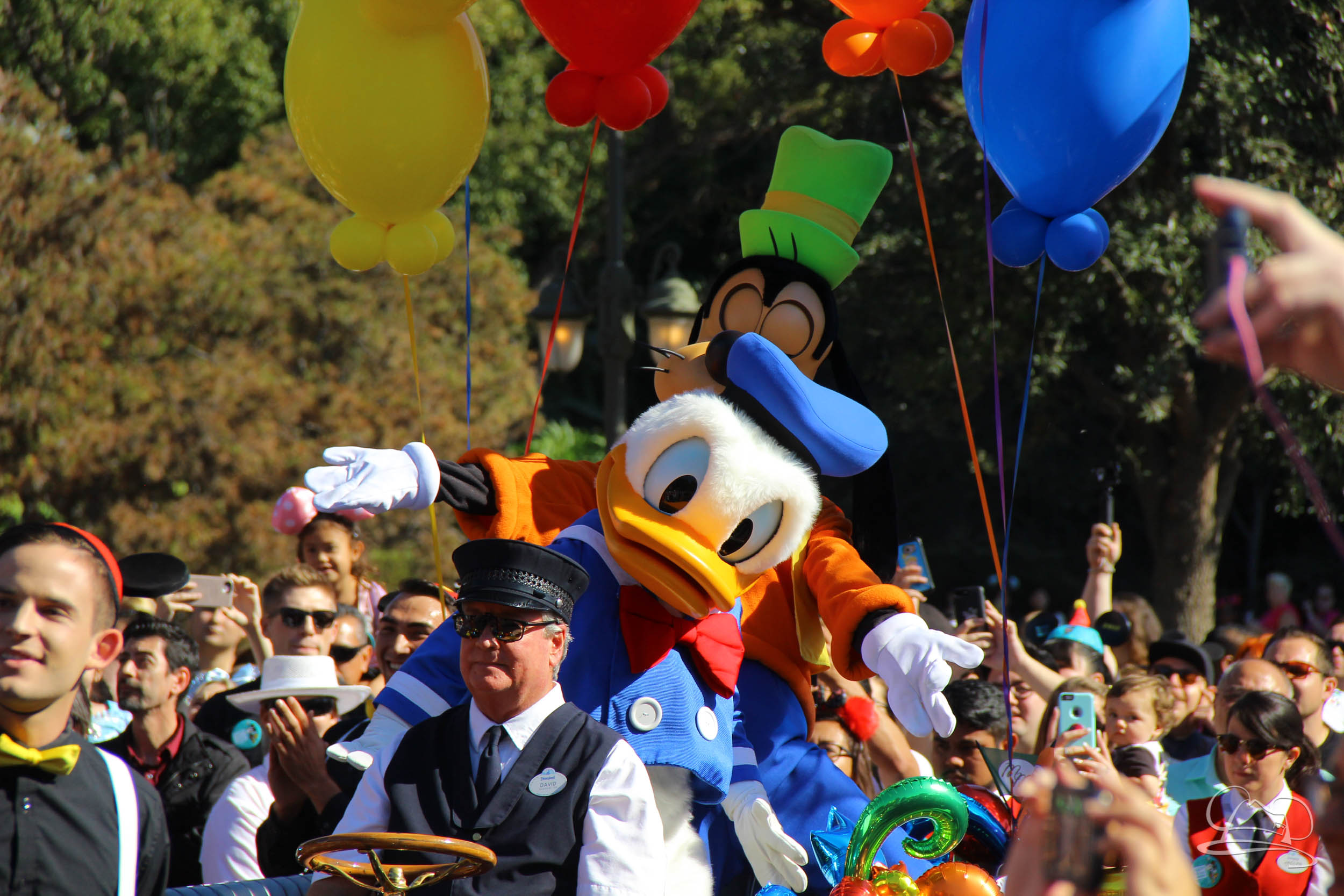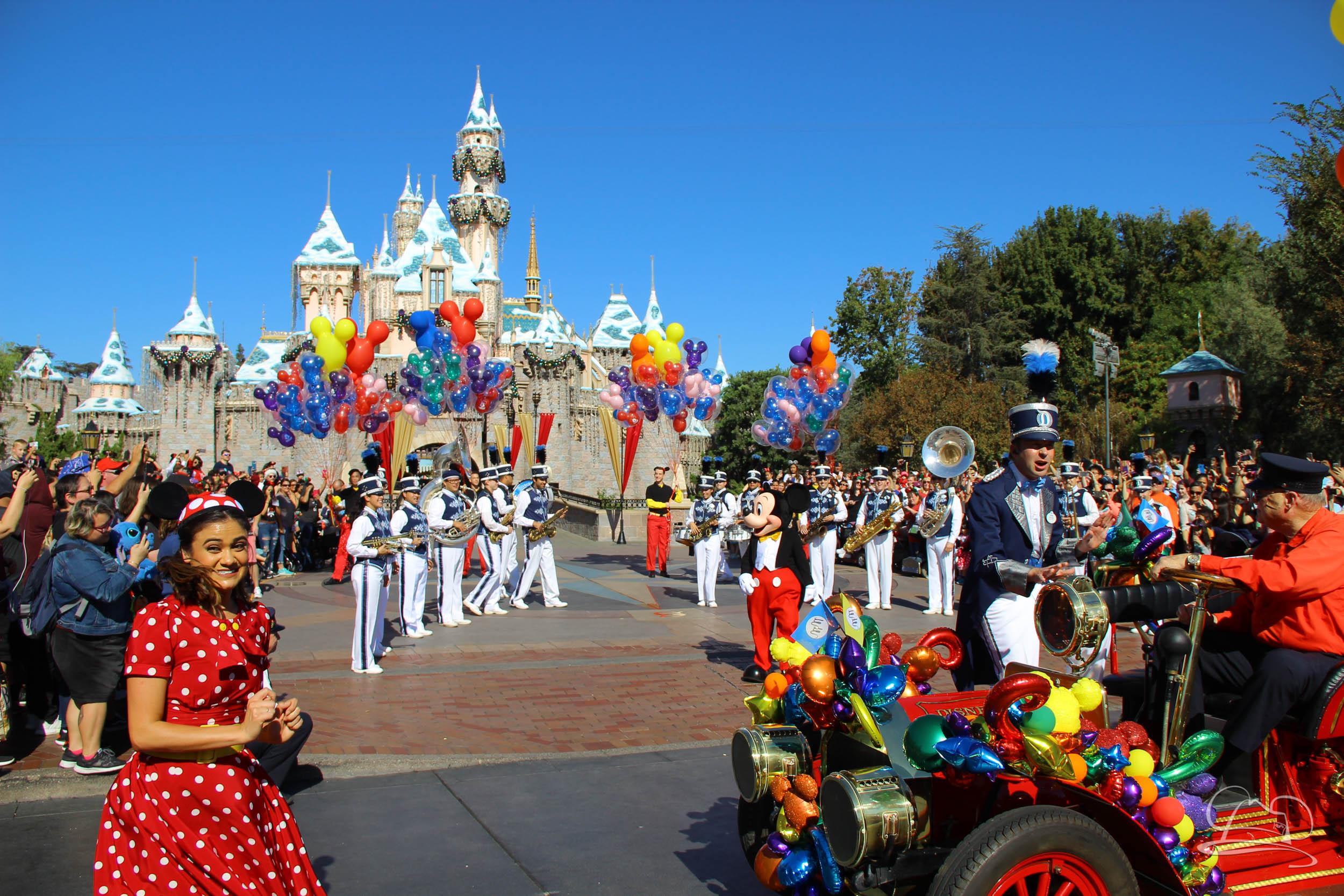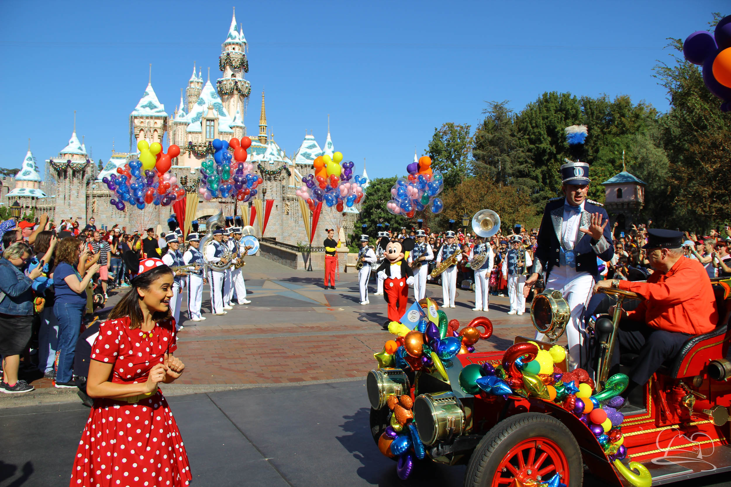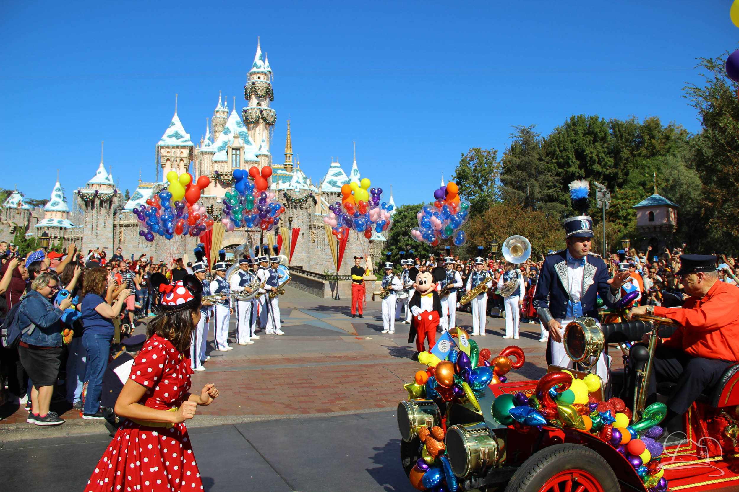The celebration began with buttons that were given to guests as they entered the turnstiles at Disneyland and Disney California Adventure. In the Emporium at Disneyland and also in the World of Disney in Downtown Disney, merchandise commemorating the day could be found. The big event though was the surprise birthday celebration for Mickey Mouse along the parade route. A cavalcade, led by the Disneyland Band, made its way down the parade route before stopping in front of Sleeping Beauty Castle. This cavalcade also included Minnie Mouse (also her birthday), Pluto, Donald Duck, and Goofy in various Main Street vehicles. On the side of the firetruck a banner wished Mickey Mouse a happy birthday.