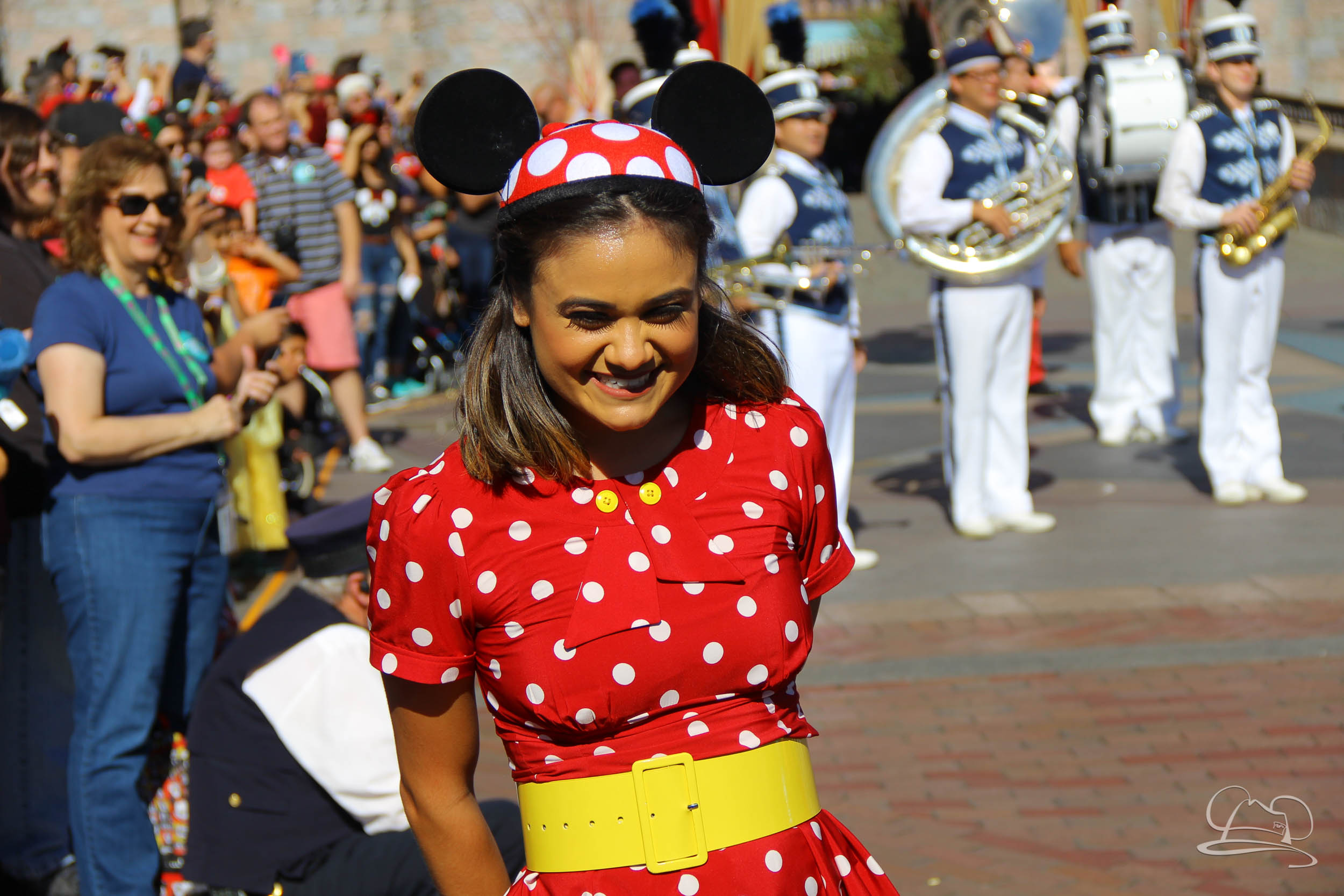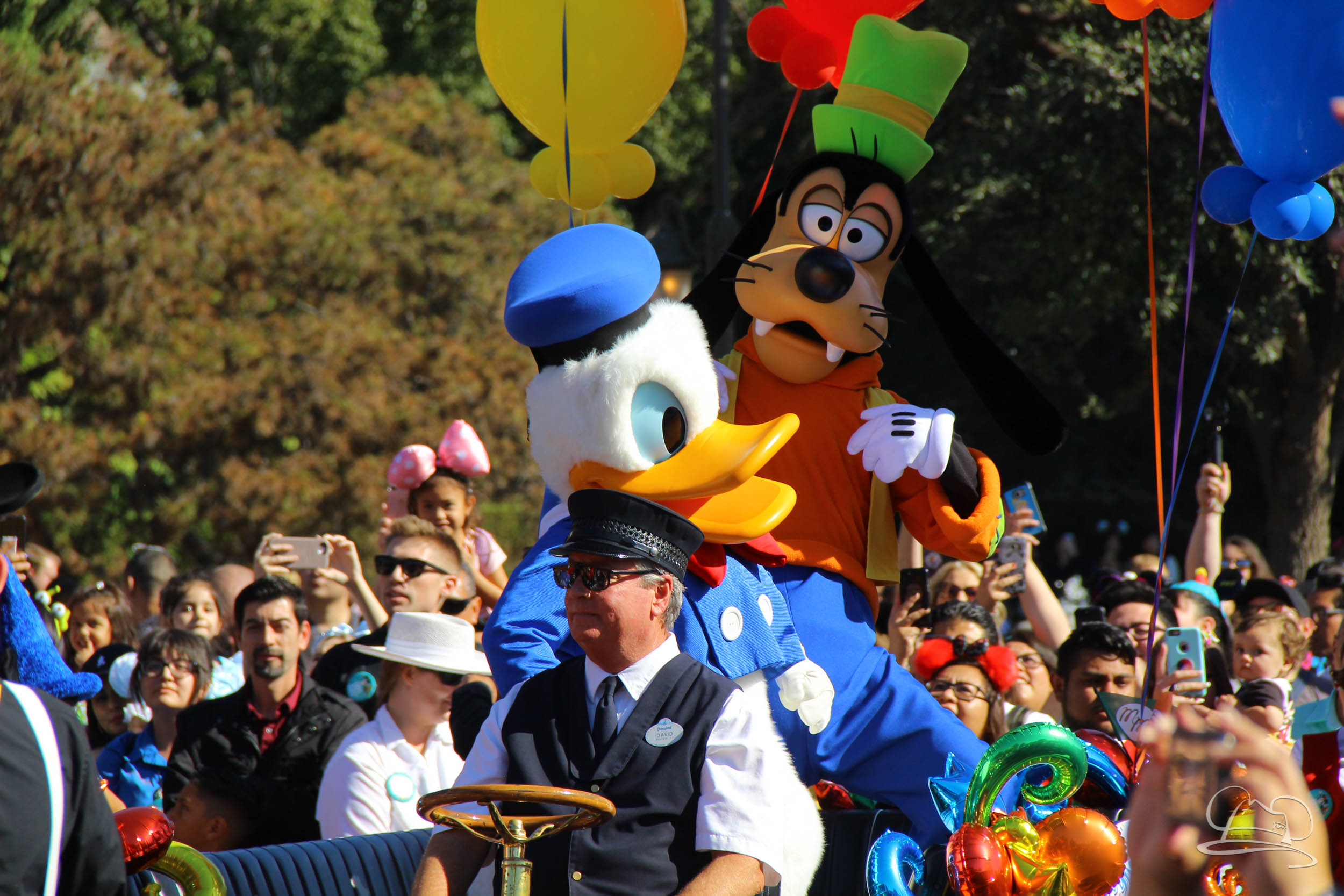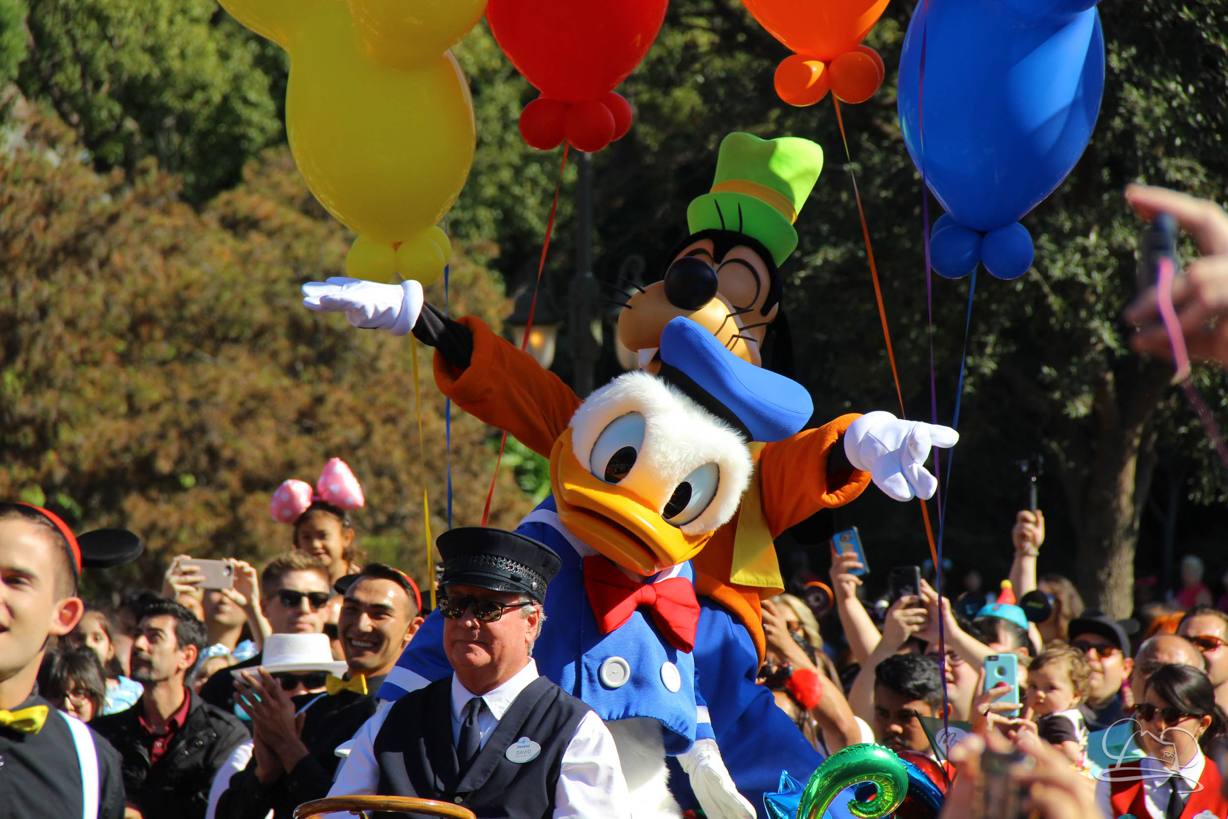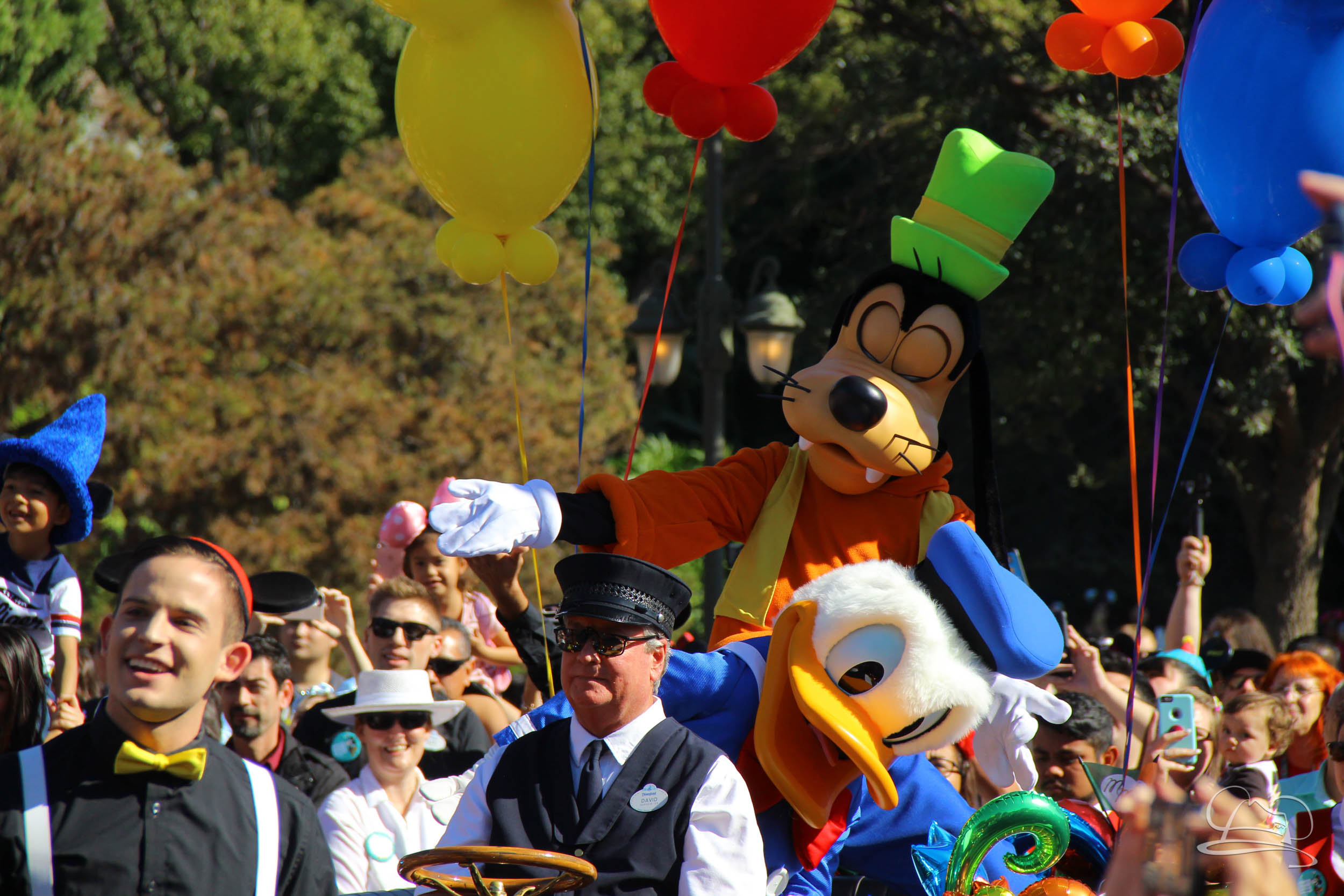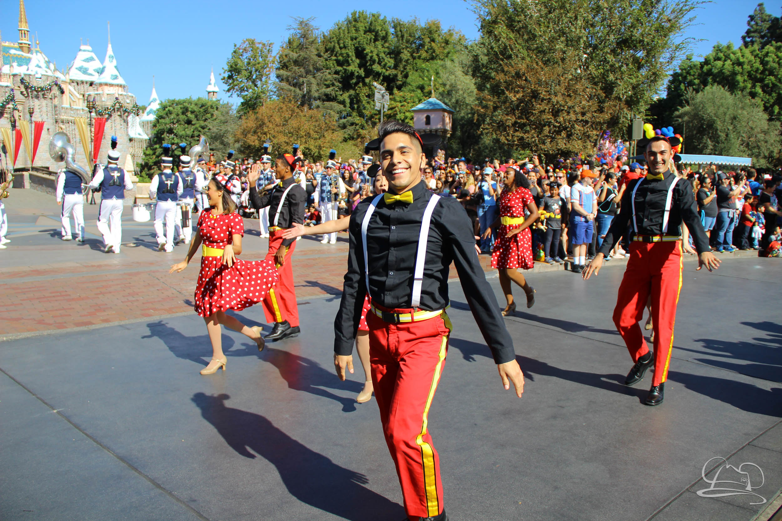 The celebration began with buttons that were given to guests as they entered the turnstiles at Disneyland and Disney California Adventure. In the Emporium at Disneyland and also in the World of Disney in Downtown Disney, merchandise commemorating the day could be found. The big event though was the surprise birthday celebration for Mickey Mouse along the parade route. A cavalcade, led by the Disneyland Band, made its way down the parade route before stopping in front of Sleeping Beauty Castle. This cavalcade also included Minnie Mouse (also her birthday), Pluto, Donald Duck, and Goofy in various Main Street vehicles. On the side of the firetruck a banner wished Mickey Mouse a happy birthday.