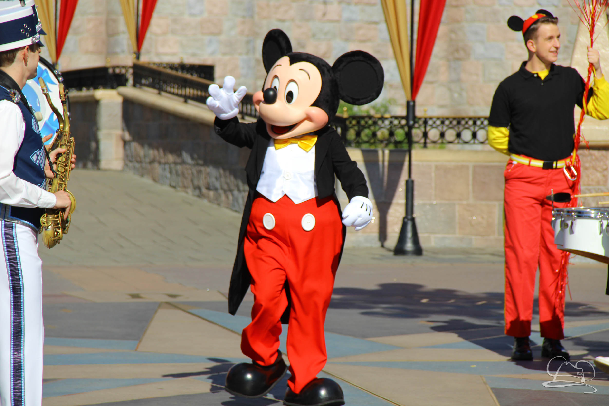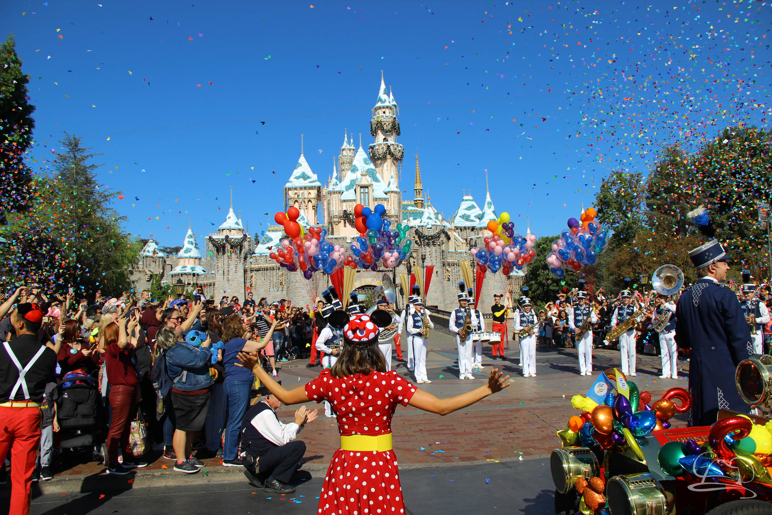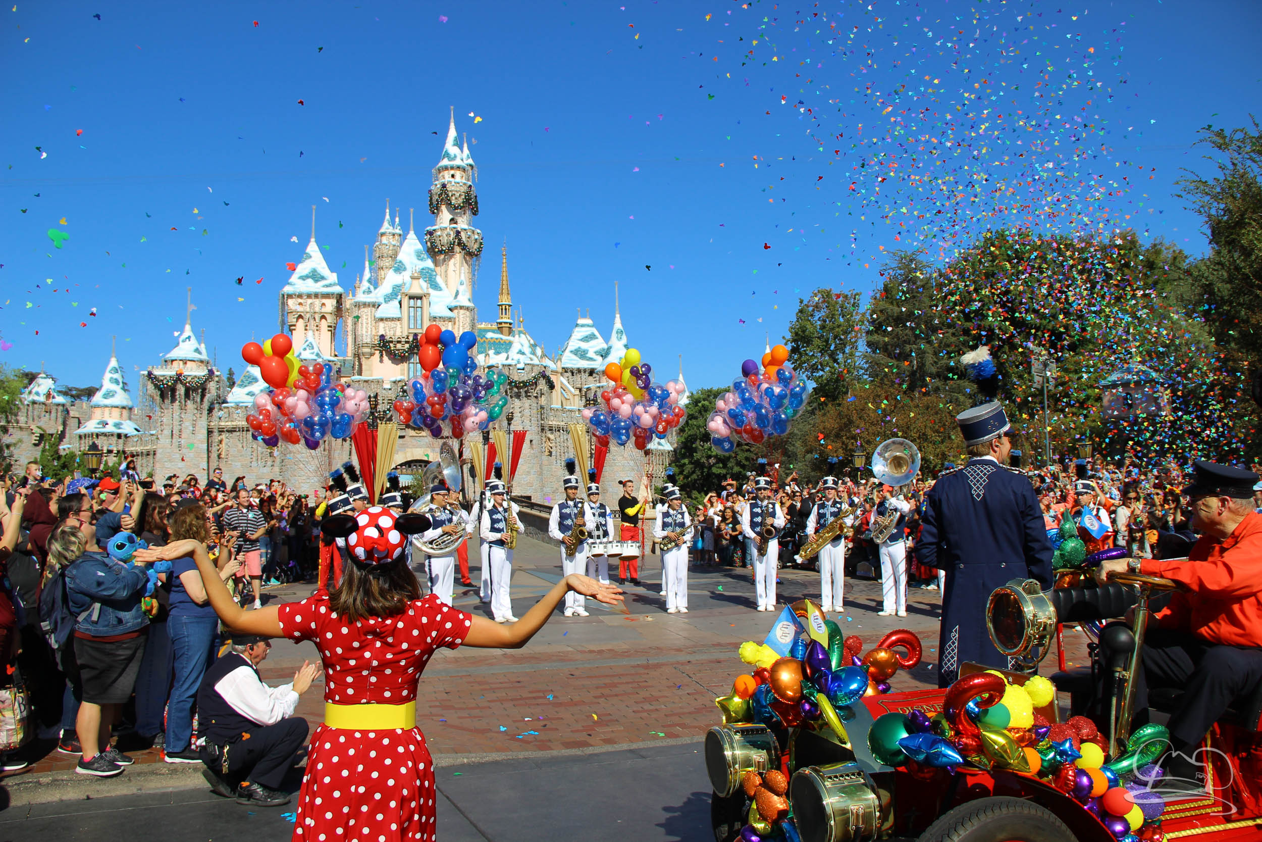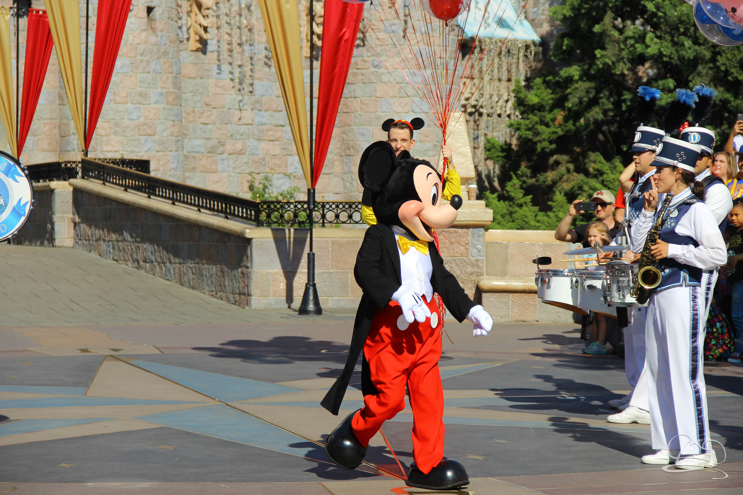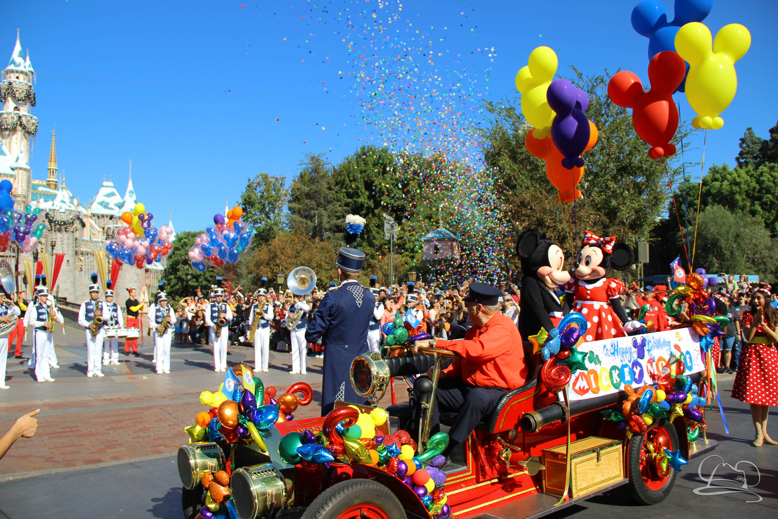 The band and cavalcade stopped in front of Sleeping Beauty Castle and then Mickey was called out from the castle for his surprise. Once he was surprised, everyone sang Happy Birthday. The song ended with an explosion of confetti.