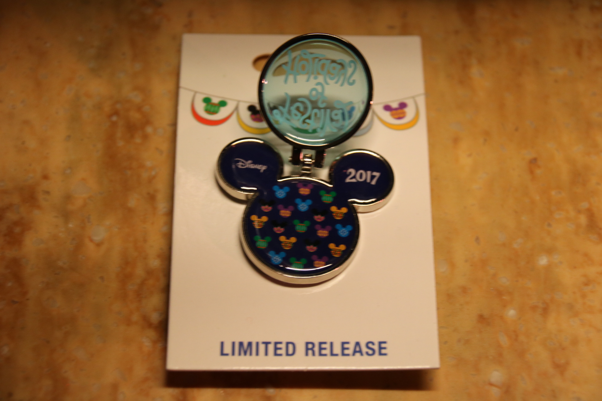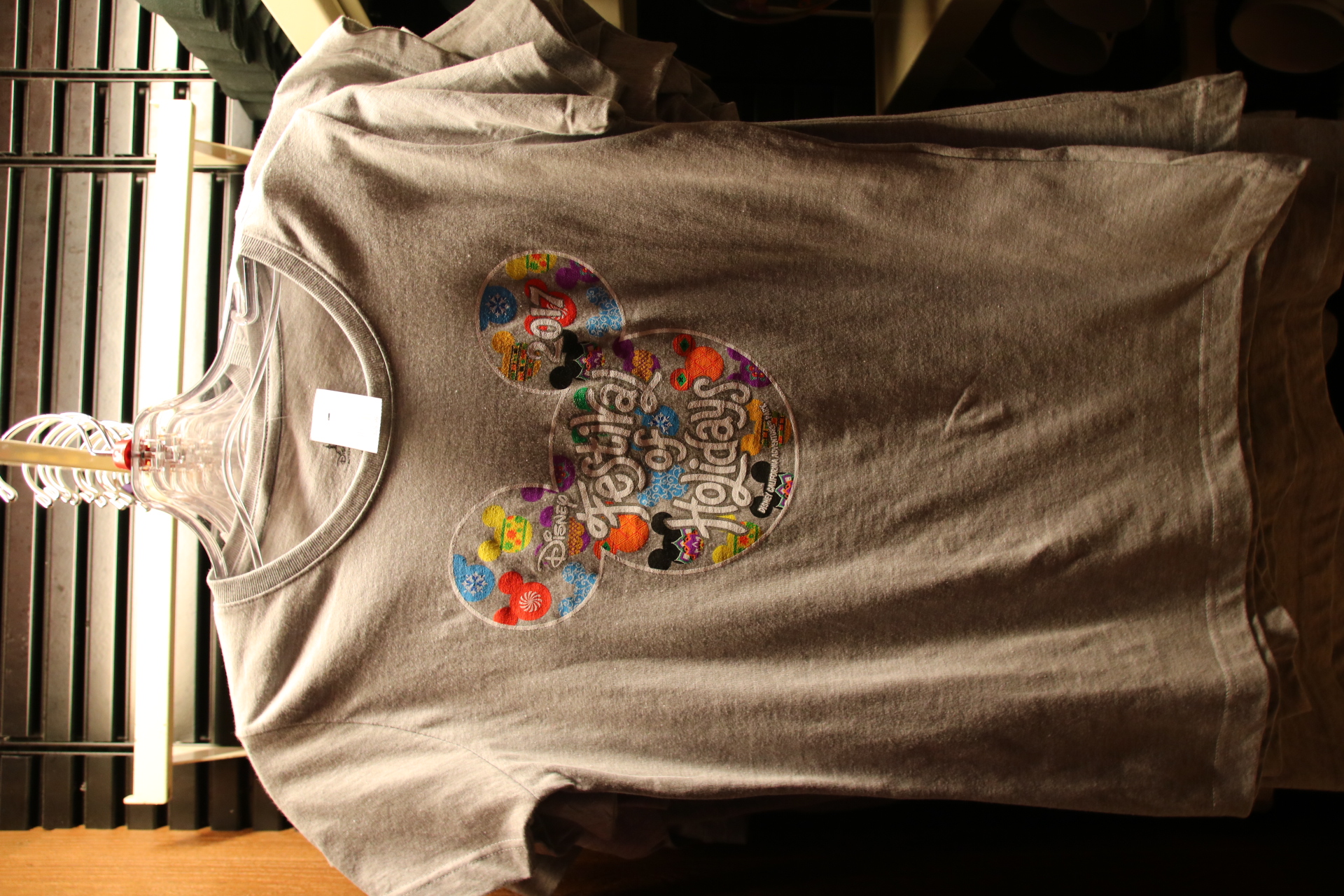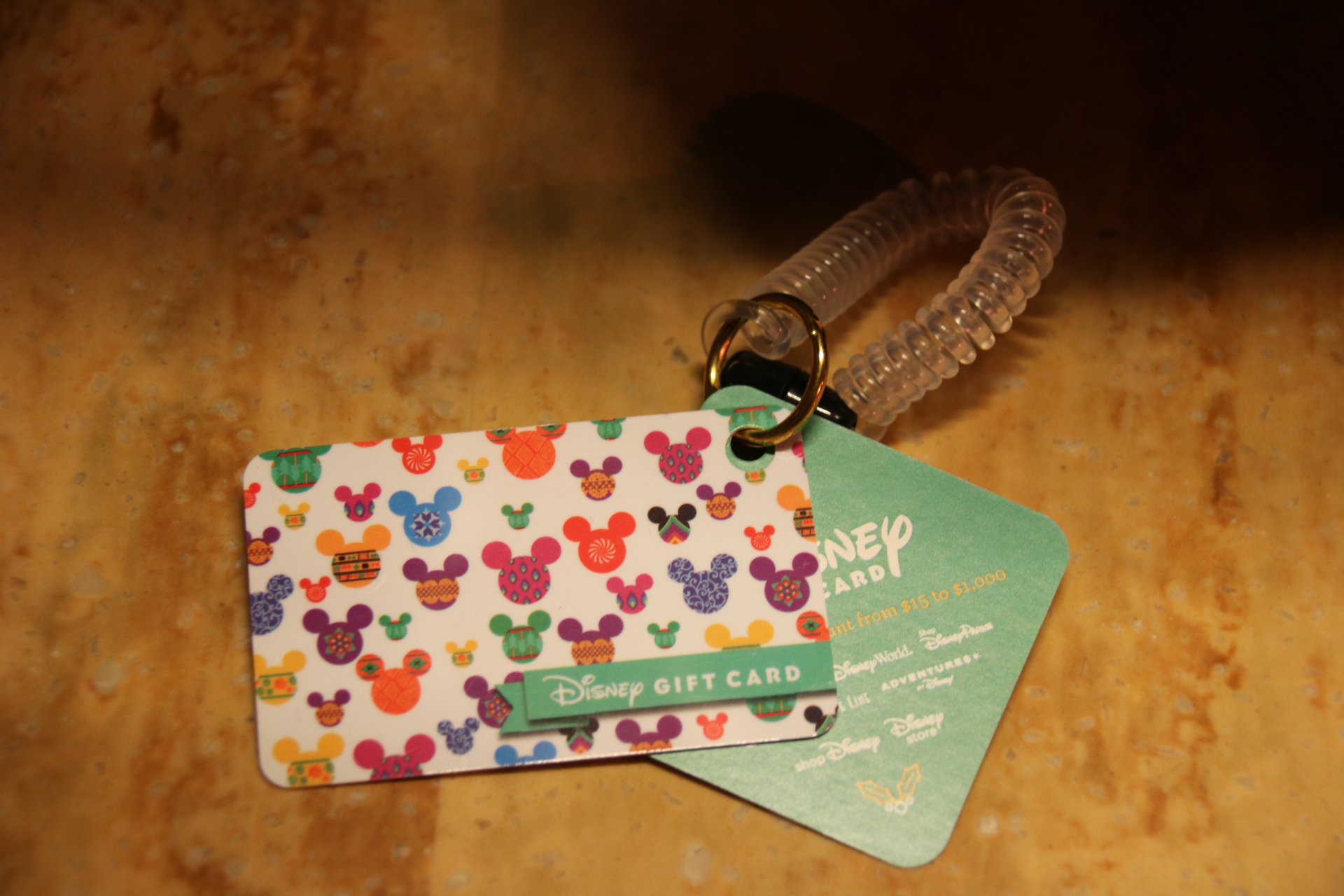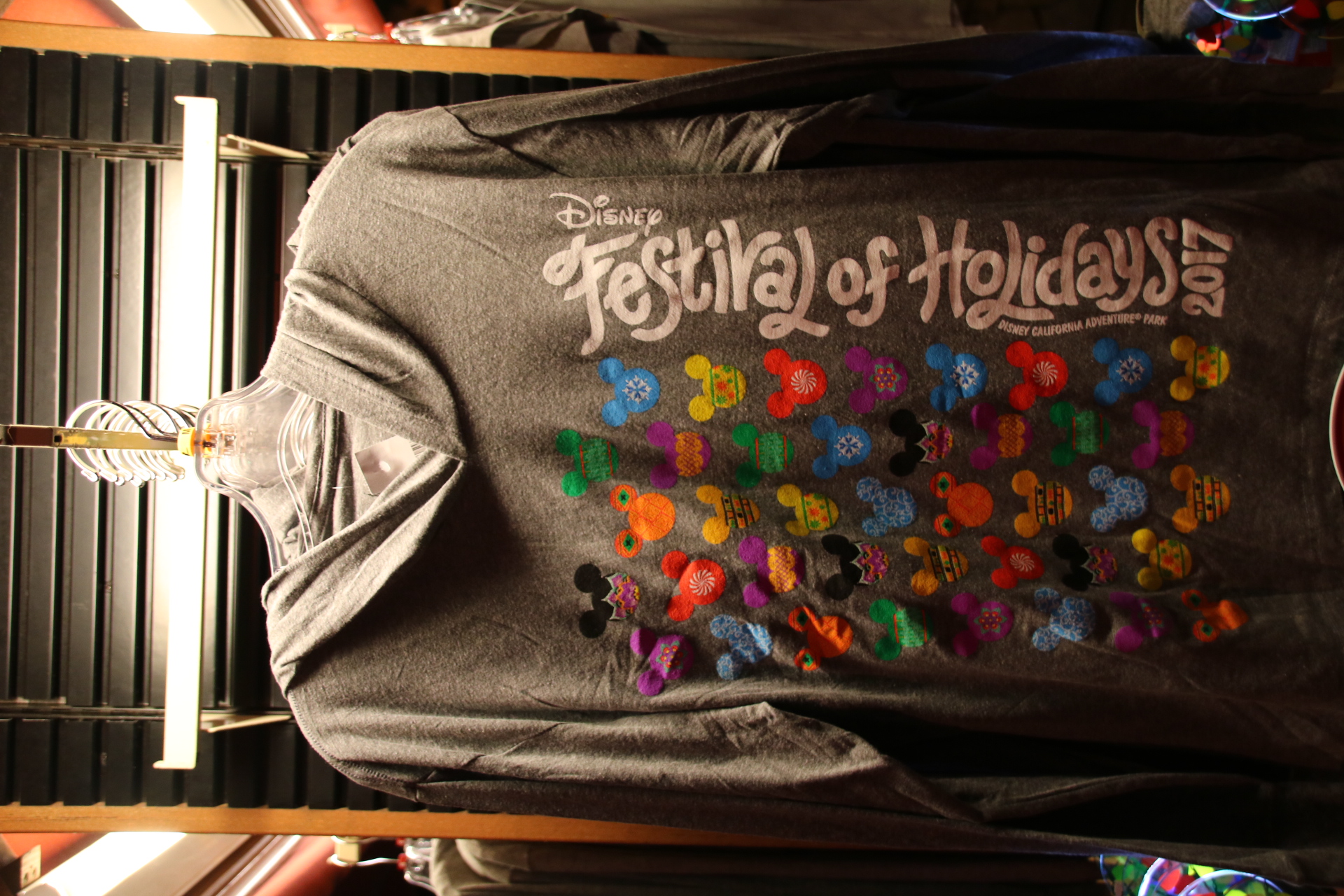 To me, the design resembles patterened glass ornaments, and I love the simplicity of them in the Mickey Mouse shape. There aren’t too many items available, some apparel and a couple of kitchen pieces. There is also a themed gift card that is attached to a wrist foil key chain, for easy food purchasing.